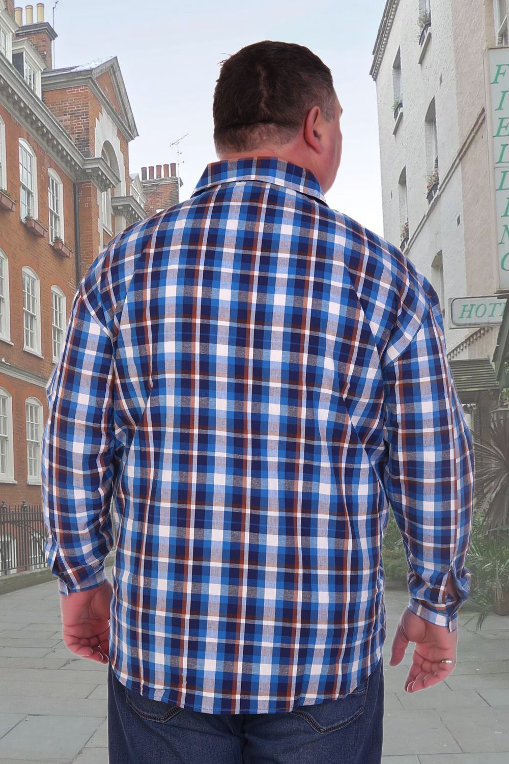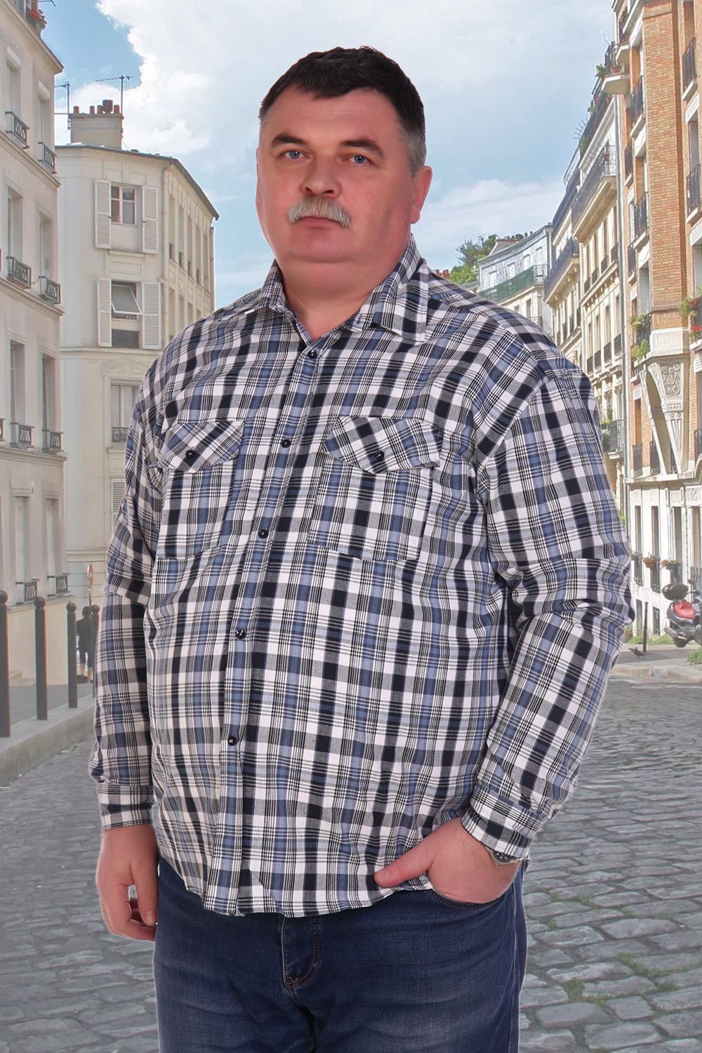 Мужская рубашка в клетку с длинным рукавом. Ткань шотландка 100% хлопок. Модель классического кроя дополнена двумя накладными карманами на груди плюс два клапана с пуговицей. Ворот проложен флизелином с отстрочкой. Данный товар по цвету не подбирается.