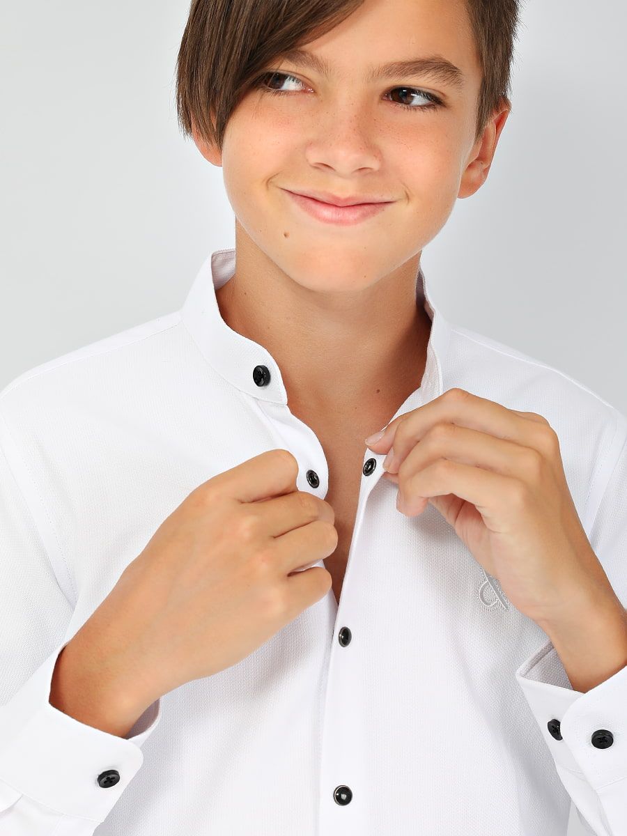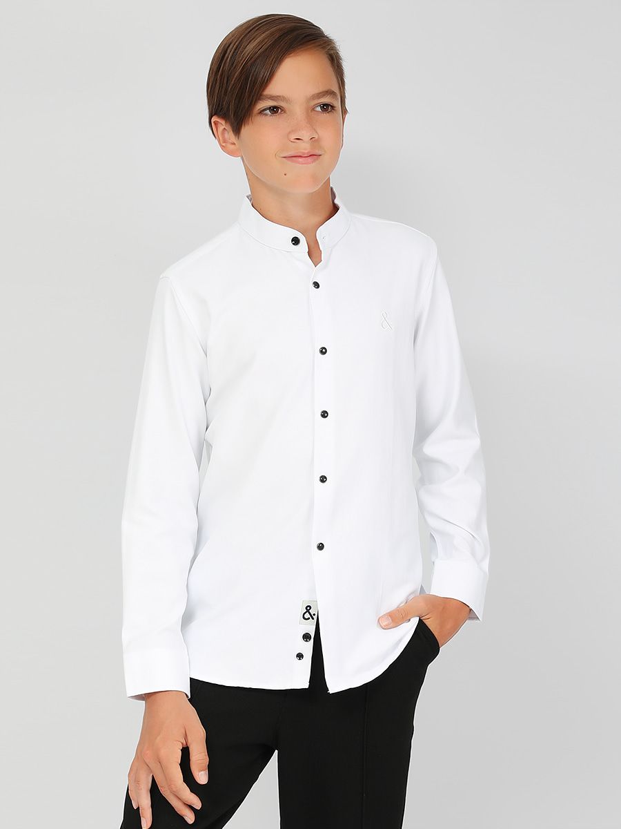 Рубашка для мальчика Соль&Перец приталенного кроя, на кнопках, с воротником-стойкой. Рубашка выполнена из натурального хлопка премиального качества. Рубашка идеально сочетается с брюками любого фасона и подойдет как для школы, так и для торжественного мероприятия.