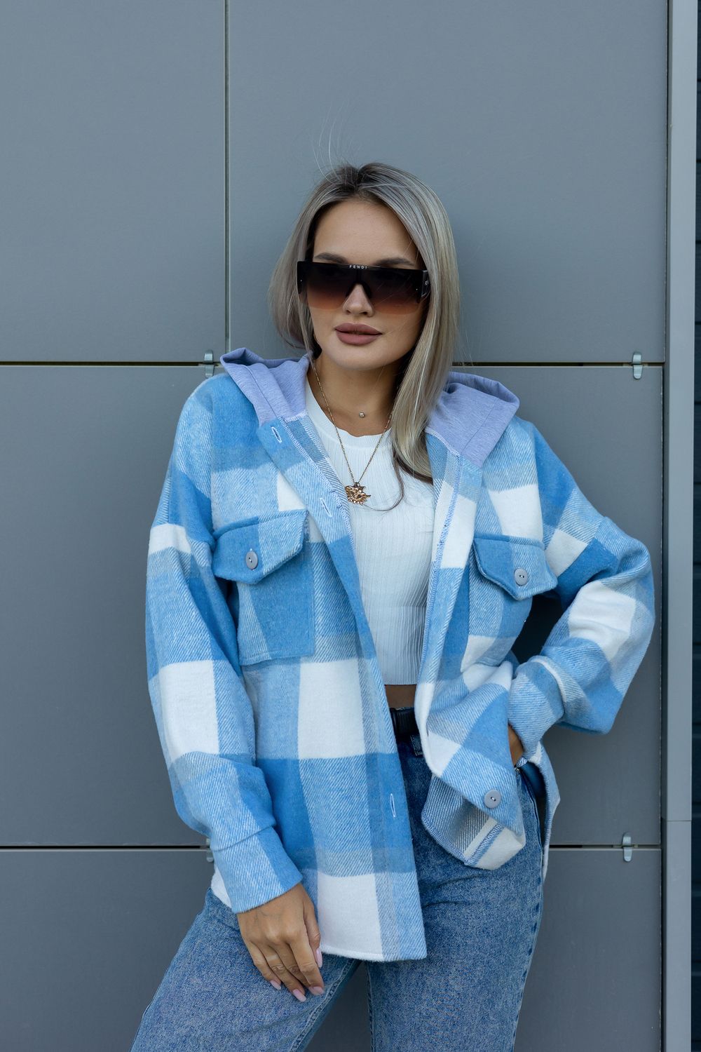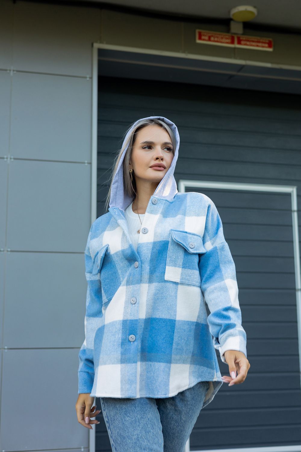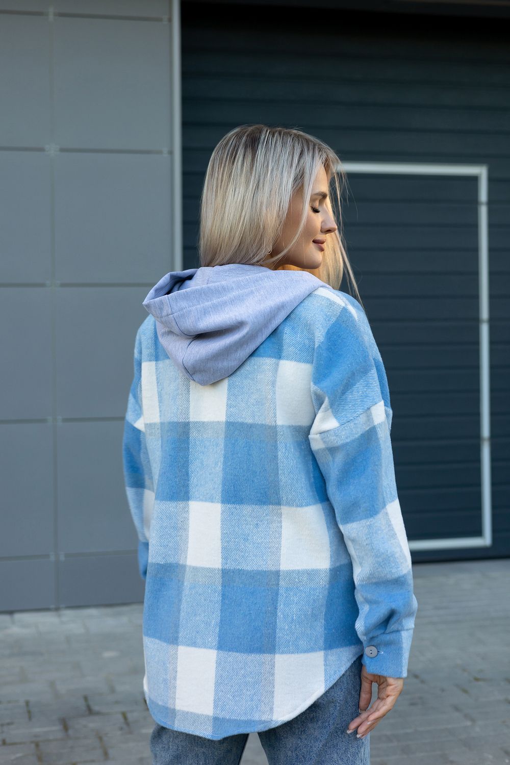 Рубашка женская в клетку с капюшоном РЖКК-01 - голубой