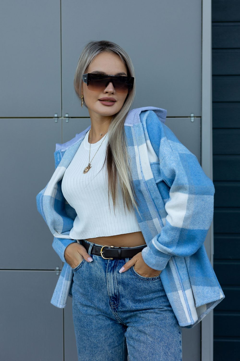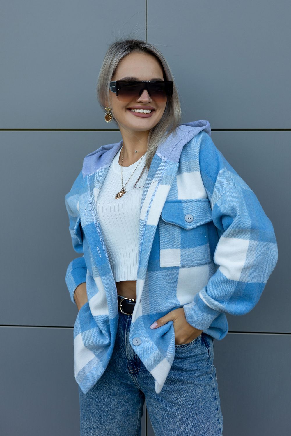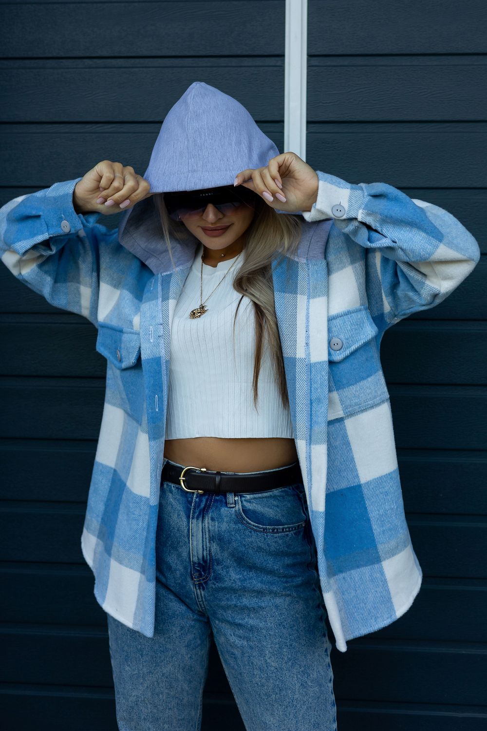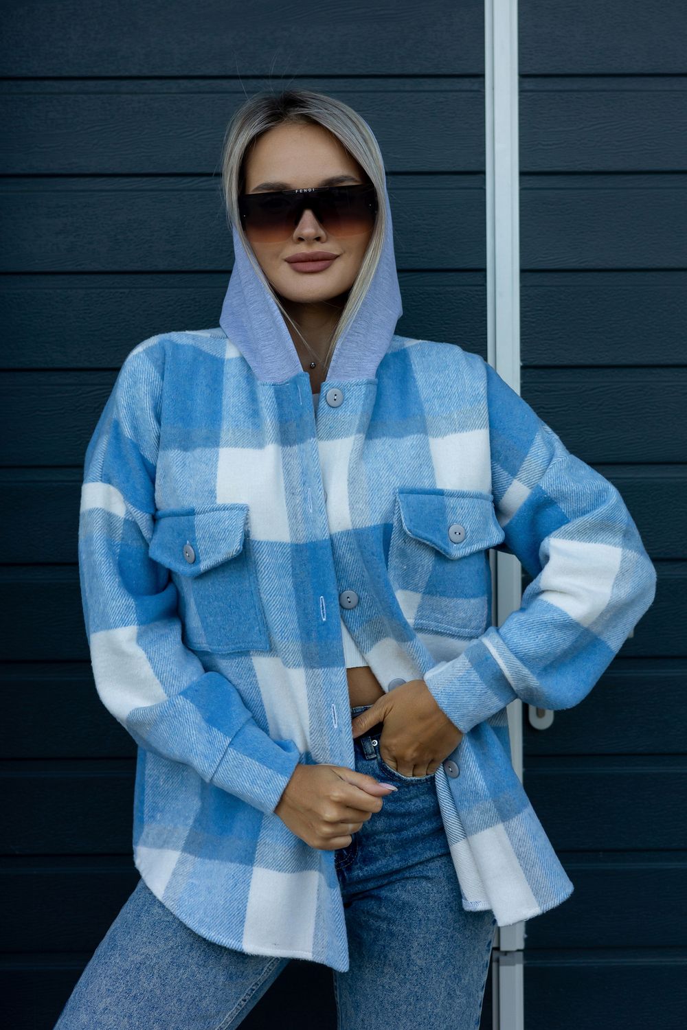 Рубашка женская в клетку с капюшоном РЖКК-01 - голубой