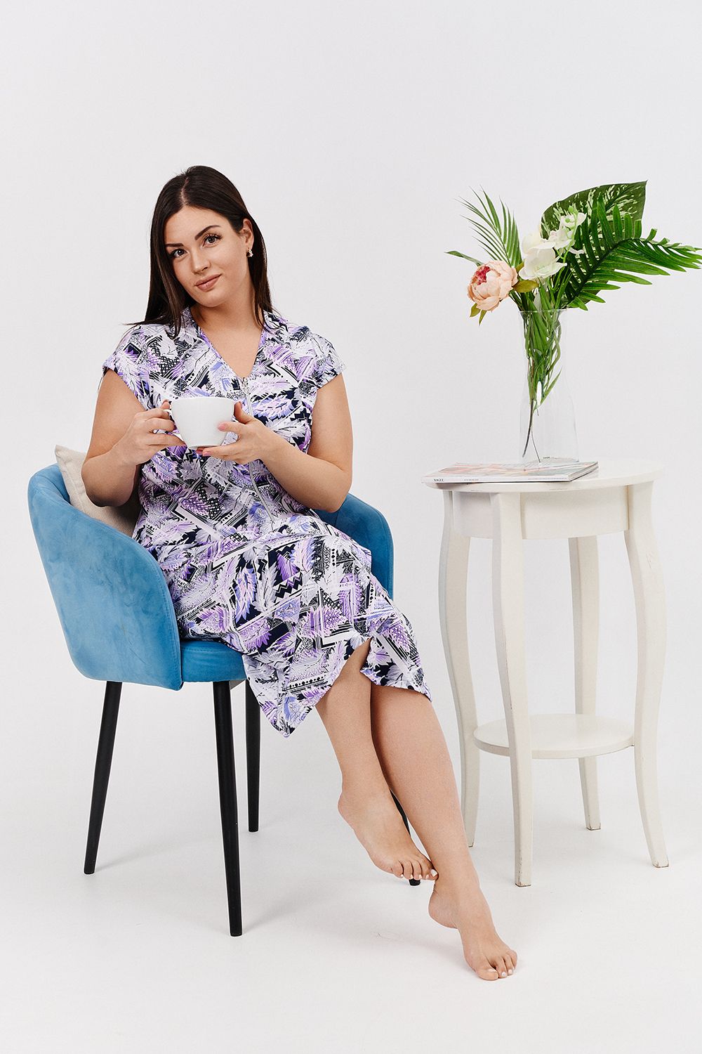 Халат женский оригинальной летней расцветки, выполнен из 100% хлопка. Горловина имеет V-образный вырез, рукав короткий. Халат на серебристой молнии средней длины. Модель очень лёгкая, подойдёт для повседневной носки и отдыха.