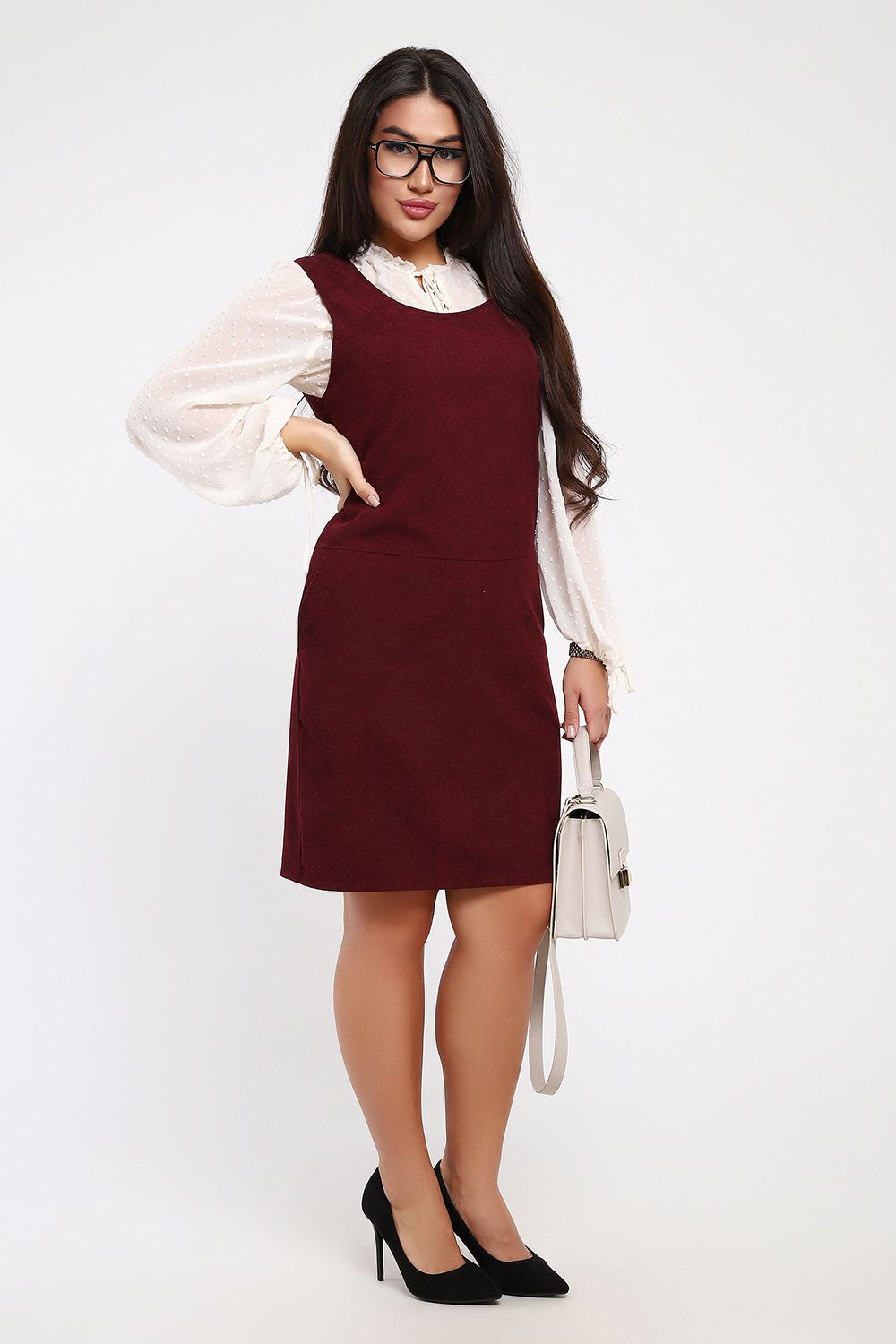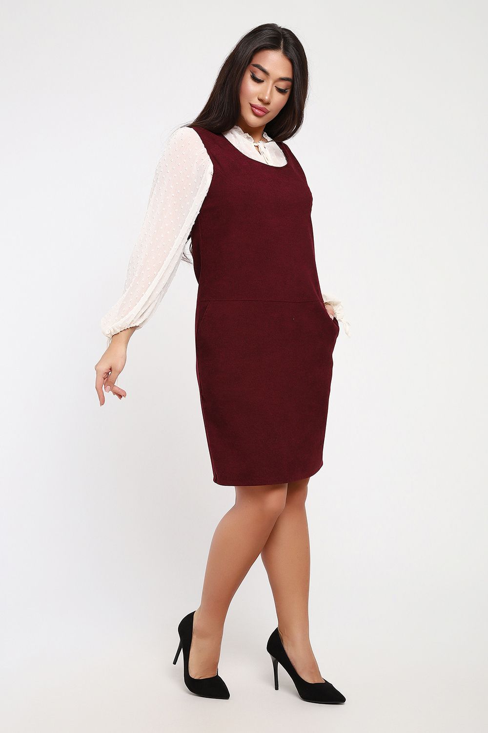 Создайте свой образ с помощью универсального вельветового сарафана. Это может быть и деловой, и повседневный, и праздничный образ, в зависимости от того, какую блузку или рубашку вы к нему подберете. Сарафан выполнен из микровельвета, ткани, очень легкой и простой в уходе. Вельвет не мнется, отлично сохраняет форму и цвет, не электризуется, к нему ничего не липнет. Сарафан прямого кроя, округлая горловина обработана обтачкой, полочка отрезная по линии чуть ниже талии. Глубокая пройма позволит комбинировать сарафан с любой блузкой, водолазкой,лонгсливом. Длина изделия до середины колена при росте 164см. У модели на фото рост 170см. По бокам нижней части полочки расположены внутренние карманы. Данная модель универсальна и подойдет на любую фигуру, скроет недостатки и подчеркнет достоинства. В офисе, на работе, на прогулке в этом сарафане вы будете чувствовать себя уверенно и комфортно.