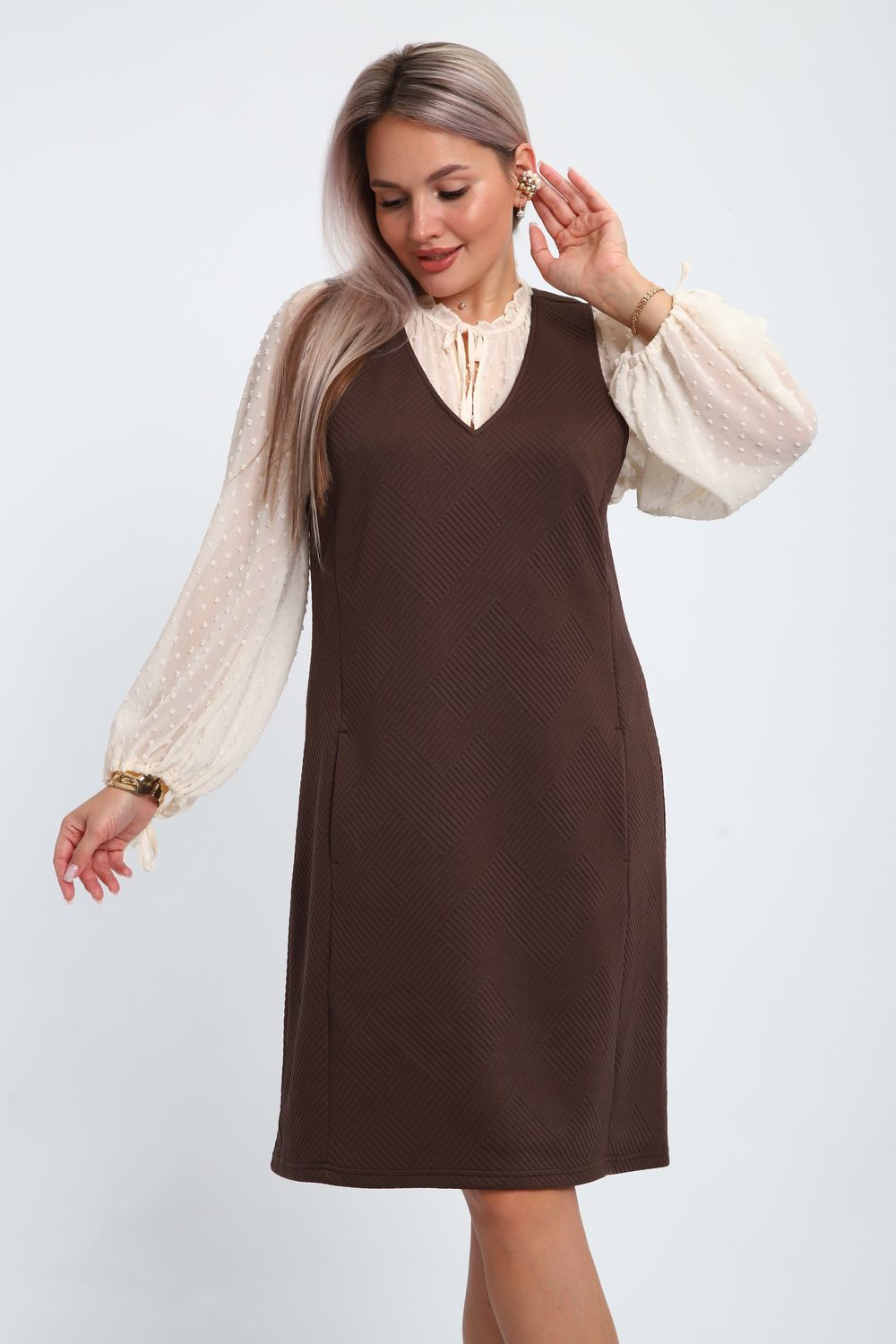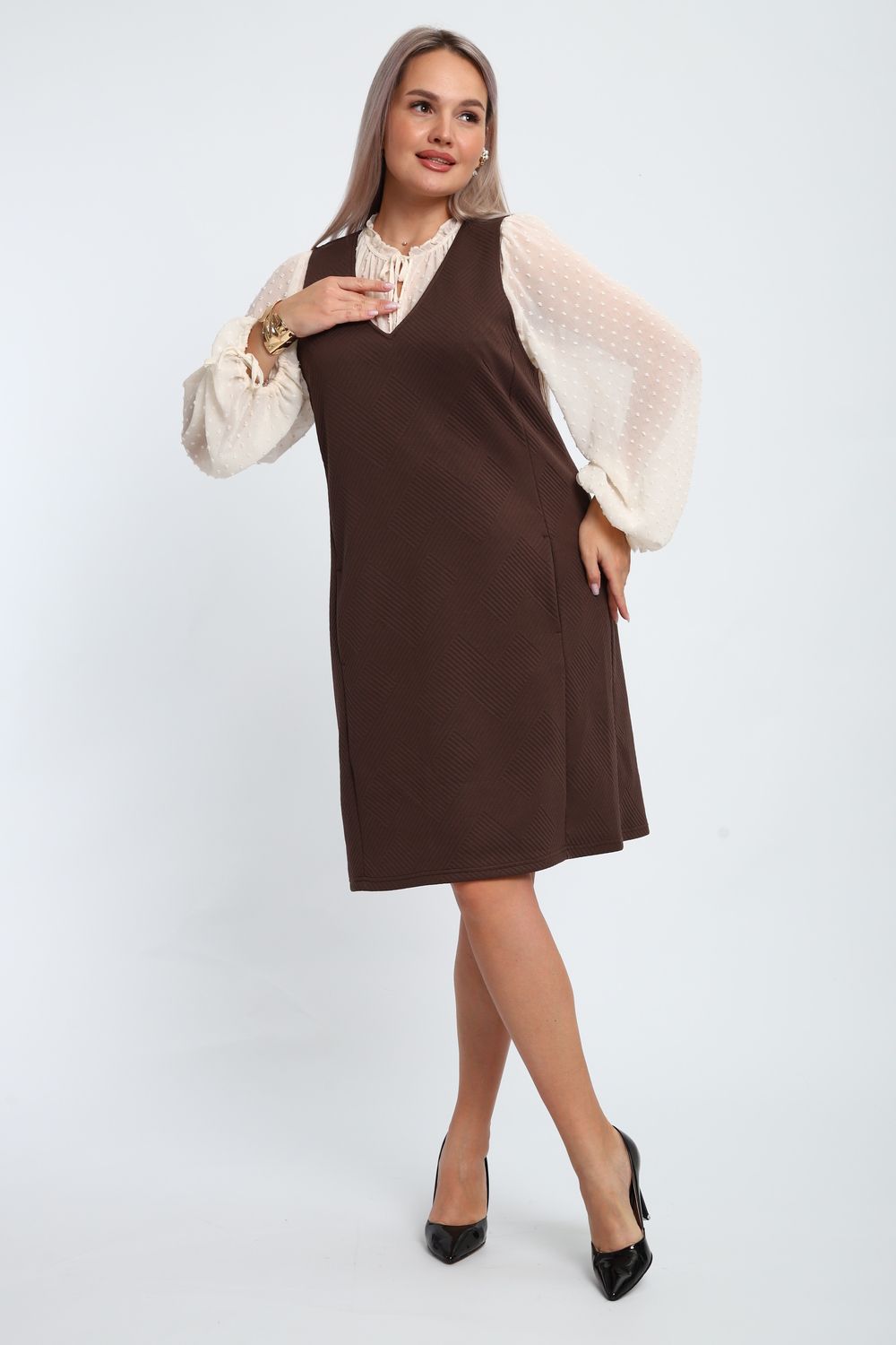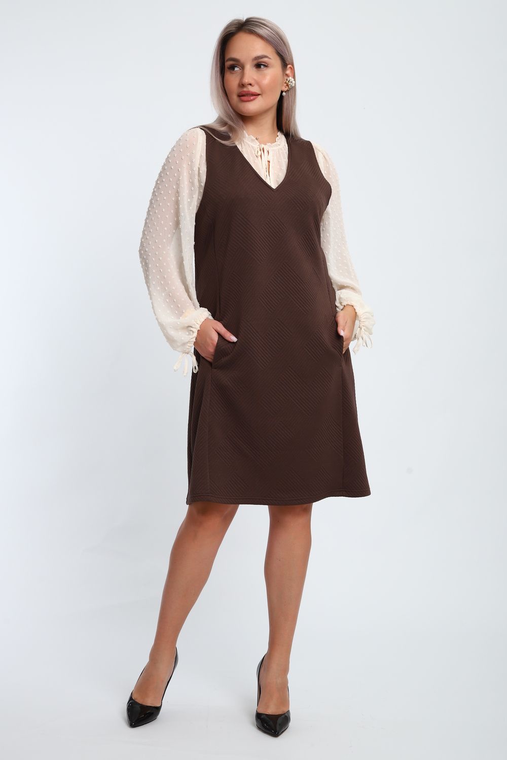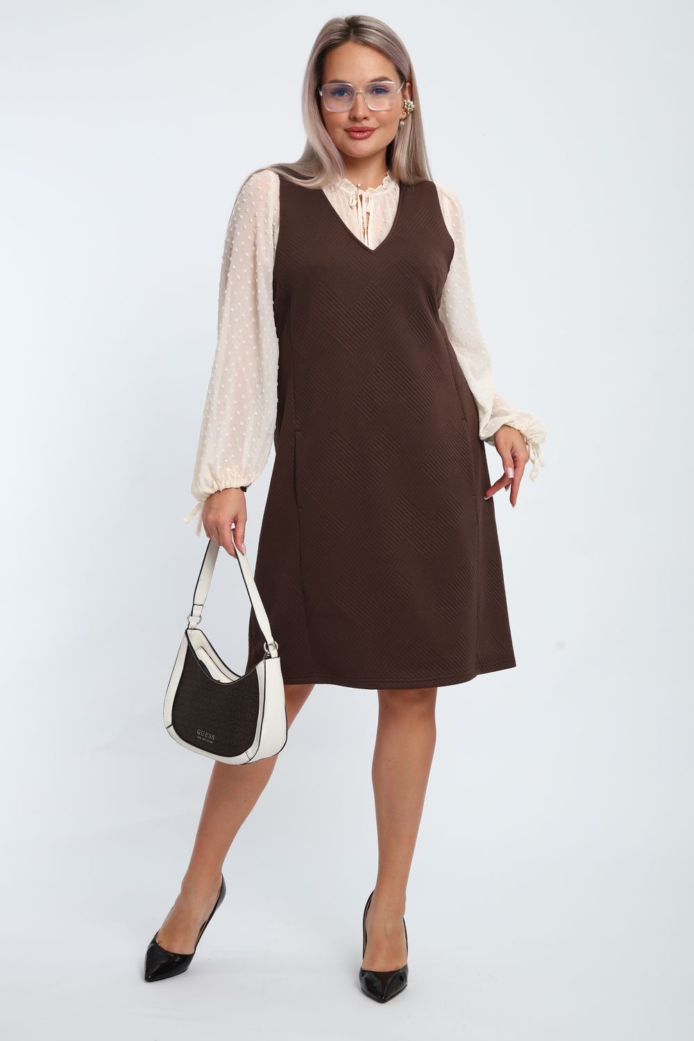 Создайте свой неповторимый образ с помощью универсального сарафана, к которому можно подобрать разнообразные блузки, водолазки, свитшоты. Сарафан прямого кроя, слегка притален, благодаря отрезному бочку, аккуратная V-образная горловина обработана обтачкой, в швах притачивания бочков имеются внутренние карманы. Пройма достаточно глубокая, чтобы не стеснять рукав блузки, длина до середины колена. Лаконичность деталей кроя подчеркивает стиль и элегантность изделия. Свободный крой сарафана и воздухопроницаемость ткани обеспечивают комфорт и свободу движения, что делает его идеальным для повседневного ношения. Модная геометрическая рельефная фактура ткани придает изделию стильный и современный образ. Базовые расцветки сарафана помогут с легкостью подобрать к нему пару. На работе, в офисе, на прогулке, на празднике вы будете чувствовать себя комфортно и уверенно.
