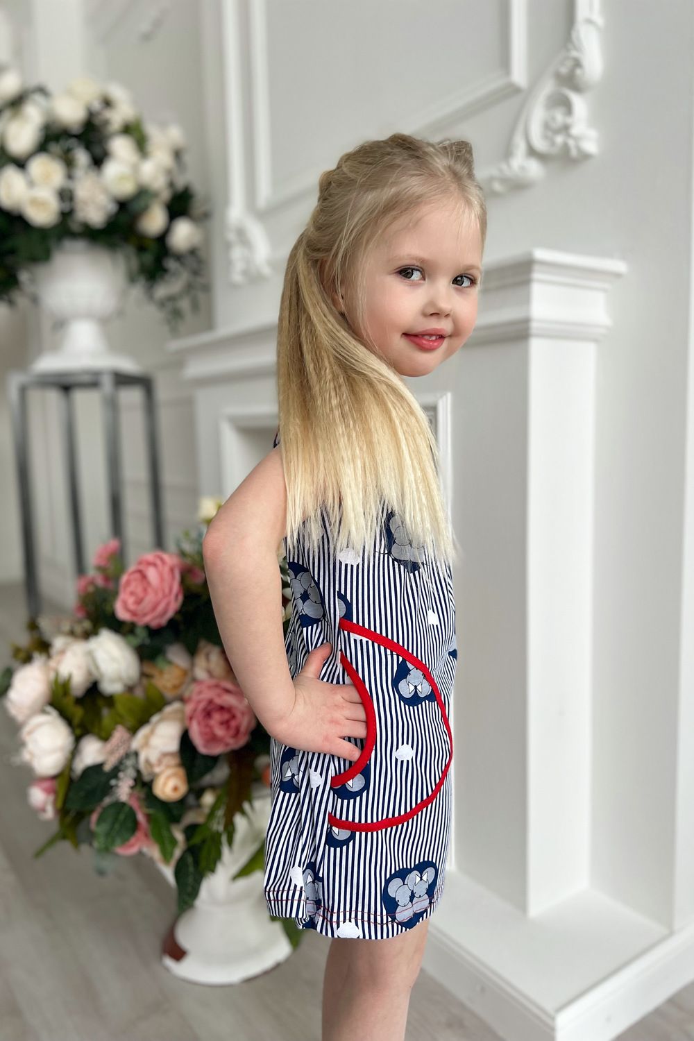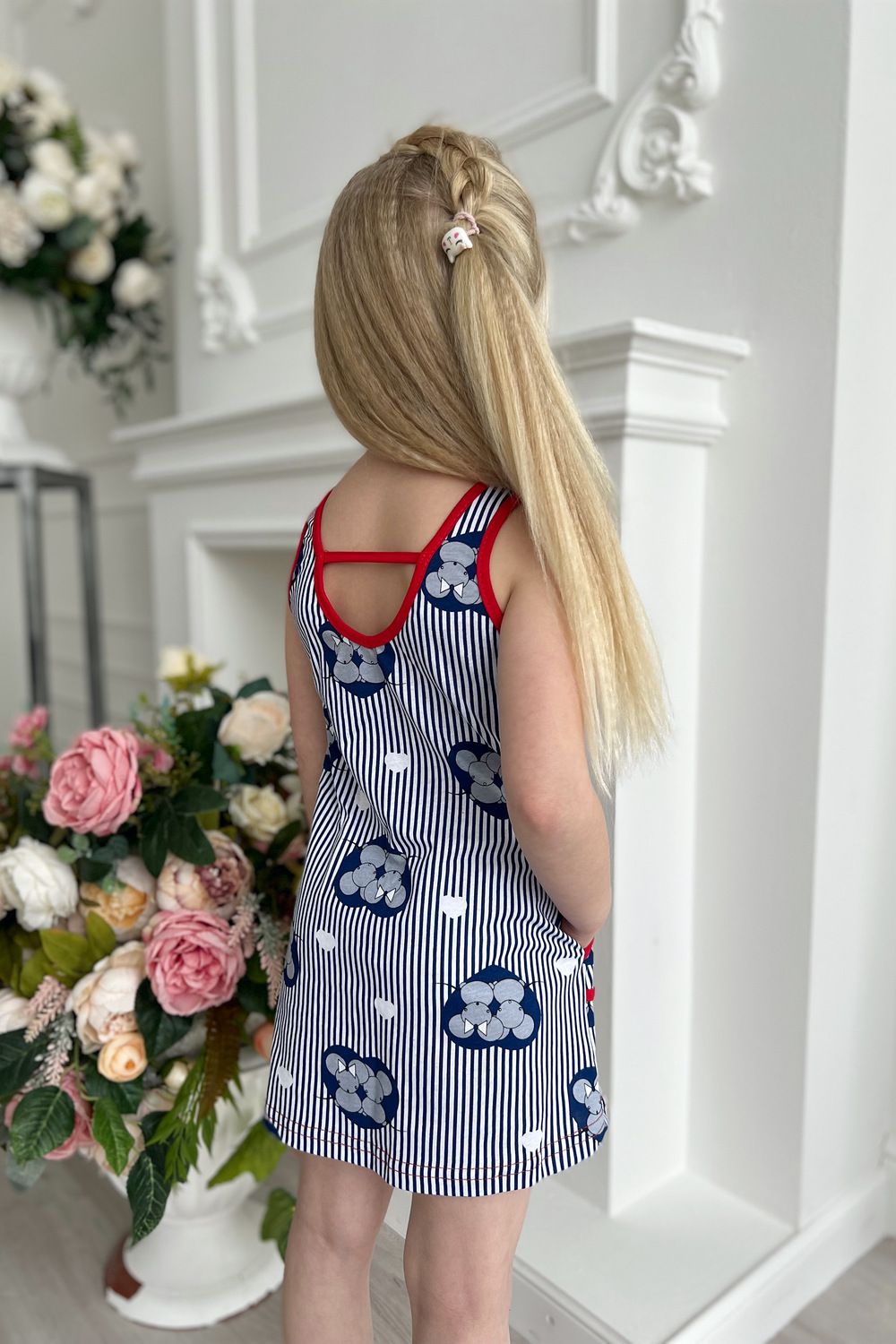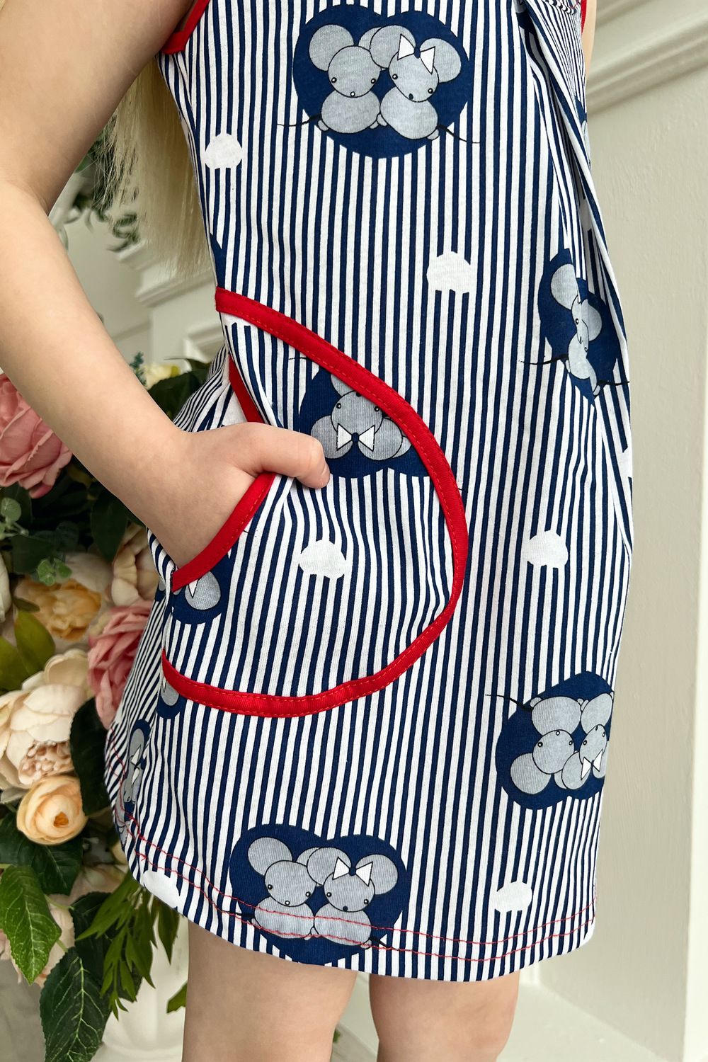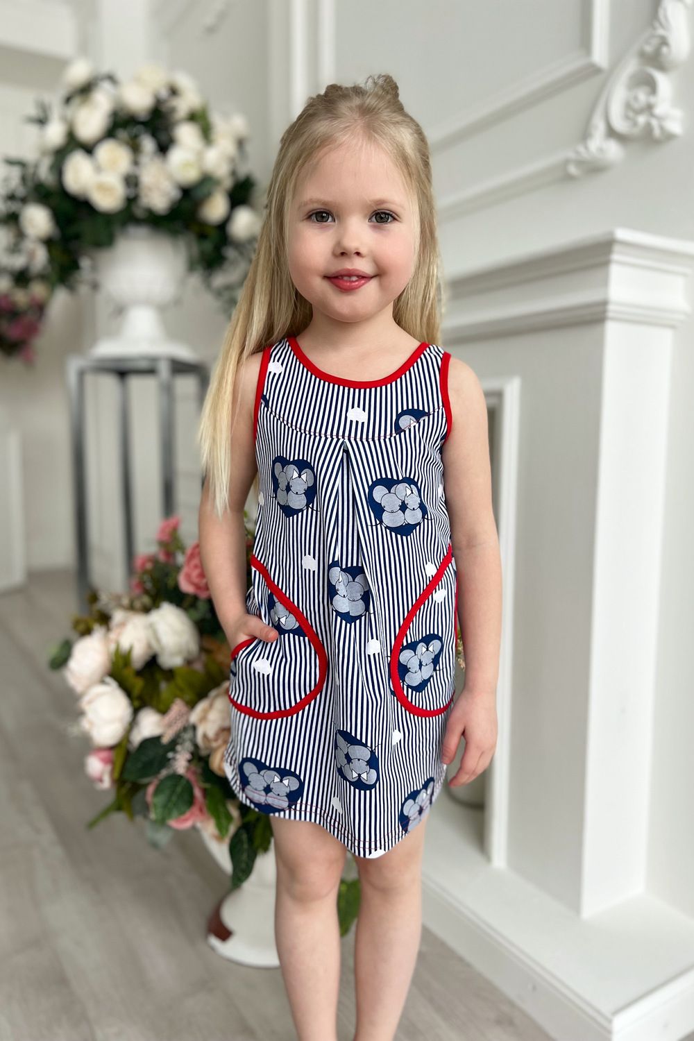 Платье детское с отрезной кокеткой, встречной складочкой, двумя боковыми кармашками, по спинке округлый вырез с перемычкой.