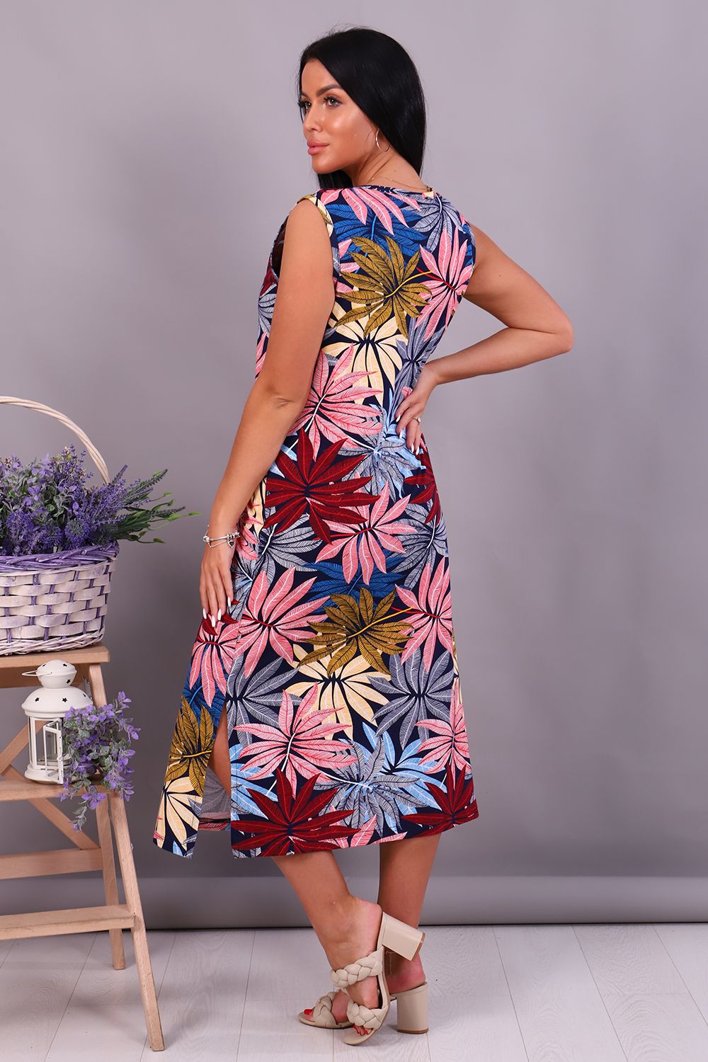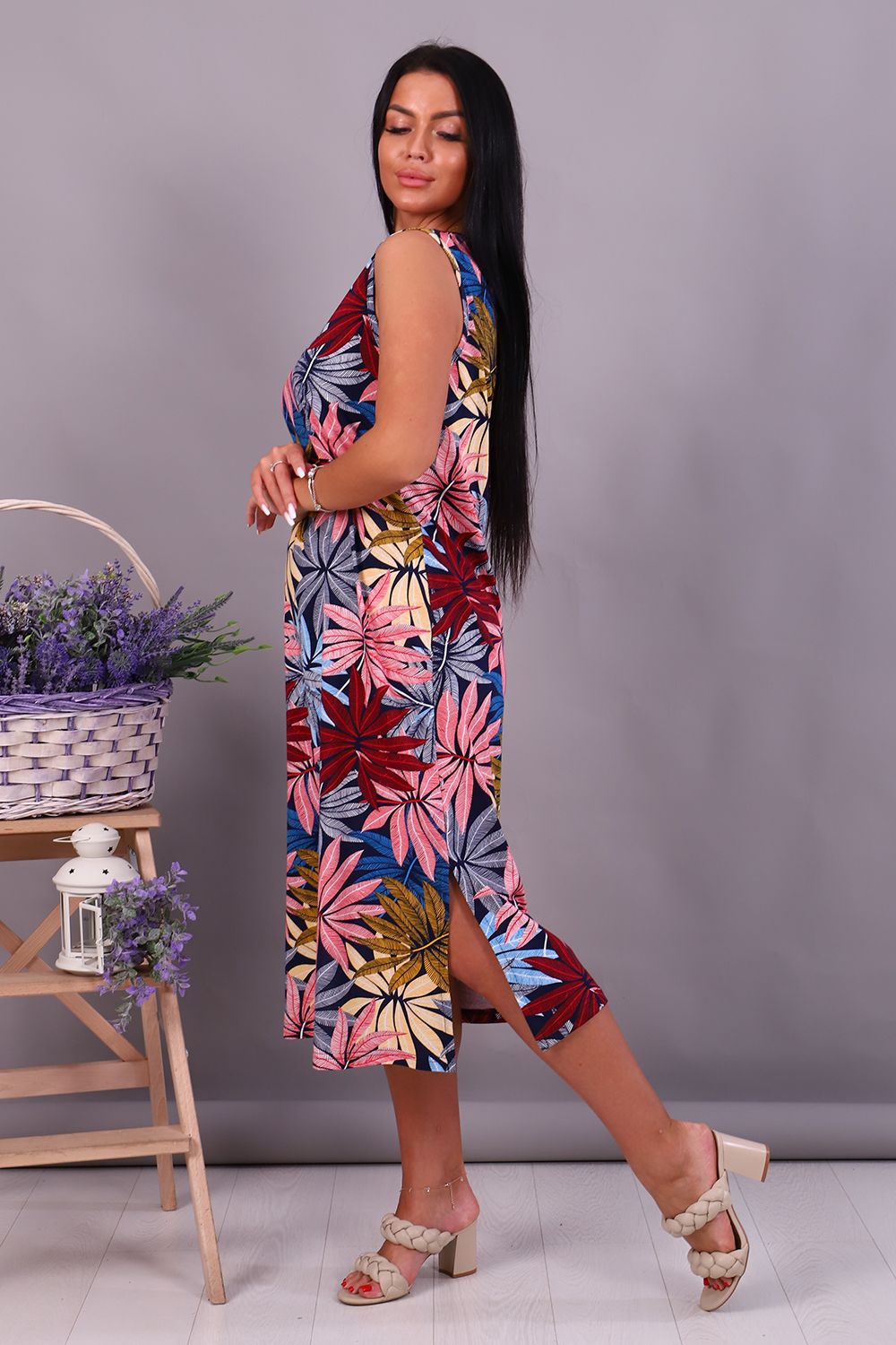 Женское платье-сарафан прямого силуэта из трикотажного полотна (100% хлопок). Горловина и пройма отделана окантовочной беей в цвет изделия. Внизу по боковым швам разрезы. Длина изделия ниже колена. Удобный сарафан, приятный к телу, не стесняет движения, подойдет беременным. Яркие стойкие цвета ткани. Большие размеры широкий размерный ряд 44-62. Для дома и дачи, для отдыха и прогулок, в отпуск, на море.