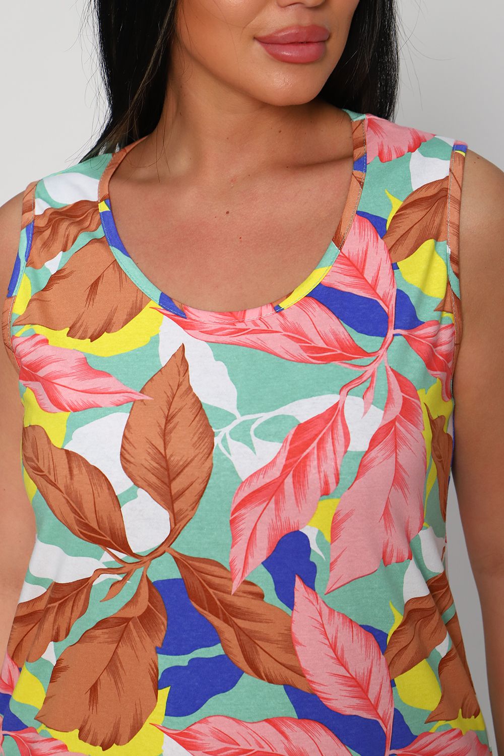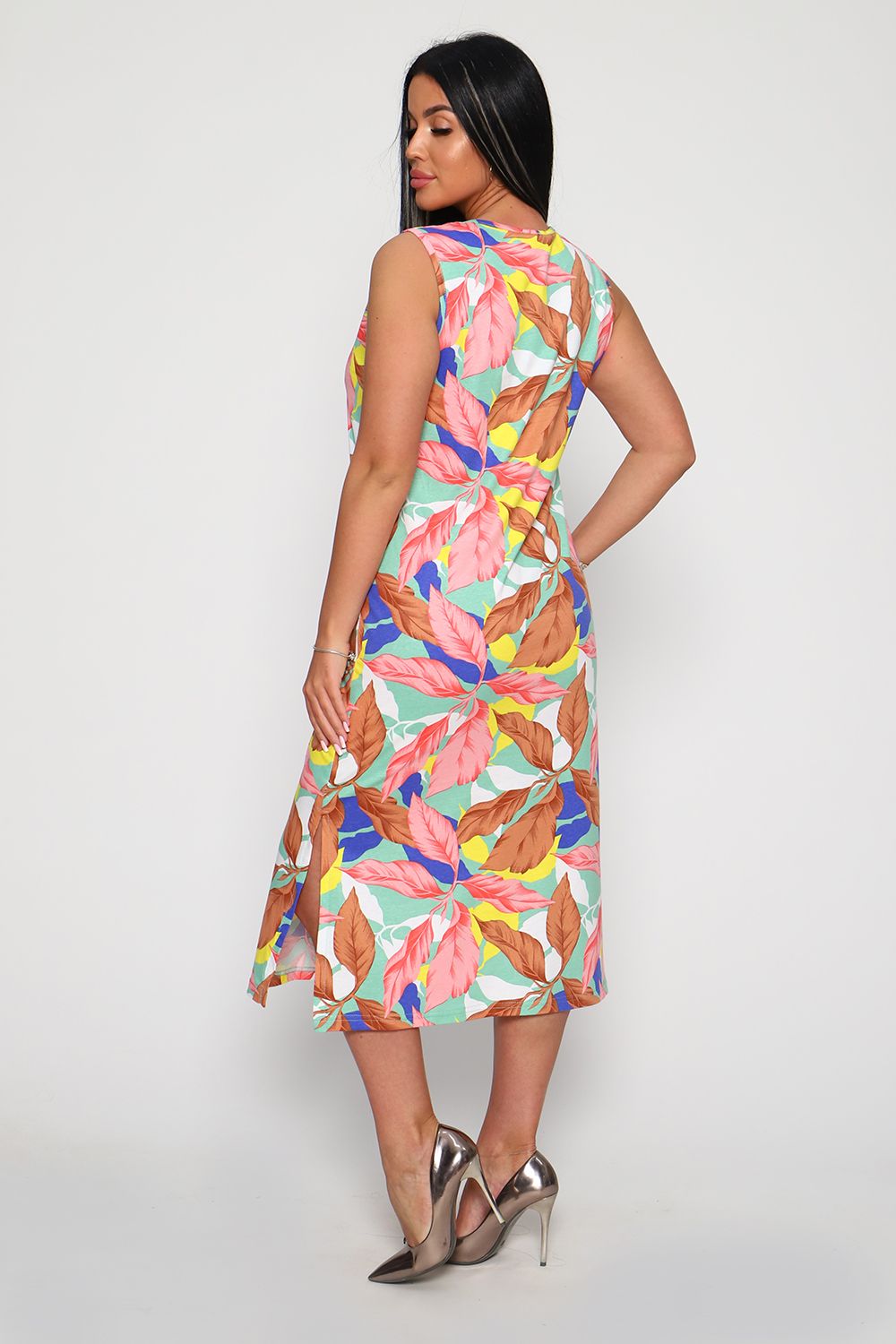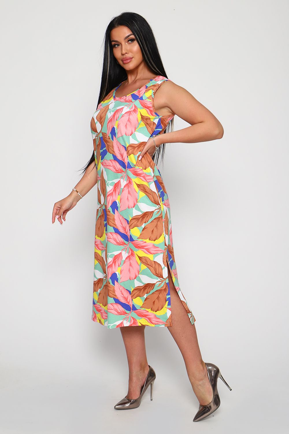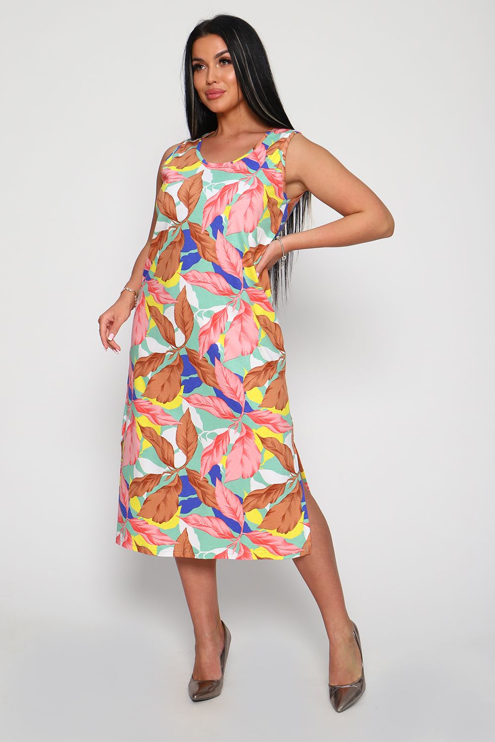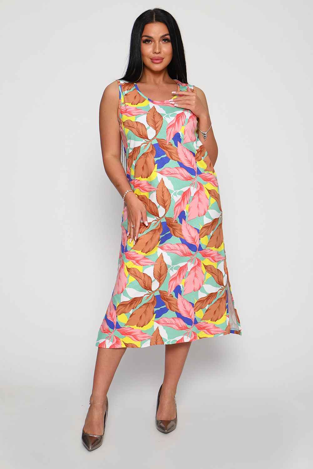 Женское платье - сарафан прямого силуэта из трикотажного полотна (100% хлопок). Горловина и пройма отделана окантовочной беей в цвет изделия. Внизу по боковым швам разрезы. Длина изделия ниже колена. Удобный сарафан, приятный к телу, не стесняет движения, подойдет беременным. Яркие стойкие цвета ткани. Большие размеры широкий размерный ряд 44-62. Для дома и дачи, для отдыха и прогулок, в отпуск, на море.
