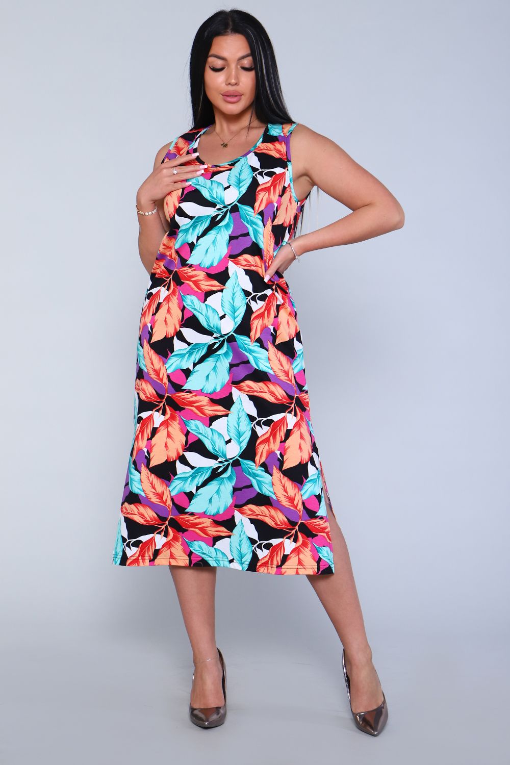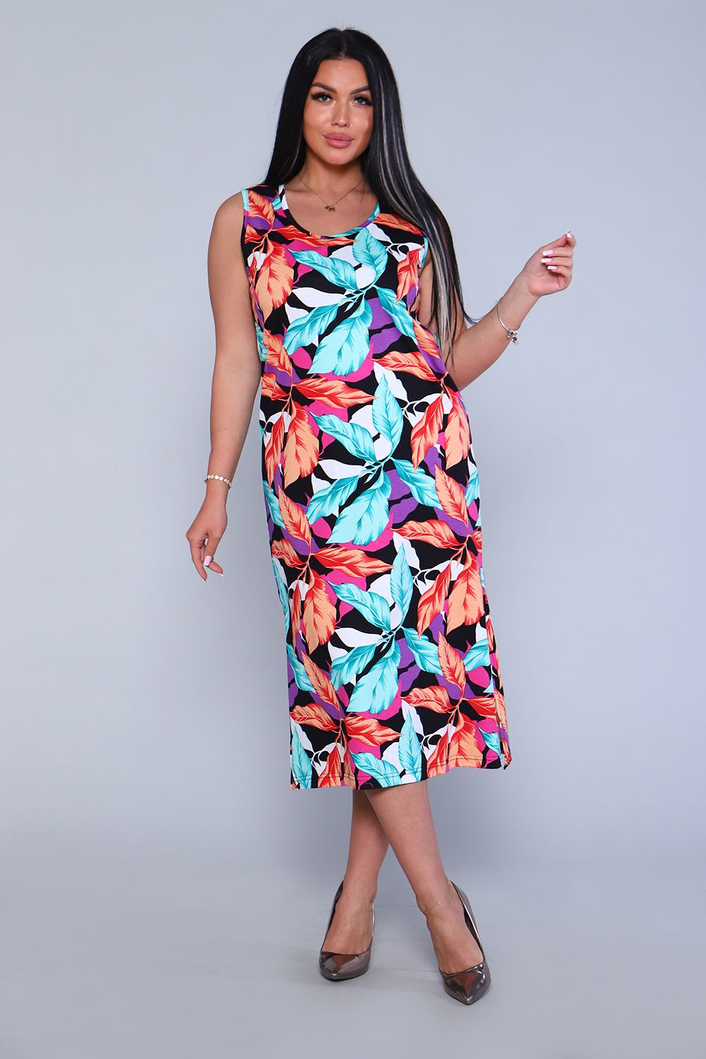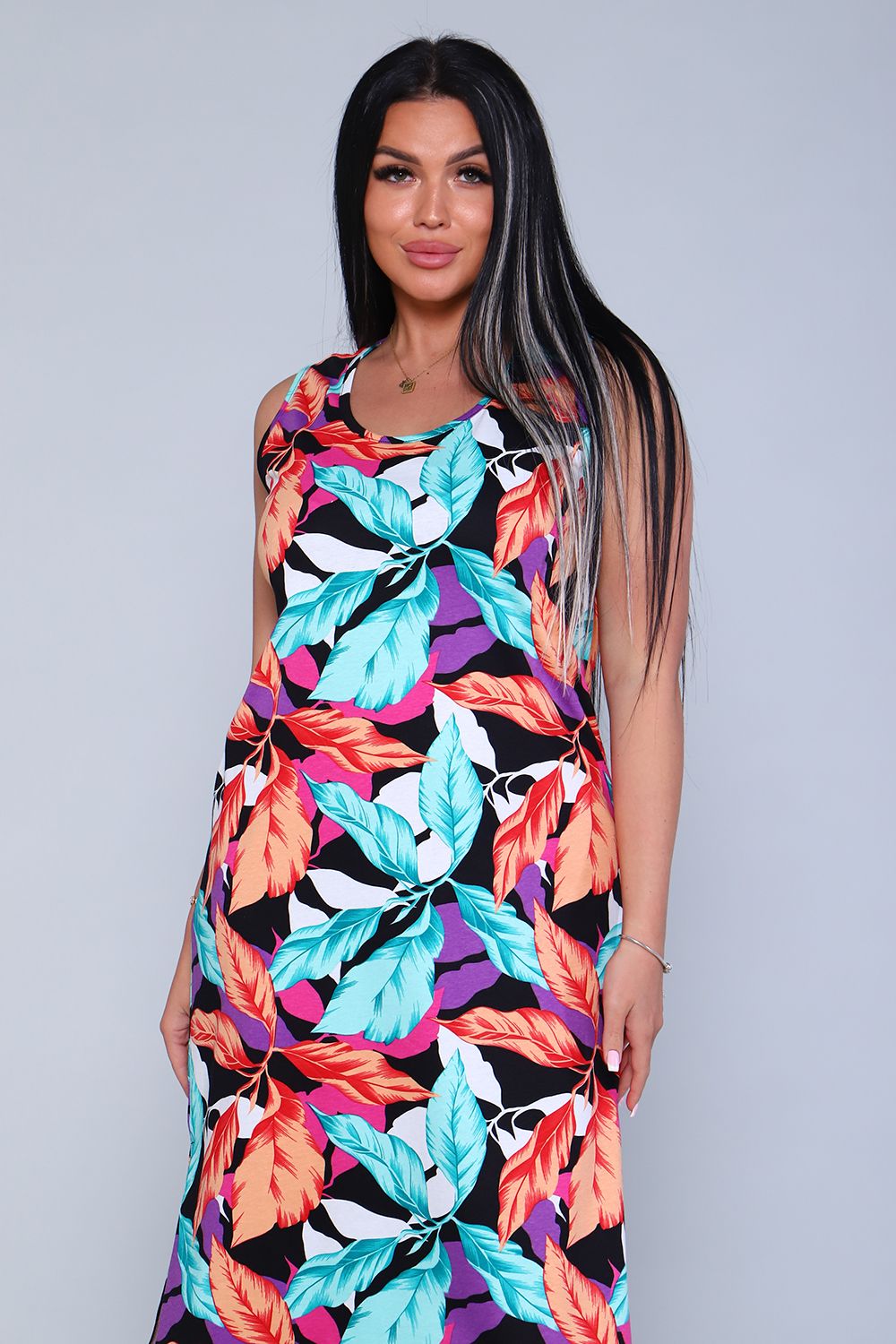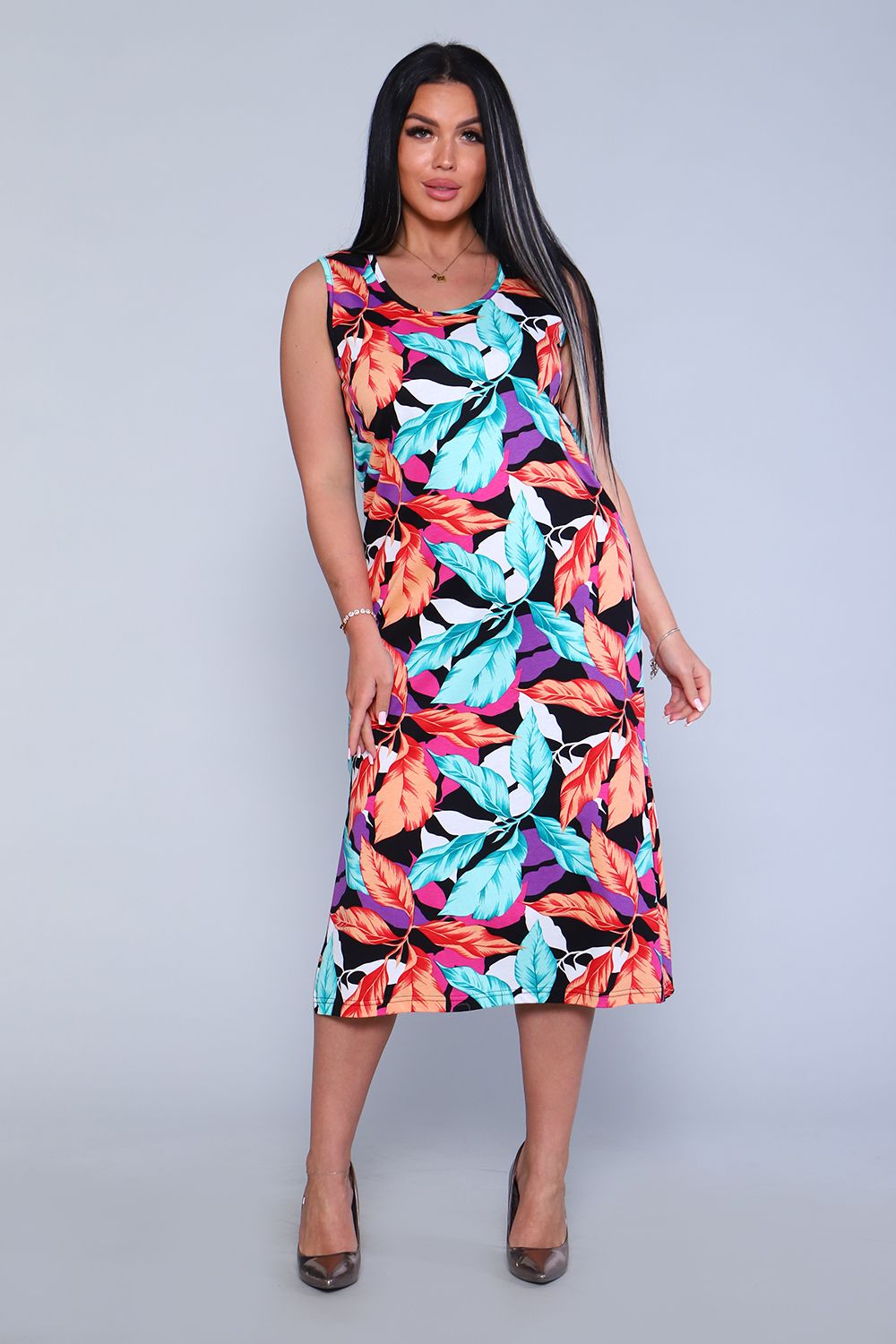 Женское платье - сарафан прямого силуэта из трикотажного полотна (100% хлопок). Горловина и пройма отделана окантовочной беей в цвет изделия. Внизу по боковым швам разрезы. Длина изделия ниже колена. Удобный сарафан, приятный к телу, не стесняет движения, подойдет беременным. Яркие стойкие цвета ткани. Большие размеры широкий размерный ряд 44-62. Для дома и дачи, для отдыха и прогулок, в отпуск, на море.