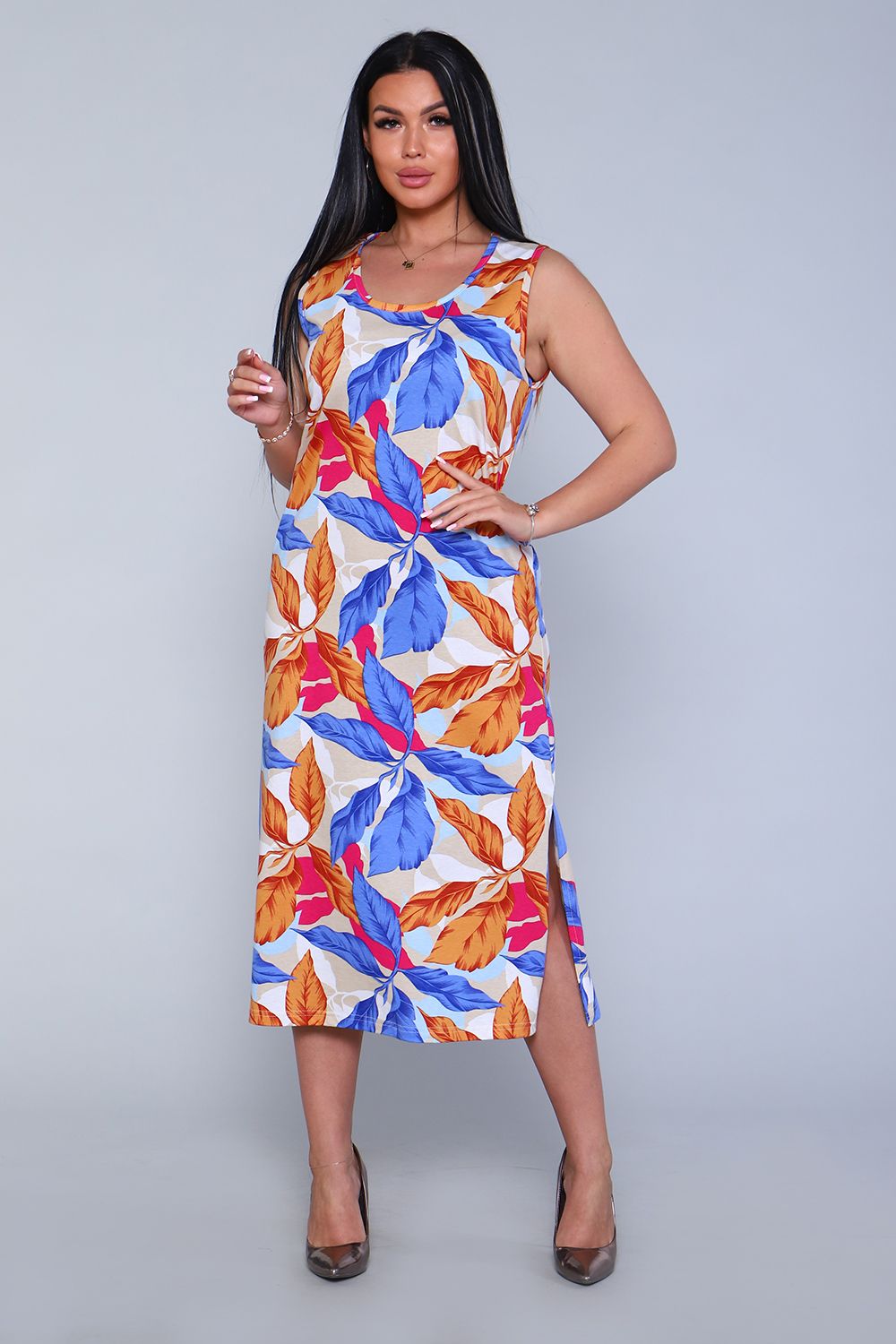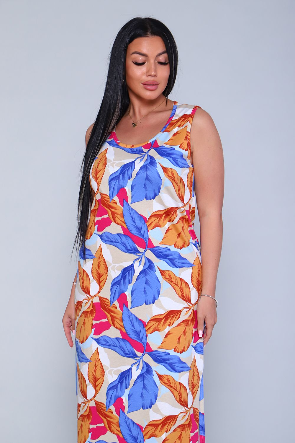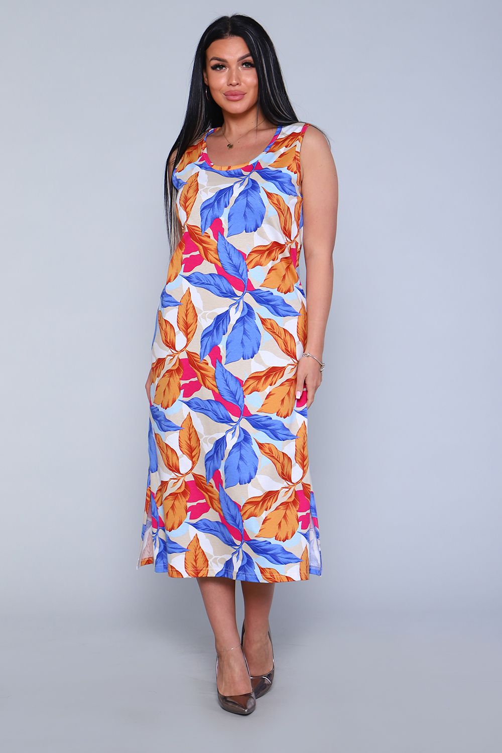 Женское платье - сарафан прямого силуэта из трикотажного полотна (100% хлопок). Горловина и пройма отделана окантовочной беей в цвет изделия. Внизу по боковым швам разрезы. Длина изделия ниже колена. Удобный сарафан, приятный к телу, не стесняет движения, подойдет беременным. Яркие стойкие цвета ткани. Большие размеры широкий размерный ряд 44-62. Для дома и дачи, для отдыха и прогулок, в отпуск, на море.