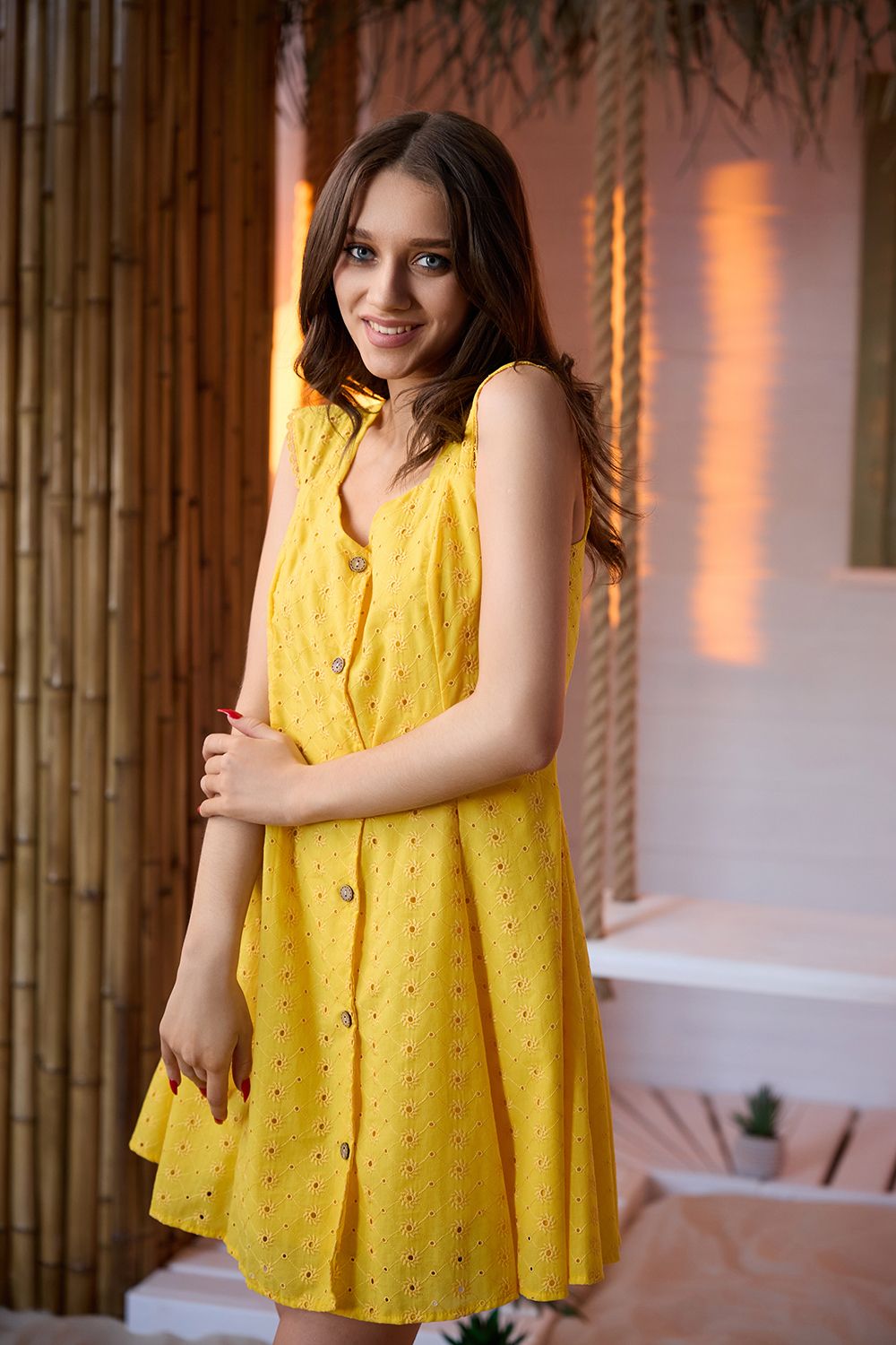 Сарафан приталенный, расклешенный к низу, на бретелях, с V-образной горловиной спереди, длиной выше колена. Застежка на пуговицы. Внутри сарафан на хлопковой подкладке, благодаря которой верхний слой ткани не просвечивает