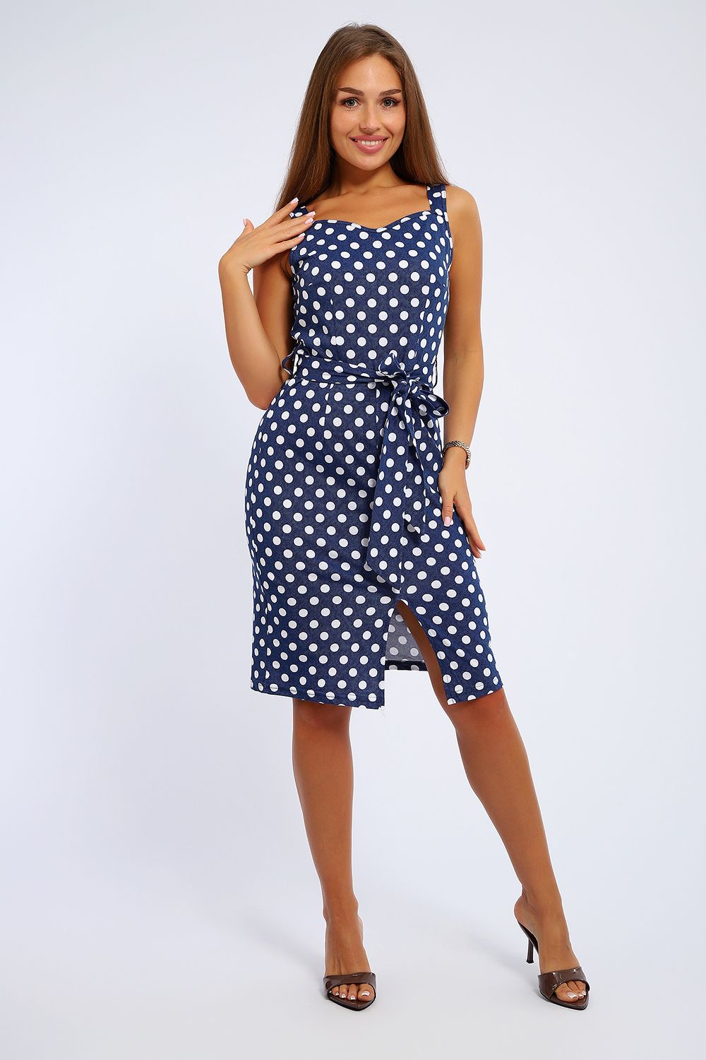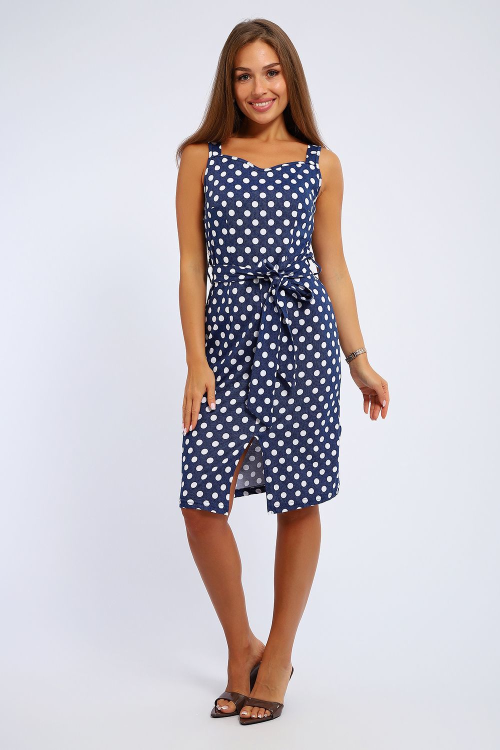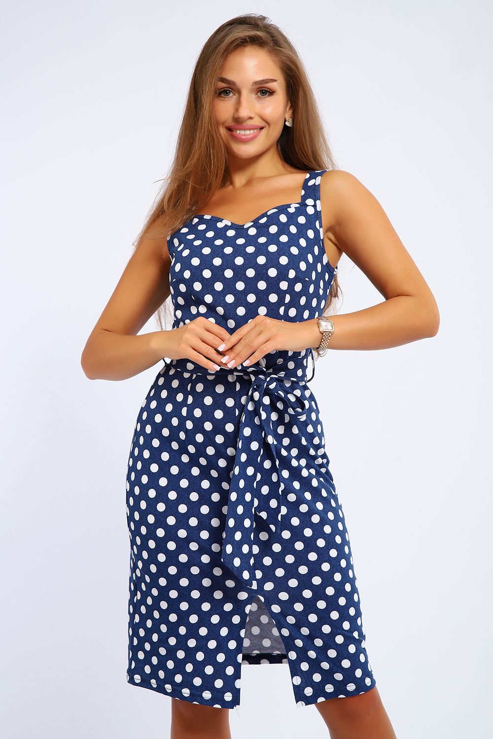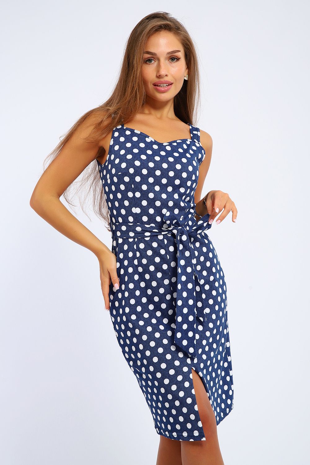 Сарафан женский 100% хлопок, длиной чуть ниже колен на тонких бретелях с отрезным лифом. На уровне талии по бокам расположены шлевки, в который продет трикотажный пояс, выполненный из основной ткани. Декольте чуть углублено по центру. На подоле по центру небольшой изящный разрез. Платье создает нарядный женственный образ. Прекрасный вариант для мероприятий, вечеринок, прогулок, в офис без строгого дресс-кода, на море, на пляж, в отпуск. Прекрасный подарок для самых любимых!