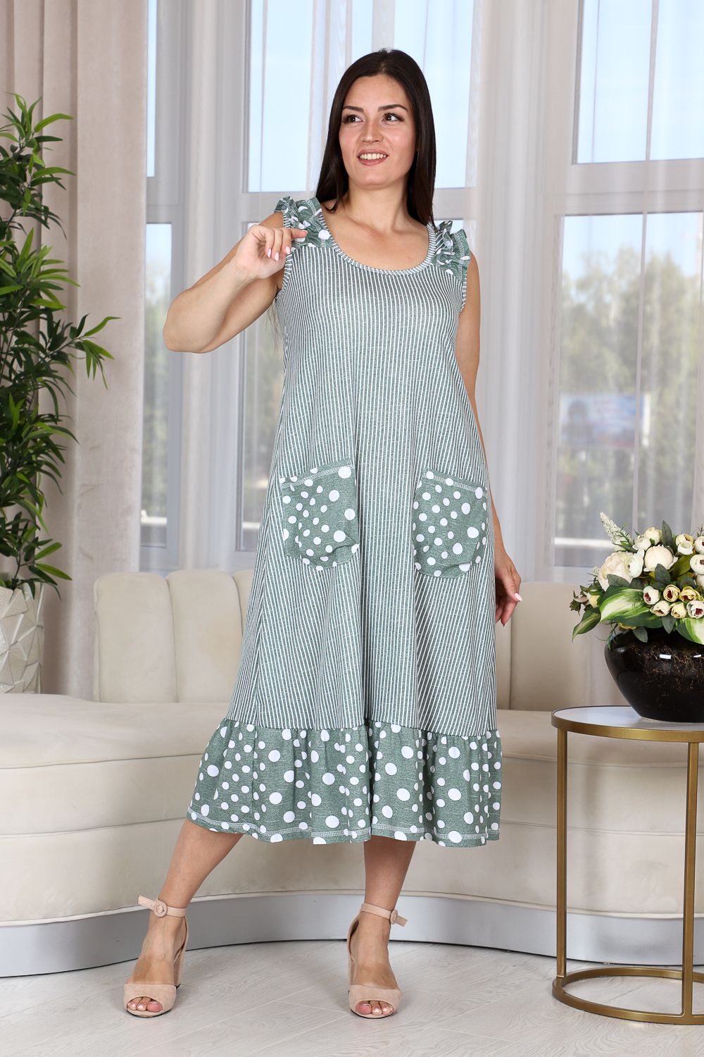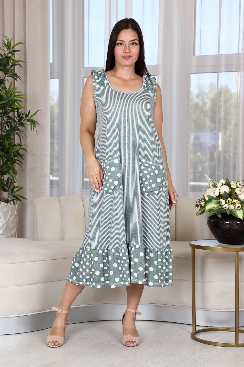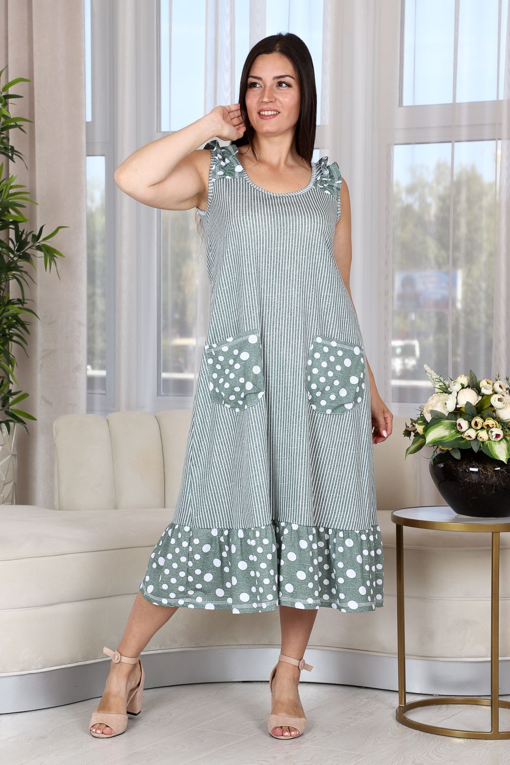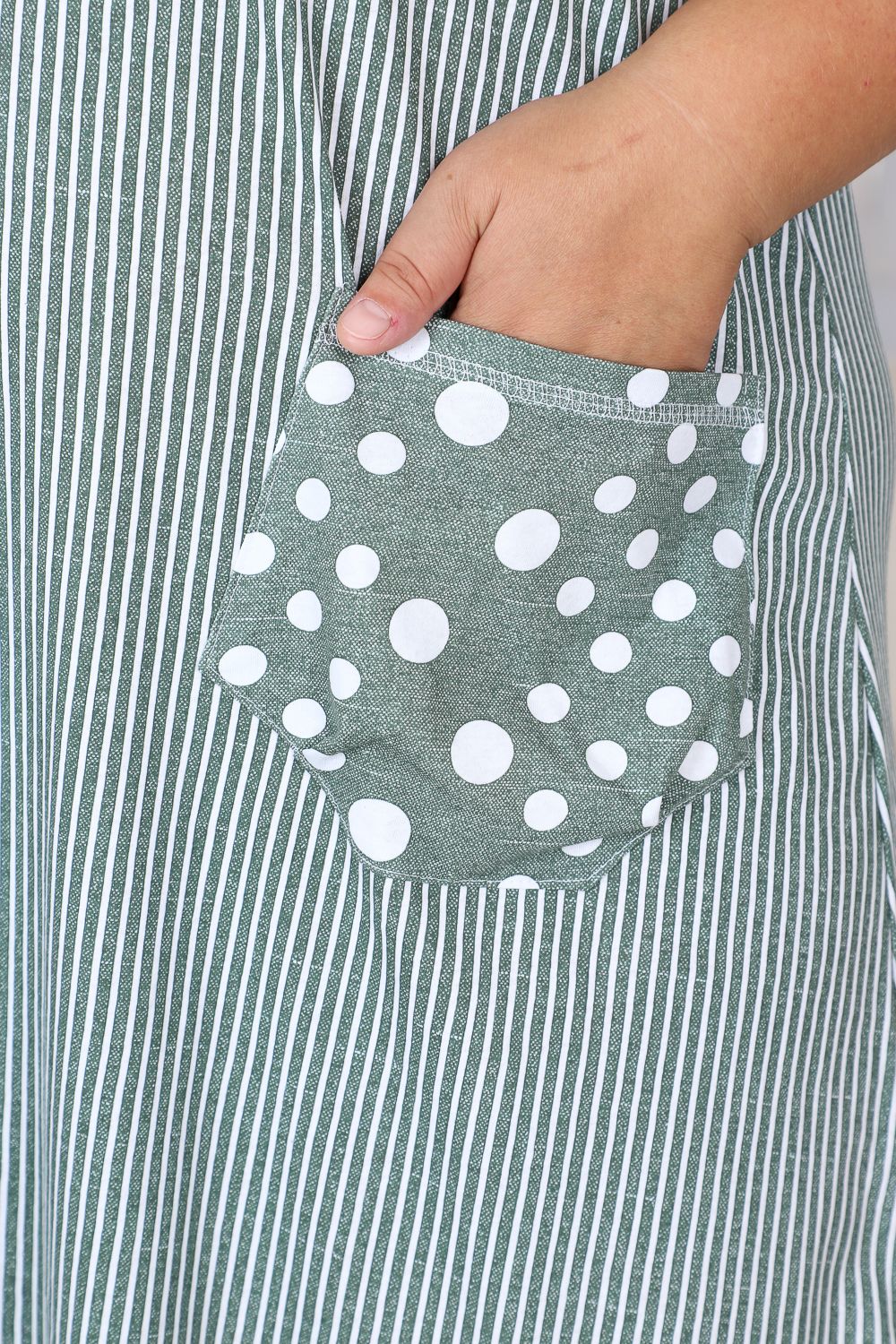 Сарафан женский, слегка расширенный к низу. На полочке два накладных кармана. Сарафан из актуальной сейчас ткани в полоску, а на широких бретелях и по низу изделия рюша в горошек.