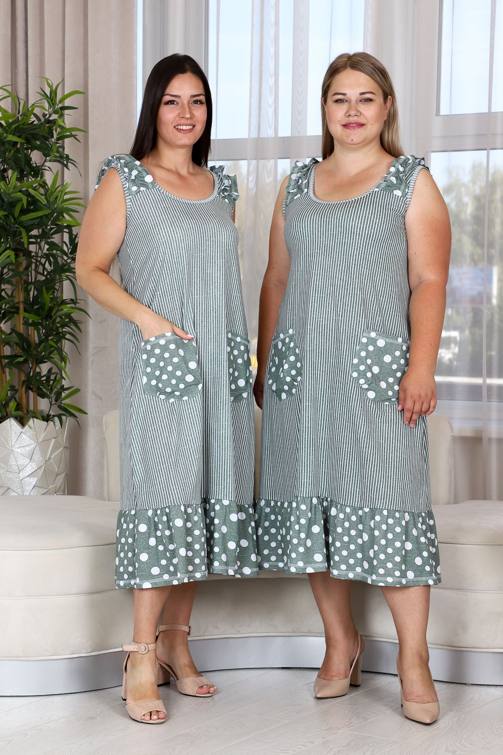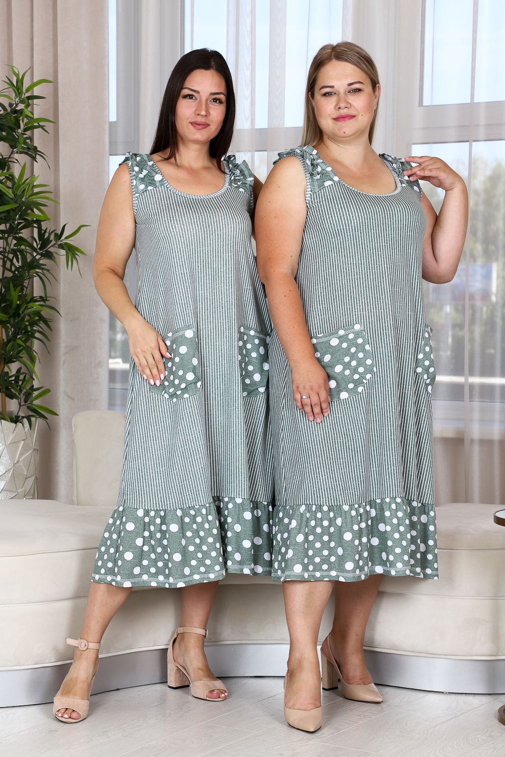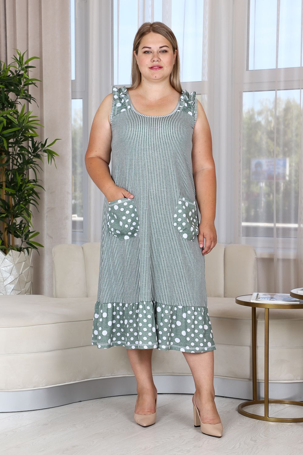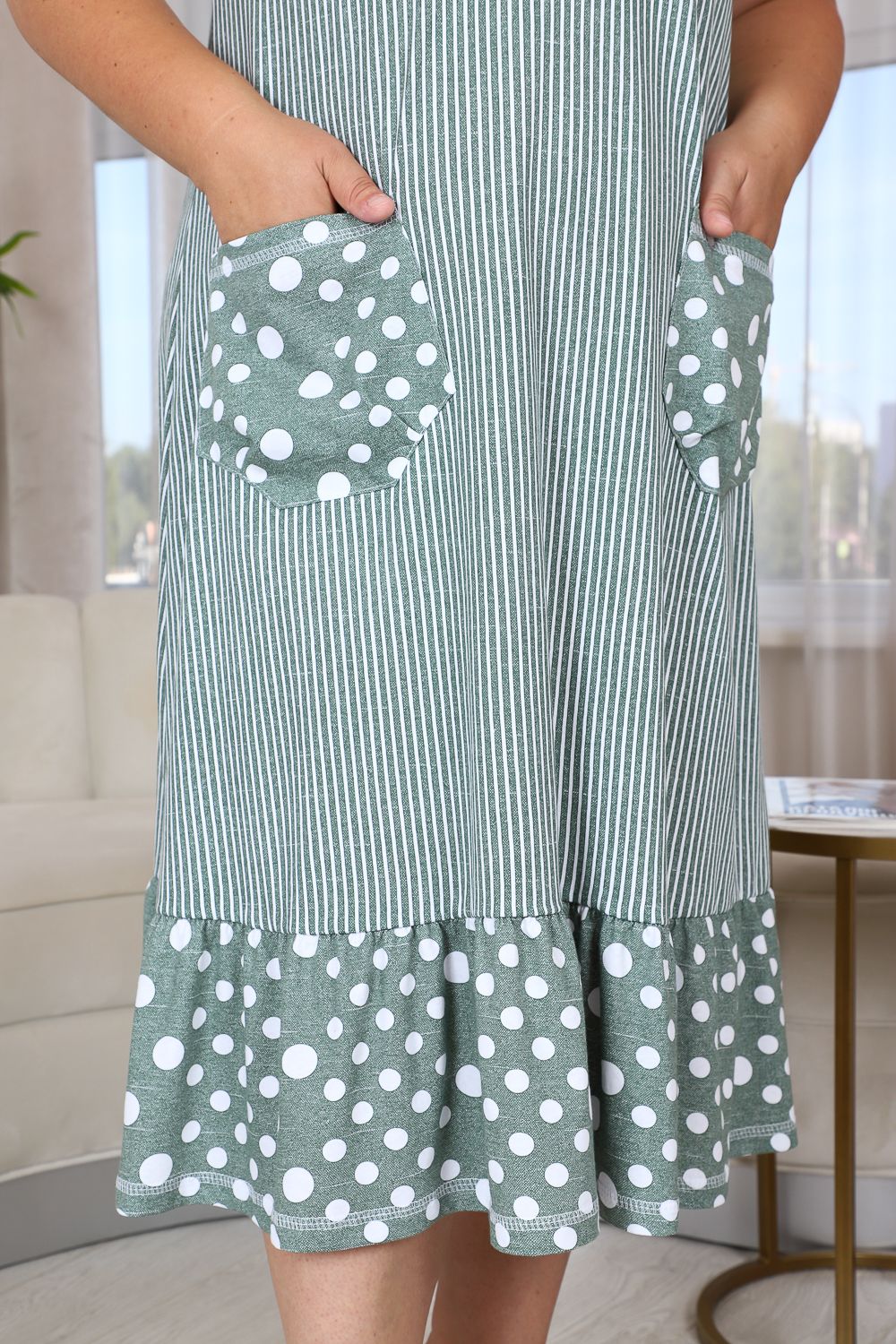 Сарафан женский, слегка расширенный к низу. На полочке два накладных кармана. Сарафан из актуальной сейчас ткани в полоску, а на широких бретелях и по низу изделия рюша в горошек.
