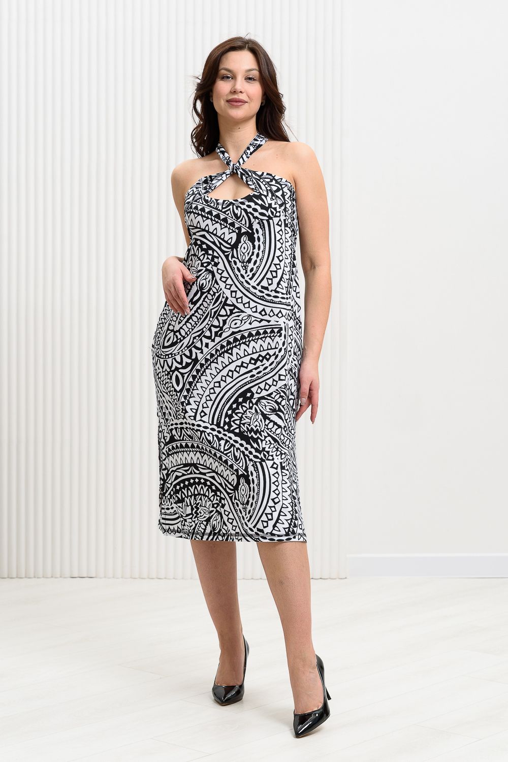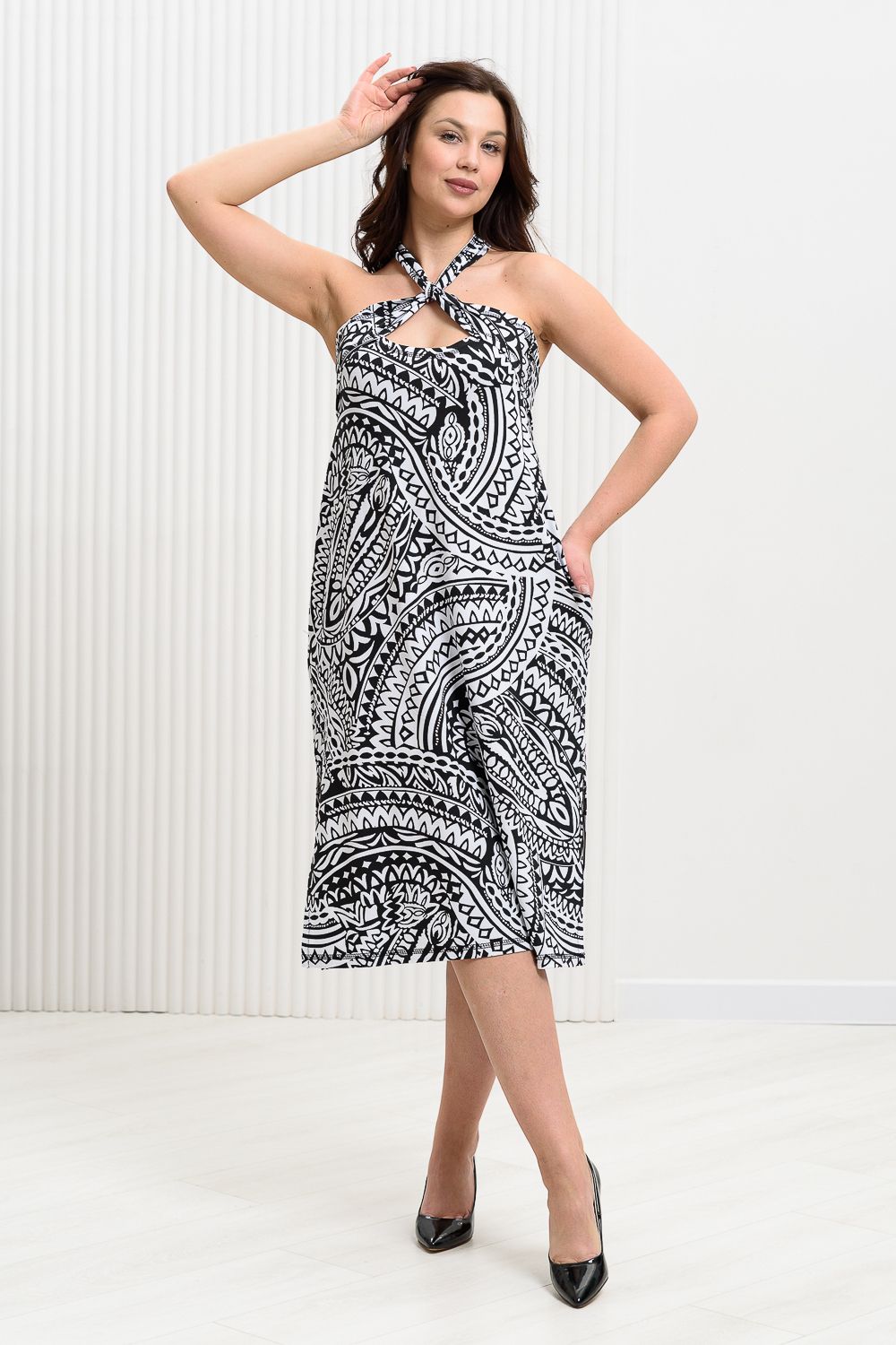 Сарафан женский, прилегающий по груди и полуприлегающий по бедрам. В боковых швах внутренние карманы и разрезы. Широкие бретели пересекаются в верхней части сарафана в области декольте.