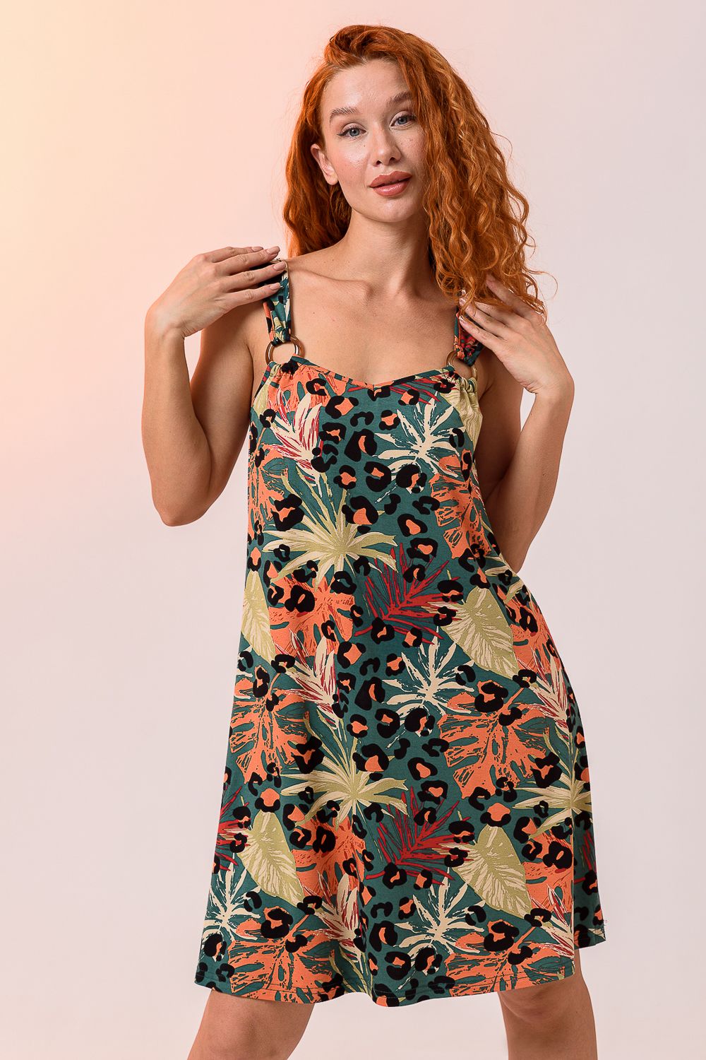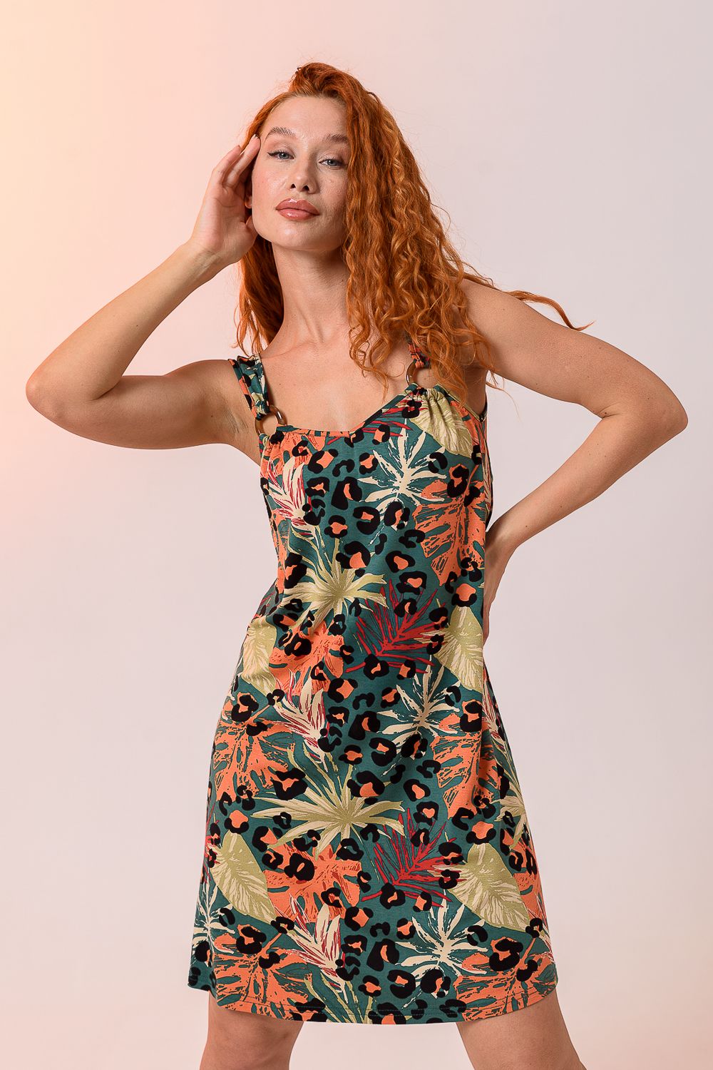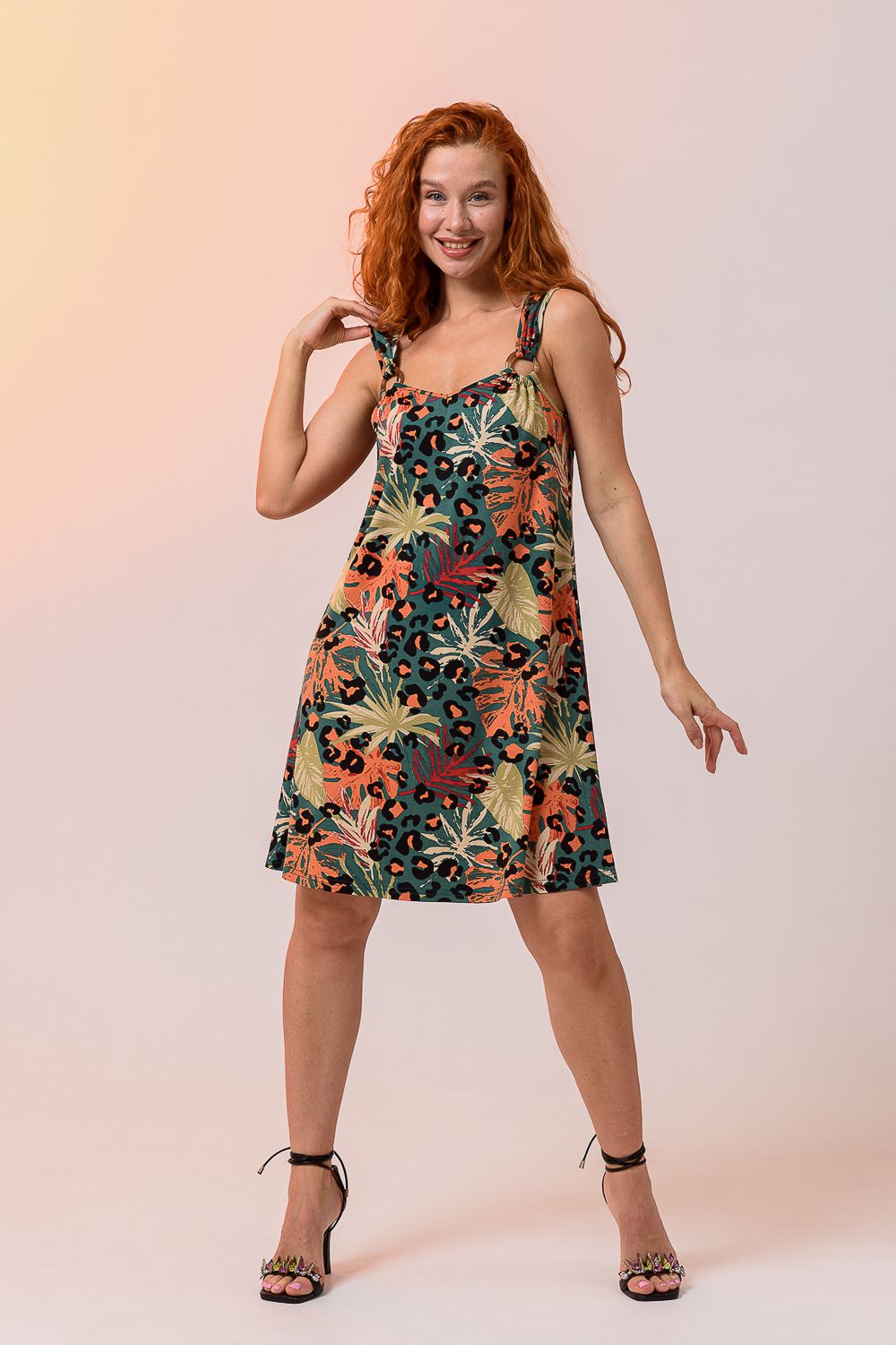 Сарафан трапецивидного силуэта, с V-образной горловиной спереди и сзади, длиной выше колена. Горловина и проймы обработаны бейкой из основного полотна.