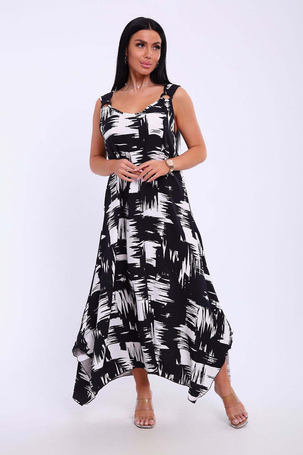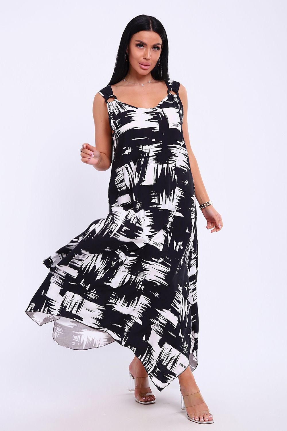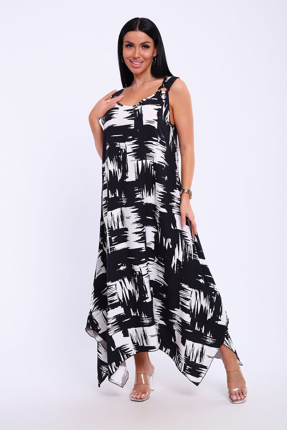 Сарафан летний больших размеров пляжный домашний 5739 - черно-белый