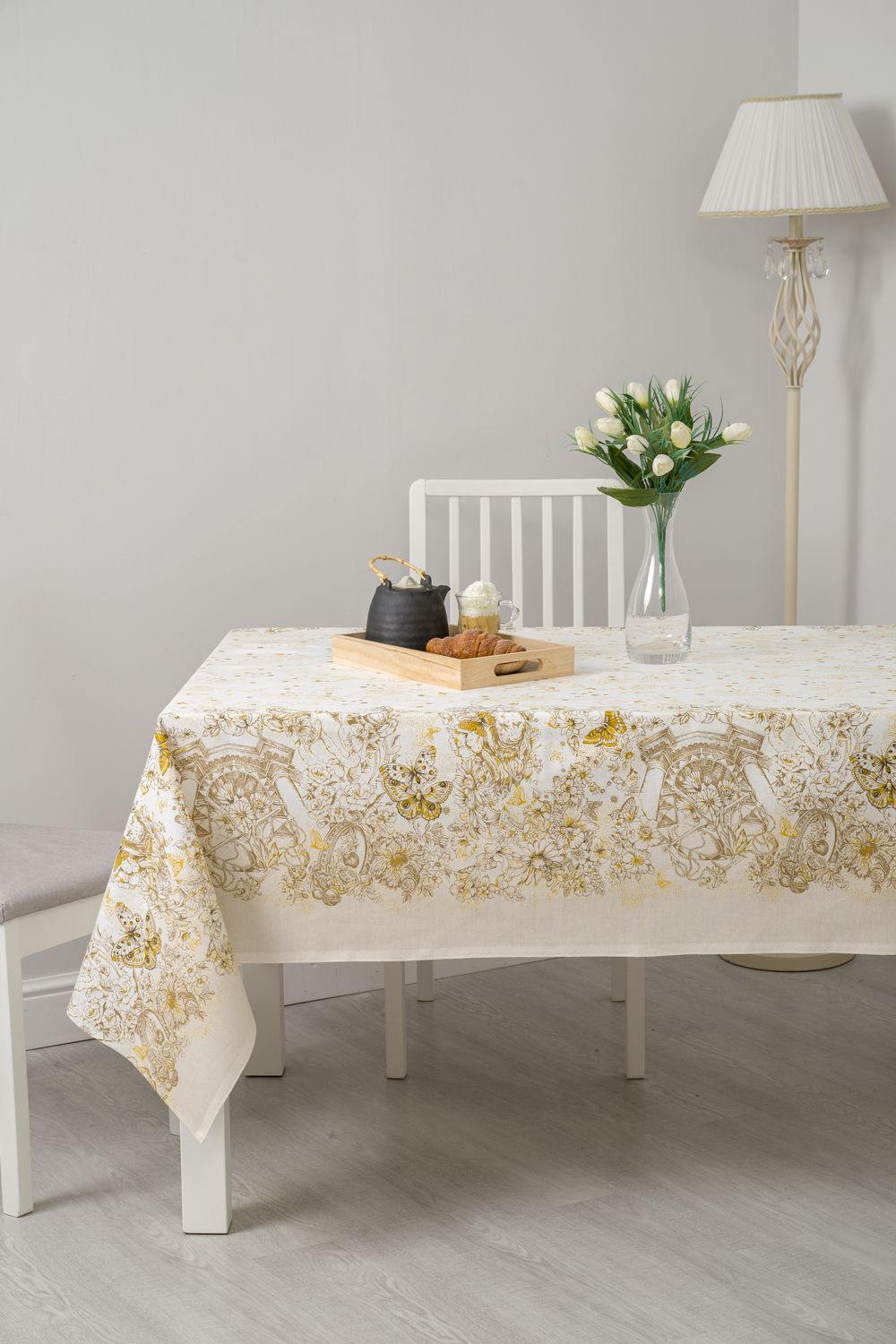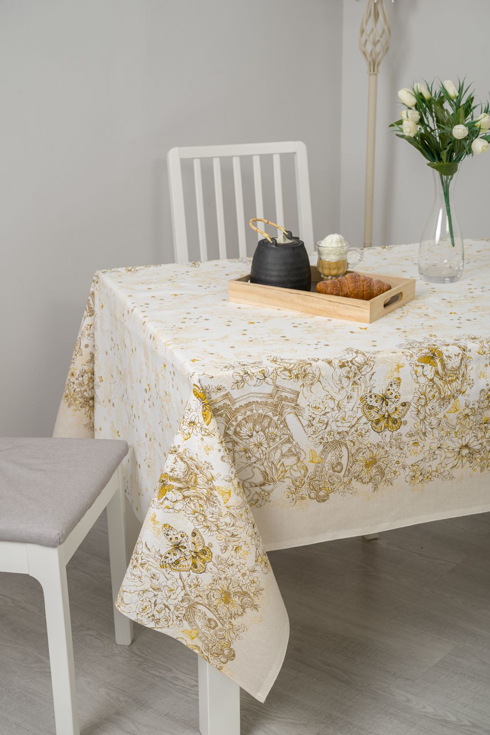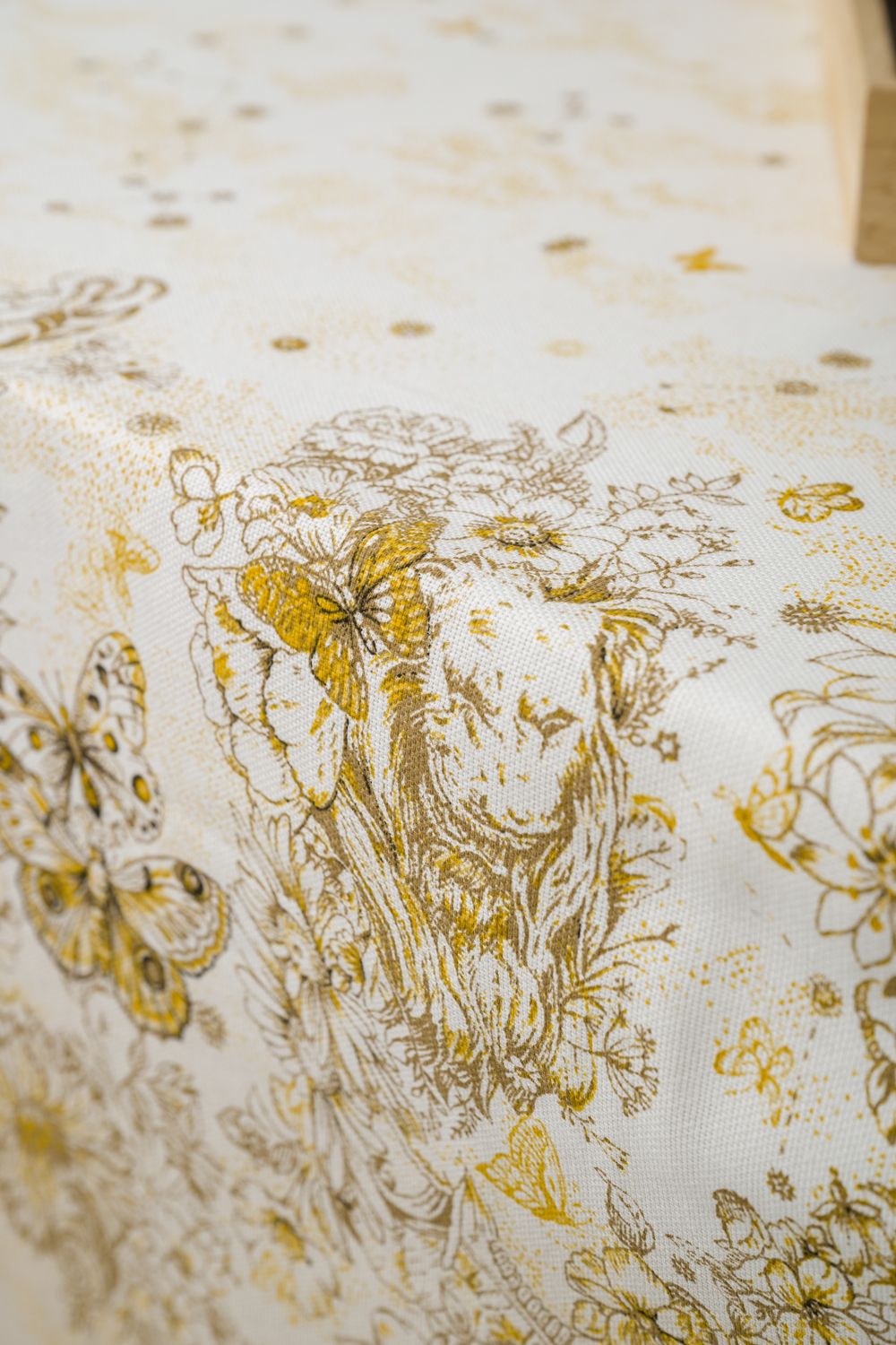 Светлая скатерть с изысканным рисунком в стиле Диор, способна украсить даже самую необычную кухню. Золотистые узоры и бабочки на белом фоне выглядят очень лаконично и дорого, особую утонченность дизайну придают предметы античности. Скатерть из рогожки Диор практичная, долговечная и элегантная.