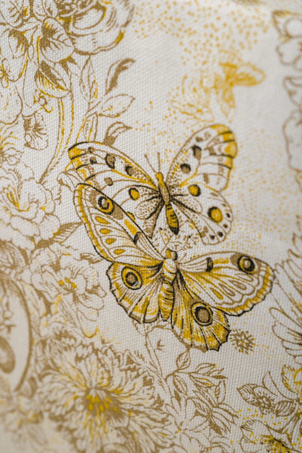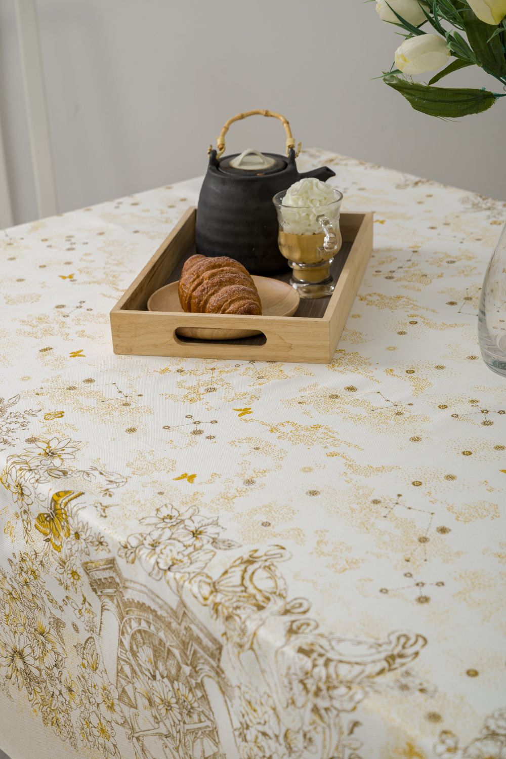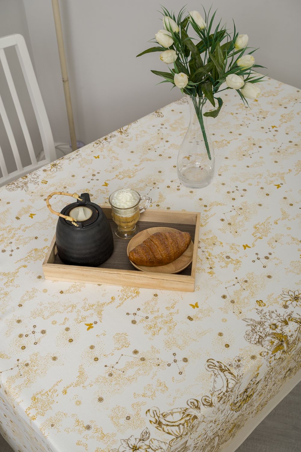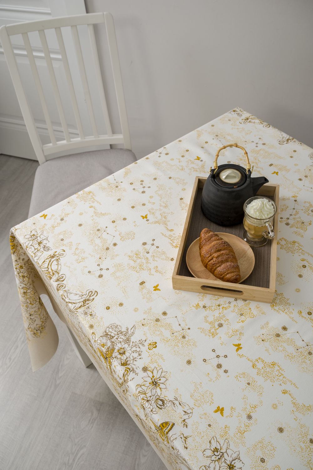 Светлая скатерть с изысканным рисунком в стиле Диор, способна украсить даже самую необычную кухню. Золотистые узоры и бабочки на белом фоне выглядят очень лаконично и дорого, особую утонченность дизайну придают предметы античности. Скатерть из рогожки Диор практичная, долговечная и элегантная.