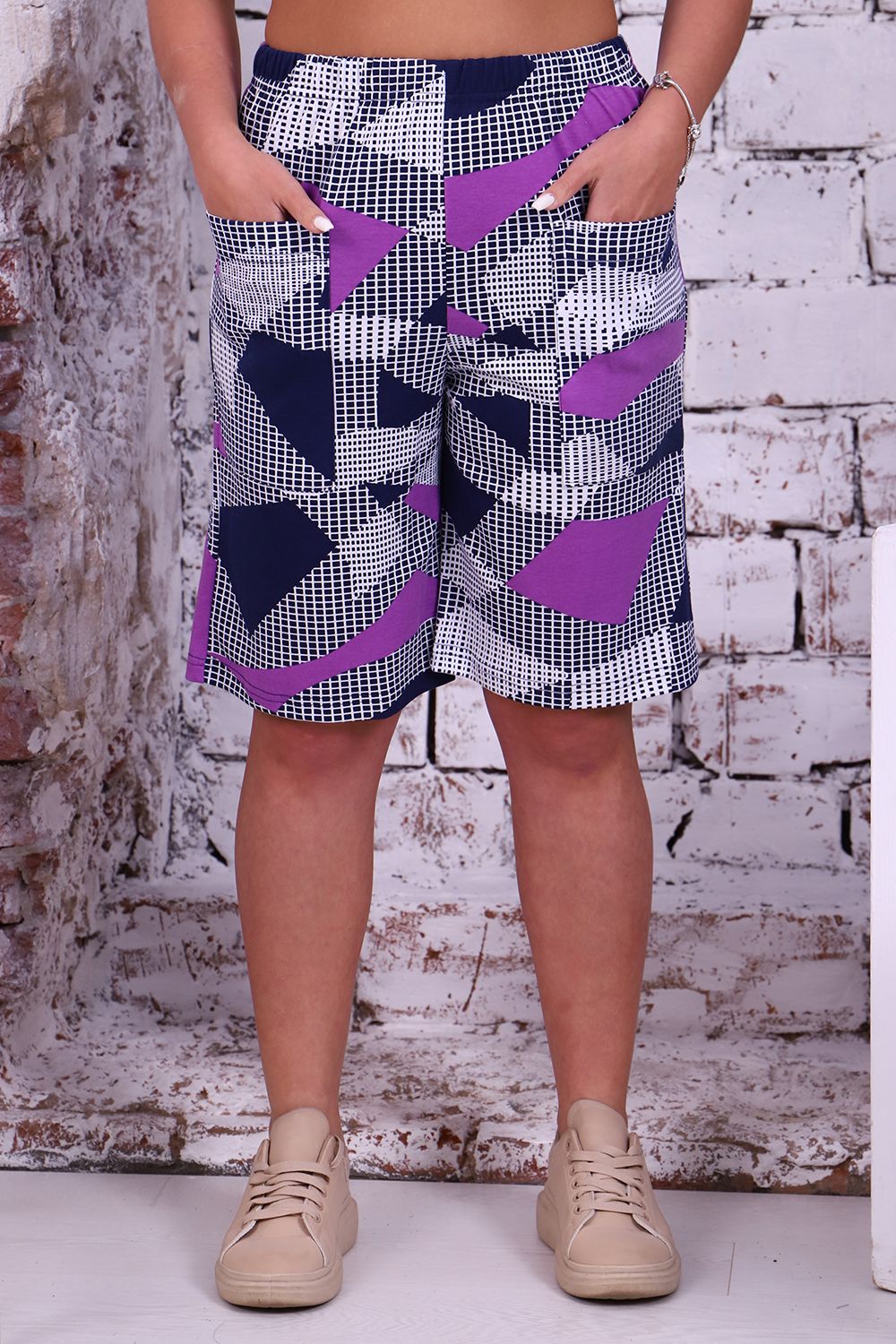 Шорты женские из интерлока. Шорты длиной выше колена, на притачном поясе с накладными карманами.