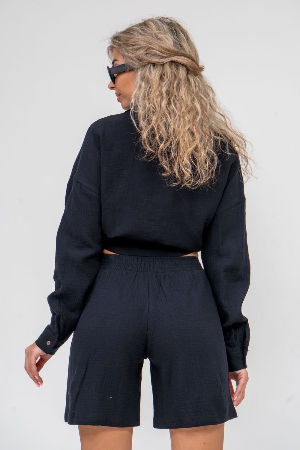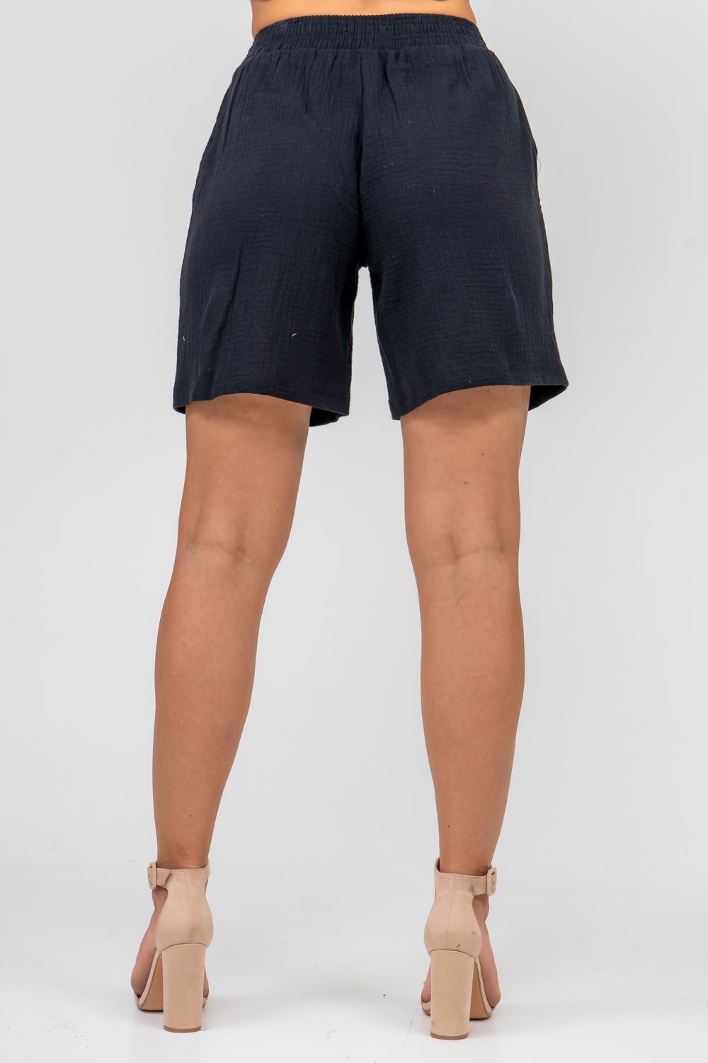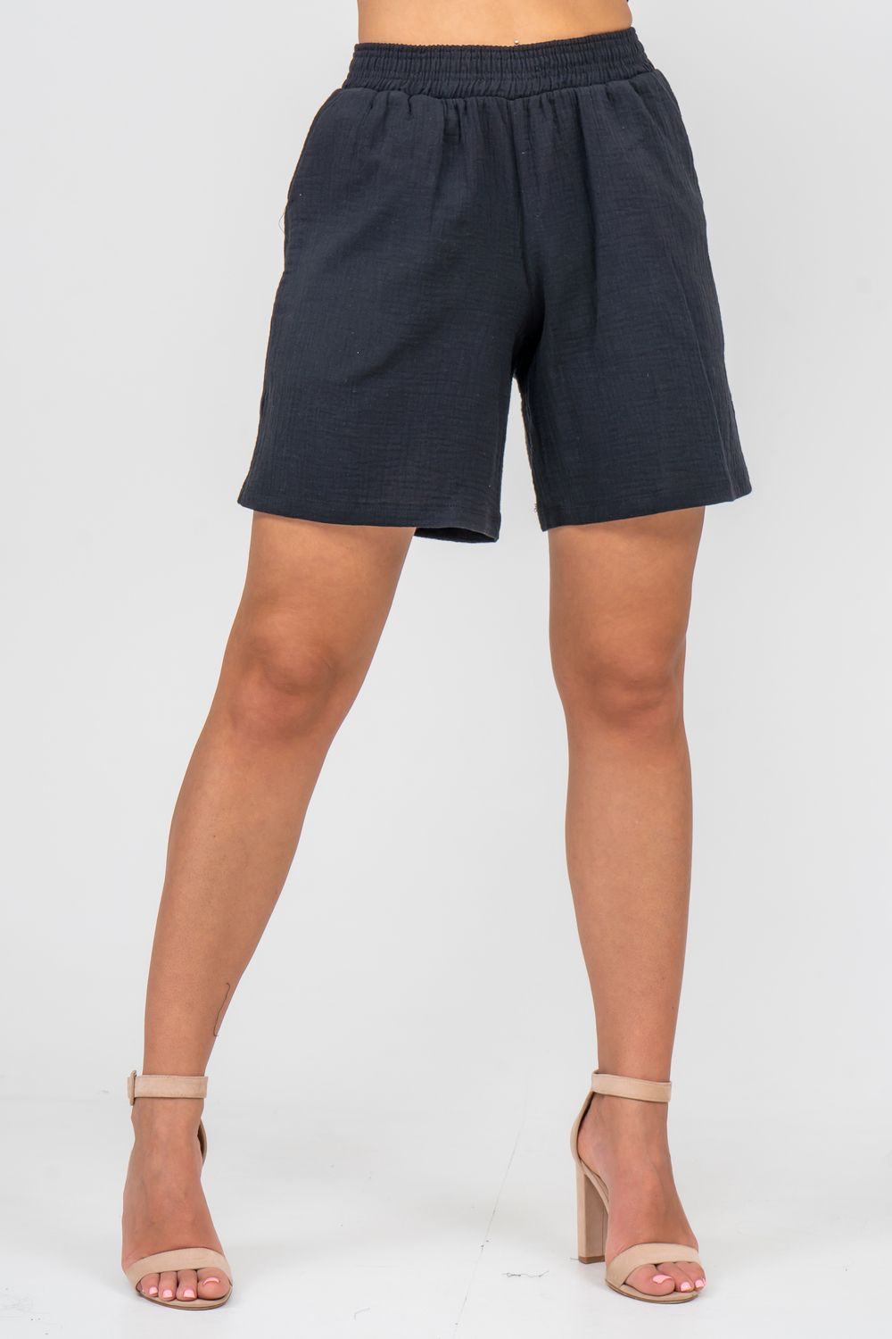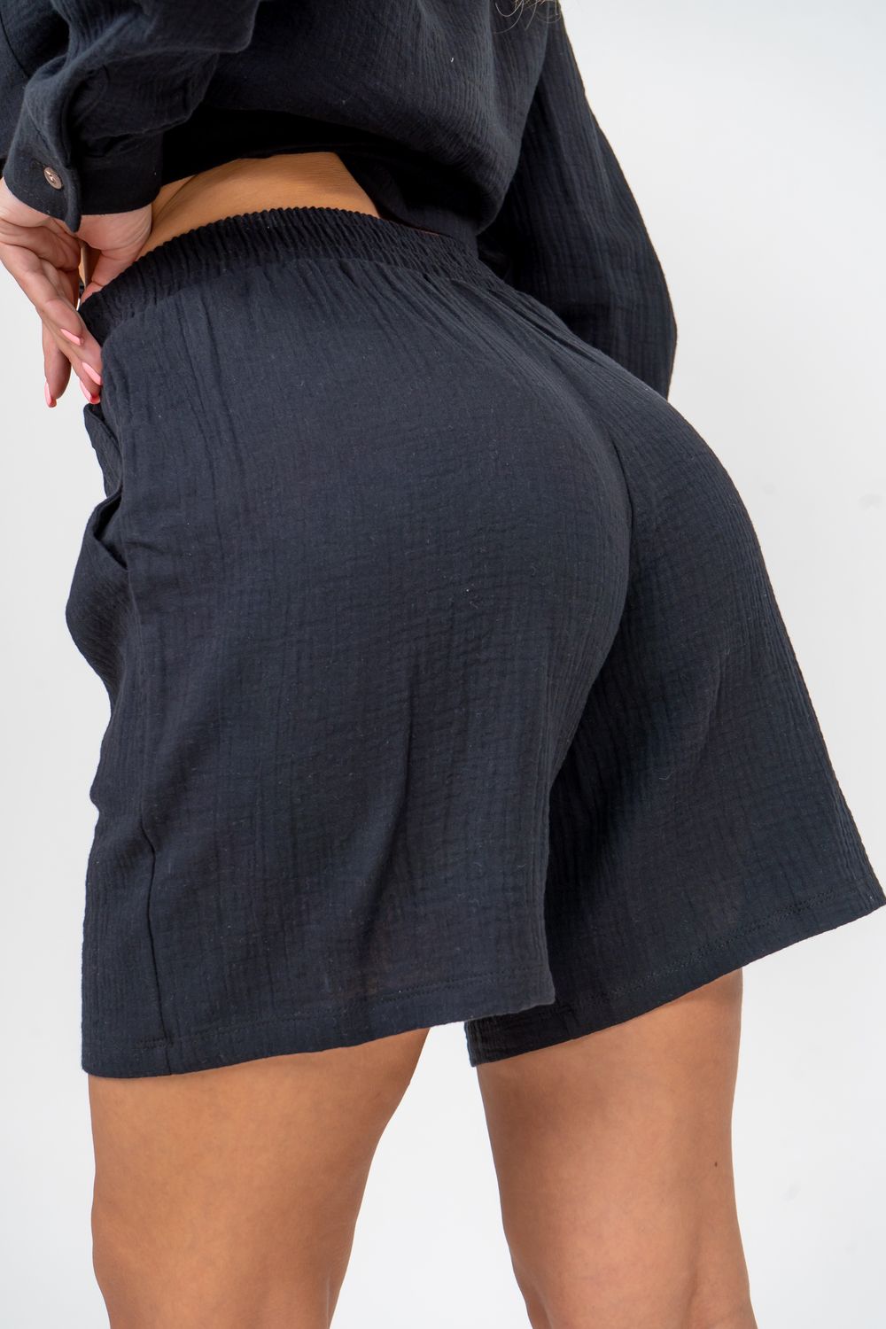 Модные женские шорты - бермуды с завышенной линией талии выполнены из легкого струящегося двухслойного муслина с жатой структурой. Одежда из ткани муслин - это новинка и тренд сезона. Пояс шорт выполнен на специализированной поясной машине, что добавляет изделию большую износостойкость и эстетический внешний вид. По бокам, для удобства, расположены вместительные карманы. Изделие из муслина имеет много положительных качеств: нежность и лёгкость, высокая прочность, воздухопроницаемость. Легкие хлопковые шорты с высокой посадкой создадут модный образ для любой девушки. С шортами из муслина Вы создадите себе, как спортивный или повседневный образ на выход, так и универсальный вариант для дома и сна. Стирать муслиновые вещи нужно только в тёплой воде при температуре не выше 40°С.