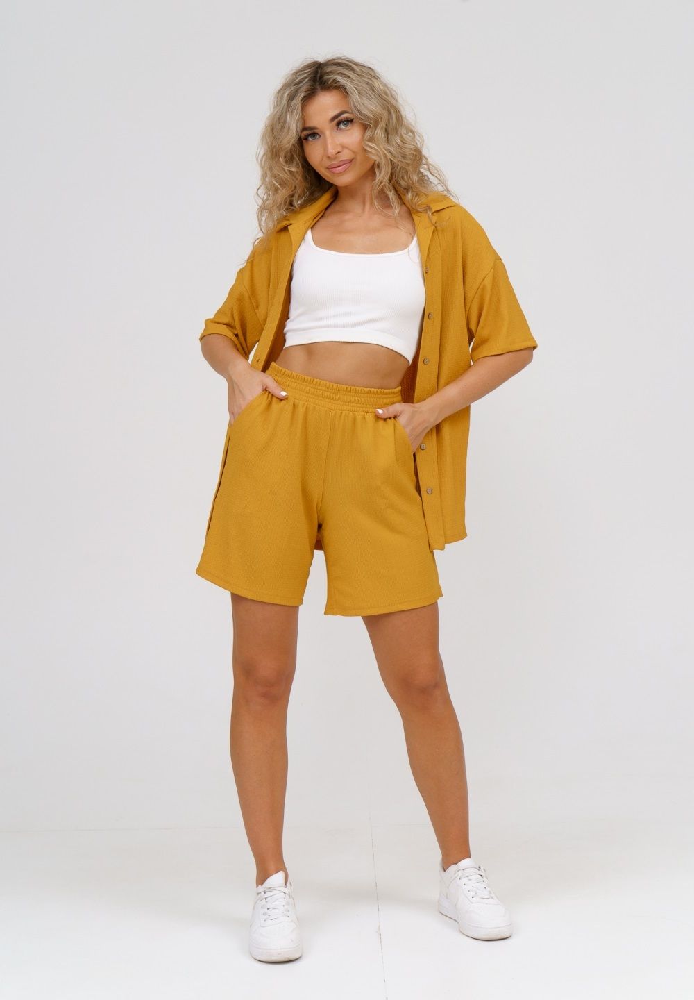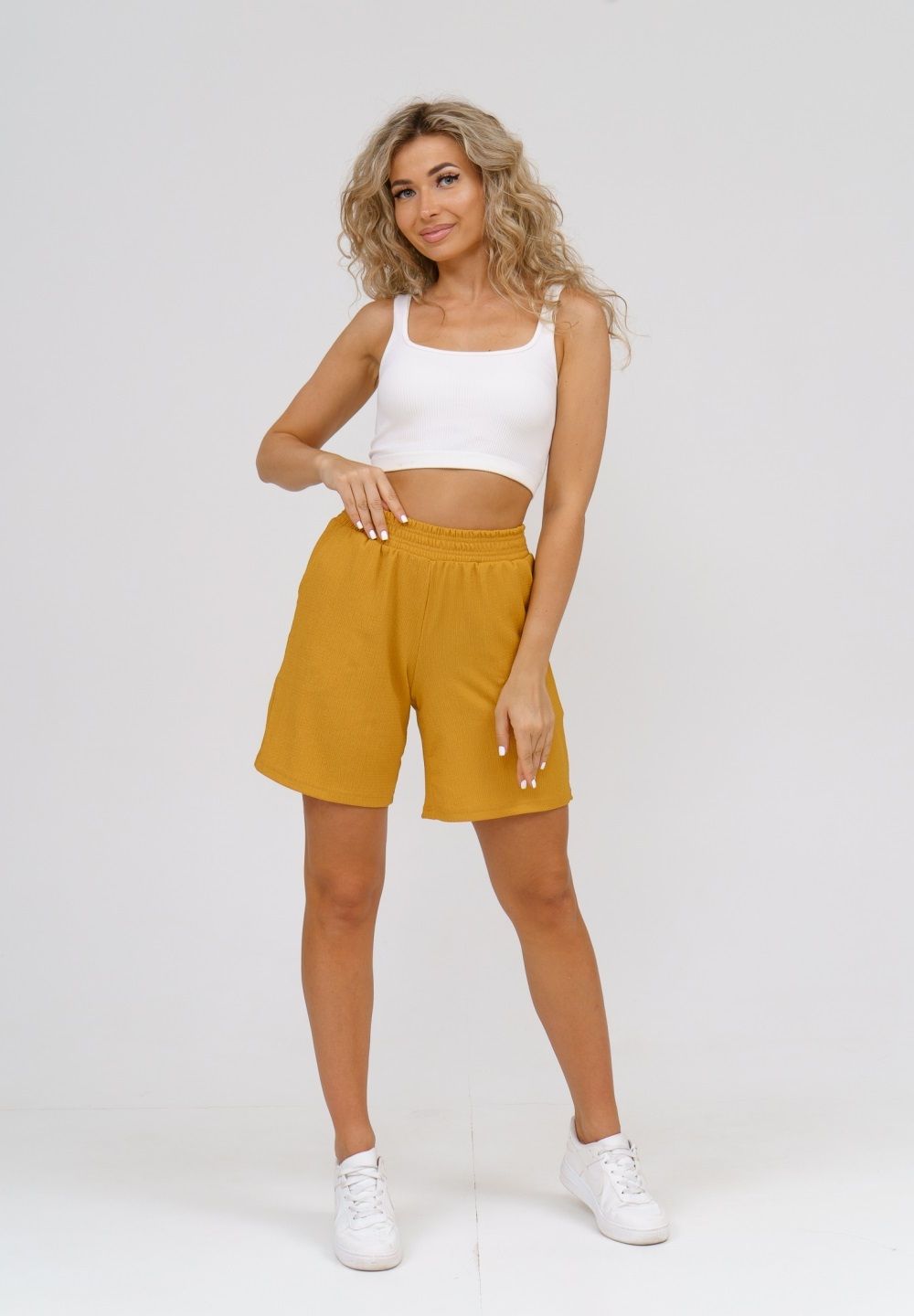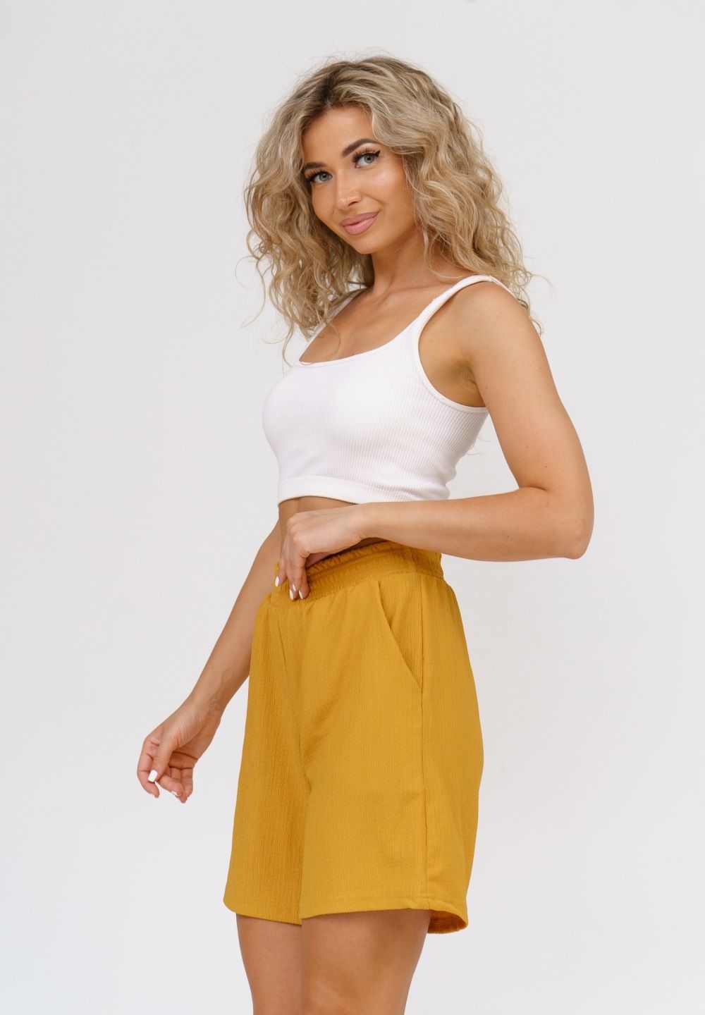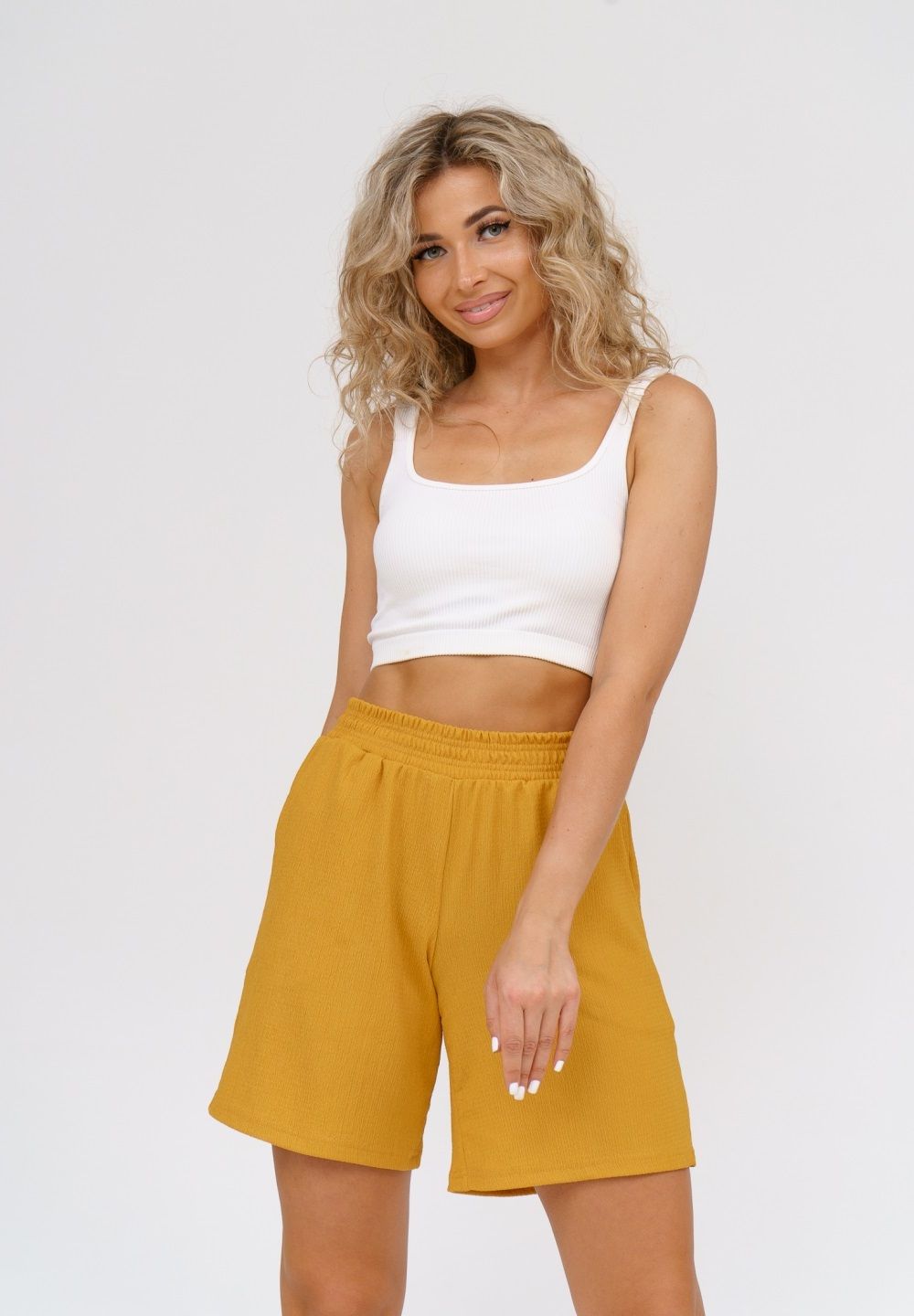 Модные женские шорты - бермуды с завышенной линией талии выполнены из легкого струящегося материала с жатой структурой. Одежда из ткани жатка - это новинка и тренд сезона. Пояс шорт выполнен на специализированной поясной машине, что добавляет изделию большую износостойкость и эстетический внешний вид. По бокам, для удобства, расположены вместительные карманы. Изделие из жатки имеет много положительных качеств: нежность и лёгкость, высокая прочность, воздухопроницаемость. Легкие шорты с высокой посадкой создадут модный образ для любой девушки. С шортами из жатки Вы создадите себе, как спортивный или повседневный образ на выход, так и универсальный вариант для дома и сна.