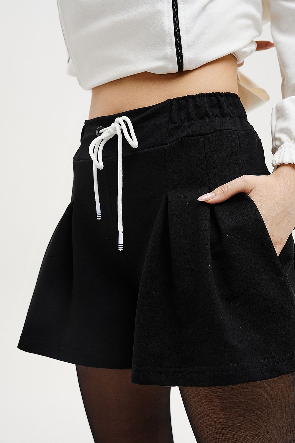 Стильные расклешенные шорты свободного кроя, на талии складки, пояс на резинке, удобные карманы в боковом шве и сзади.