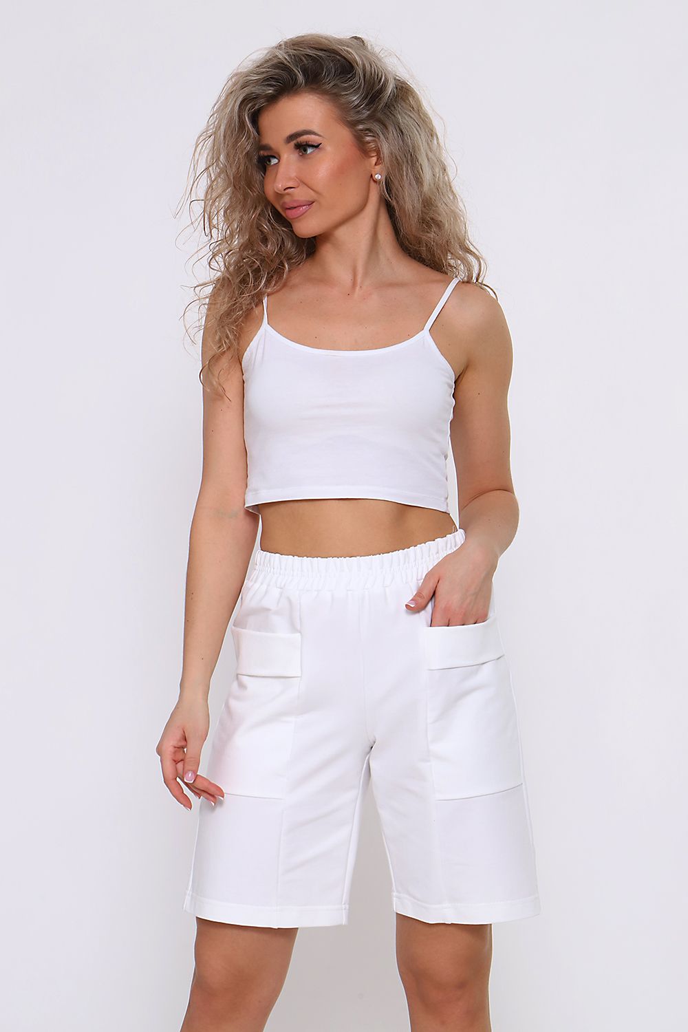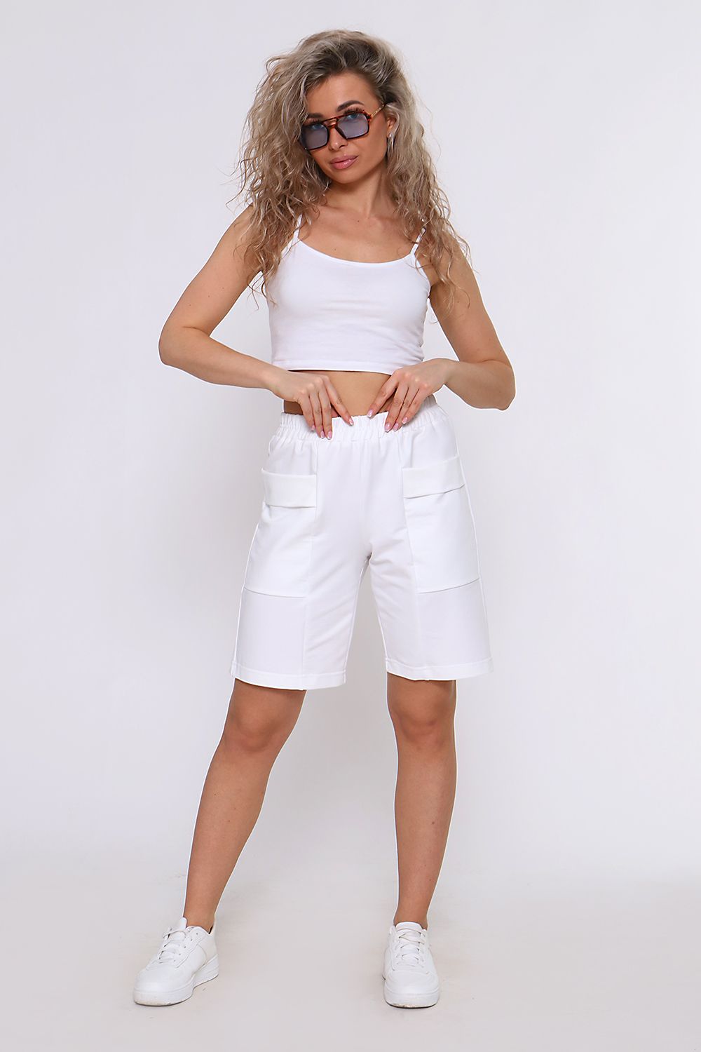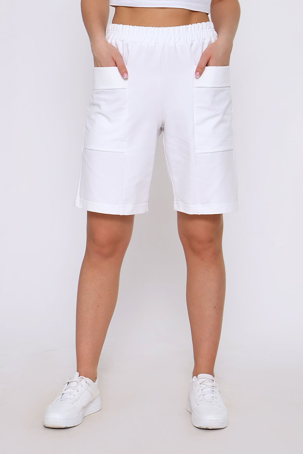 Стильные женские шорты, выполнены из футера 2-х нитка качество карде, ткань мягкая, эластичная, отлично пропускает воздух, не просвечивает. Изделие представлено в двух расцветках, молоко и новый актуальный цвет сезона малахит-минеральный. Универсальная модель шорт с оптимальной длинной, подойдет под любой образ и повод. Легко будет сочетаться как с футболками, топами, рубашками, так и с толстовками, жакетами. На передних половинках шорт, симметрично расположены накладные карманы с имитацией клапана. Карманы достаточно глубокие и не теряют форму при носке, продольные швы по переду, образуют эффект стрелки. Пояс на резинке с отстрочкой для вашего удобства и комфорта, резинка мягкая, широкая 4 см. На фото модель представлена в 46 размере.