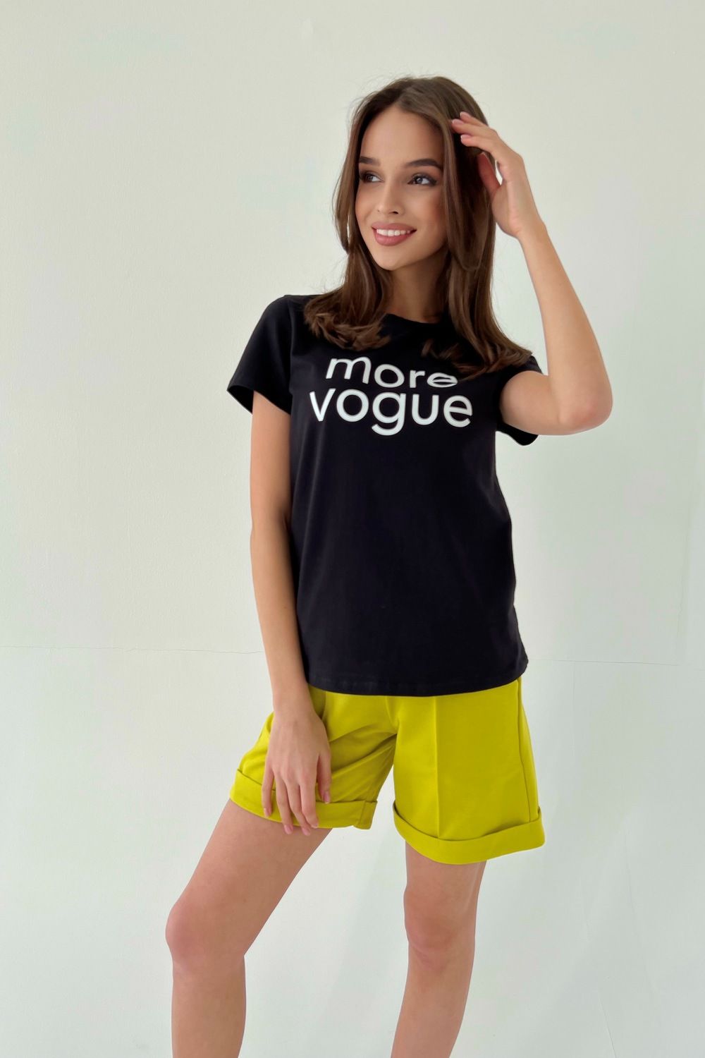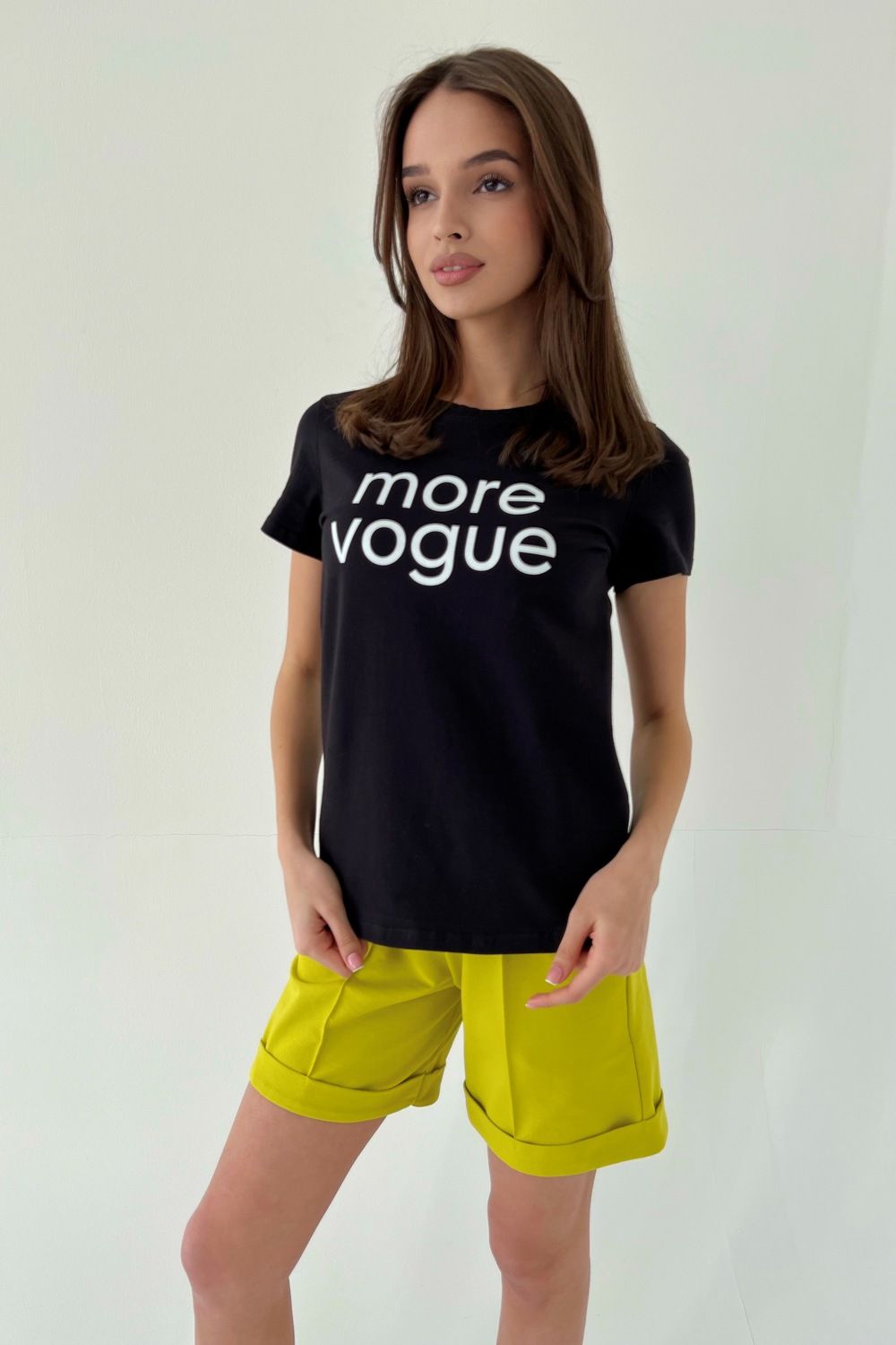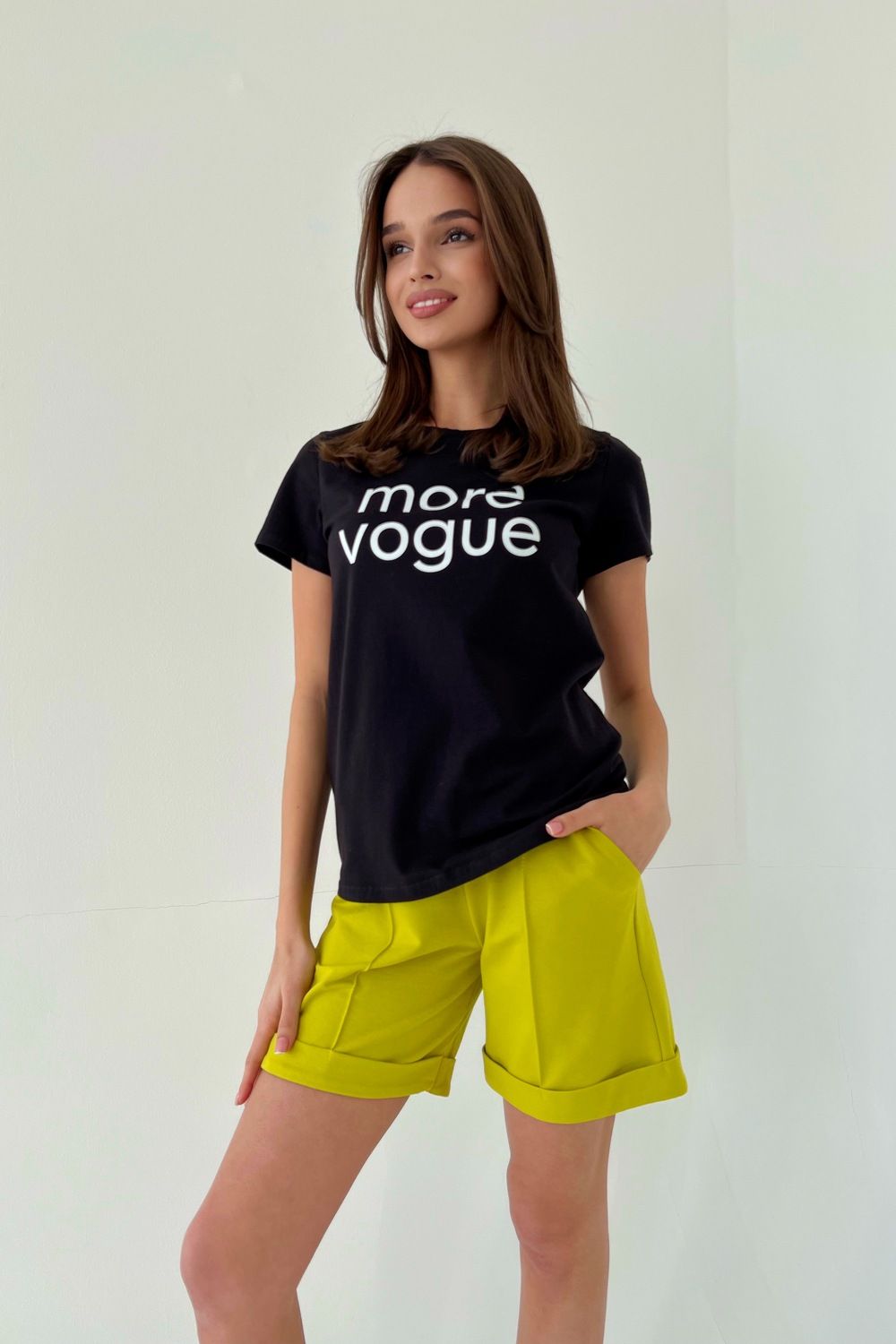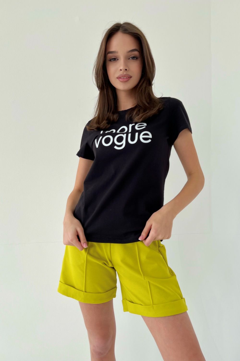 Шорты прямые, со стрелками на передних половинках, с карманами, на поясе, с манжетом.