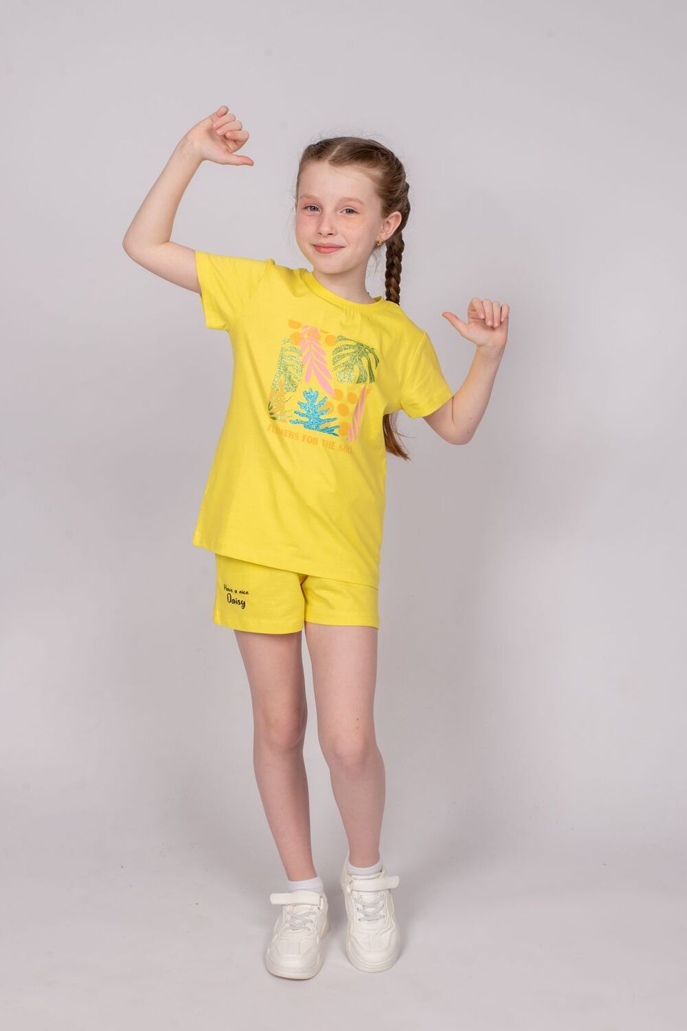 Шорты для девочки прямого силуэта из кулирки. Пояс отрезной в цвет изделия, выполнен из кашкорсе. По поясу шорт вставлен плоский утягивающий шнурок в цвет шорт, низ шнурка подвернут и застрочен. Вдоль пояса шнурок закреплен отстрочкой. В боковых швах выполнены карманы с листочкой. Низ изделия обработан швом в подгибку. На правой передней половинке шорт принт шелкография. Надпись переводится как "Милая ромашка".