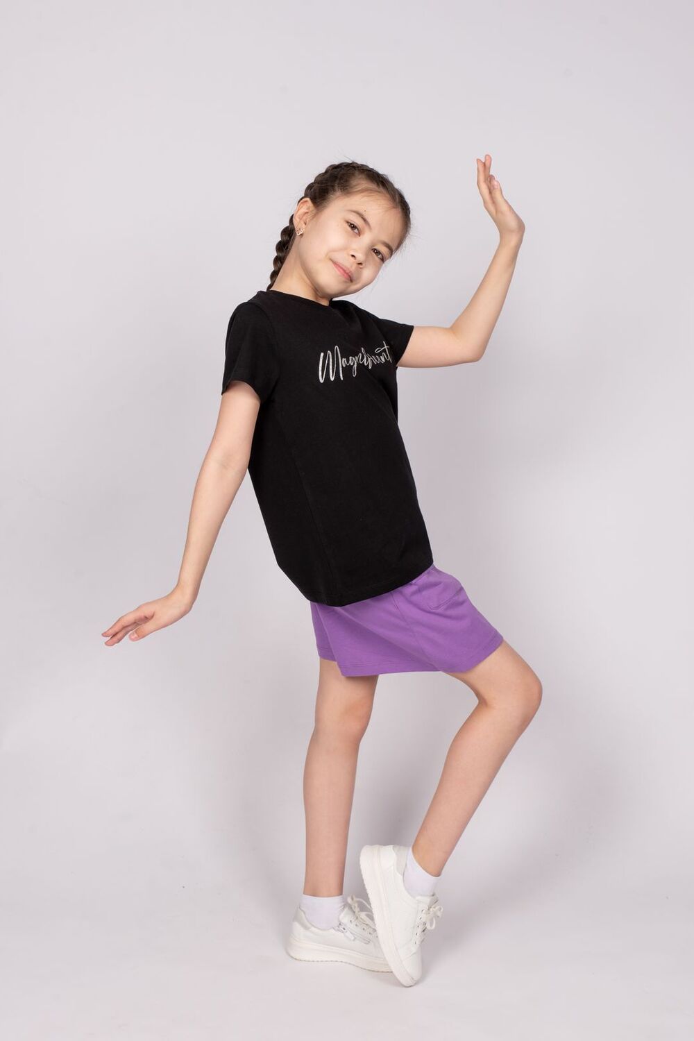 Шорты для девочки прямого силуэта из кулирки с накладным карманом. Пояс отрезной в цвет изделия, выполнен из основного полотна, с эластичной тесьмой внутри. В передней части изделия расположена отлётная часть – имитация запаха, из основного полотна. На отлетной части запаха выполнен накладной карман с клапаном из основного материала. На клапане принт шелкография с глиттером. Надпись переводится как "Вперед". Низ изделия и отлетная часть запаха обработан швом в подгибку.