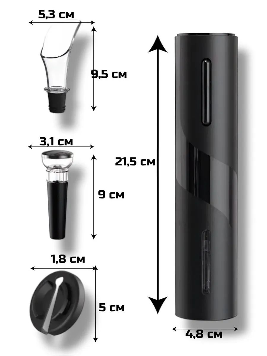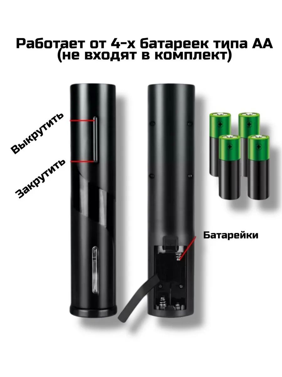Набор сомелье из 4х предметов. Сочетание подарочного набора и кухонной утвари делает его идеальным для мужчины или девушки, истинных ценителей вина и кулинарии. Это набор для открывания вина из 4х предметов. Работает автоматически от нажатия кнопки, на батарейках (батарейки в комплект не входят). Штопор для вина будет долго работать и сильно упростит процесс открывания бутылок с пробкой. Основная функция штопора заключается в удобном и быстром открывании винных бутылок. Для этого достаточно разрезать фольгу на бутылке с помощью специального ножа, приложить открывалку к горлышку, нажать кнопку открывания бутылок и шнек автоматически ввинчивается в пробку. Для извлечения пробки требуется всего несколько секунд. Электрический штопор прост в эксплуатации, не требует особых навыков и силы. Он станет незаменимым как на кухне, так и в баре. Автоматический штопор позволит вам в одно мгновение открыть бутылку без лишних усилий. Просто разместите его на горлышке и нажмите кнопку, и товар моментально справится с задачей. Он легко справляется с пробками любого вида. Теперь наслаждаться вином стало проще и быстрее! Красиво оформленный в черном корпусе, он будет прекрасным украшением вашего интерьера.