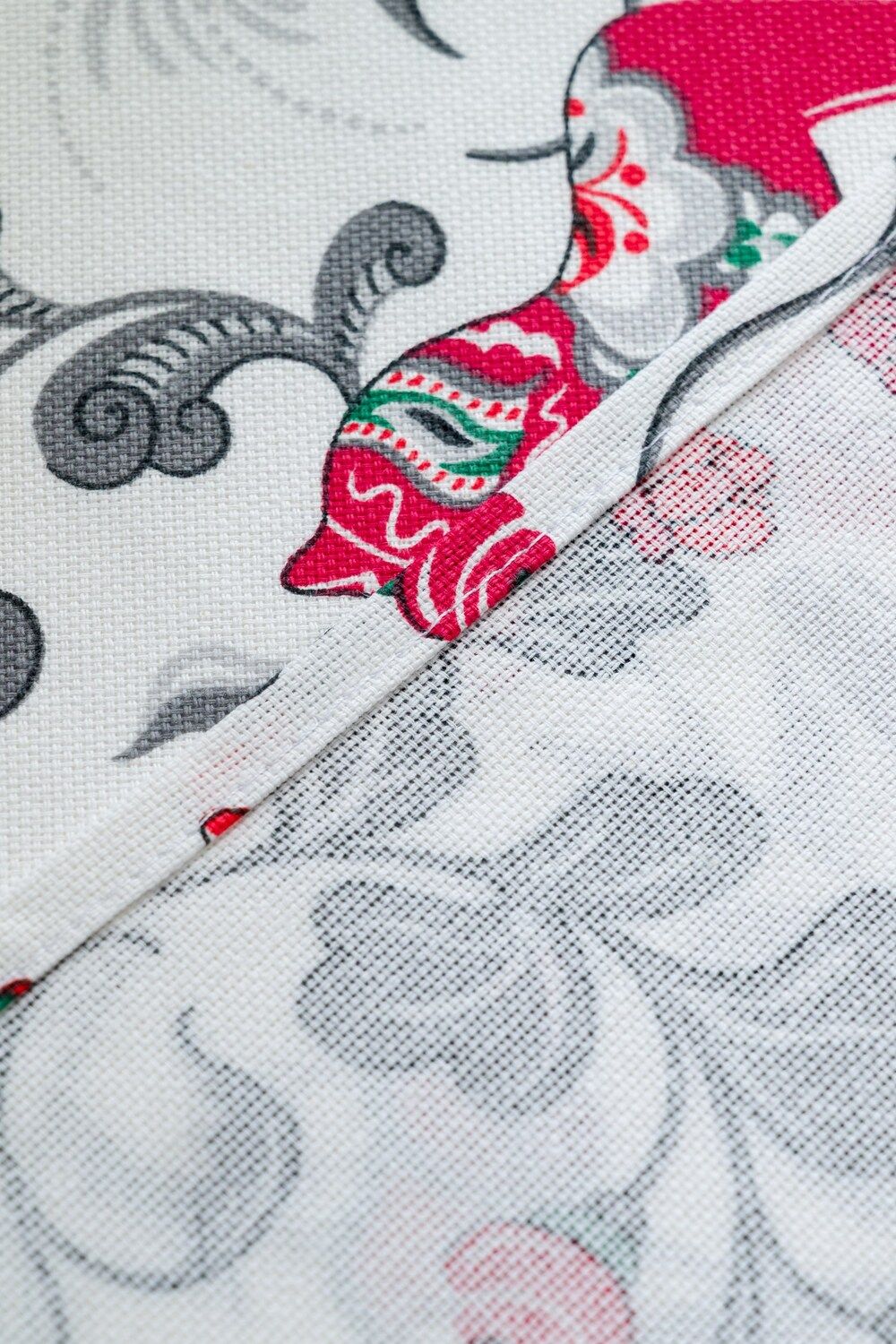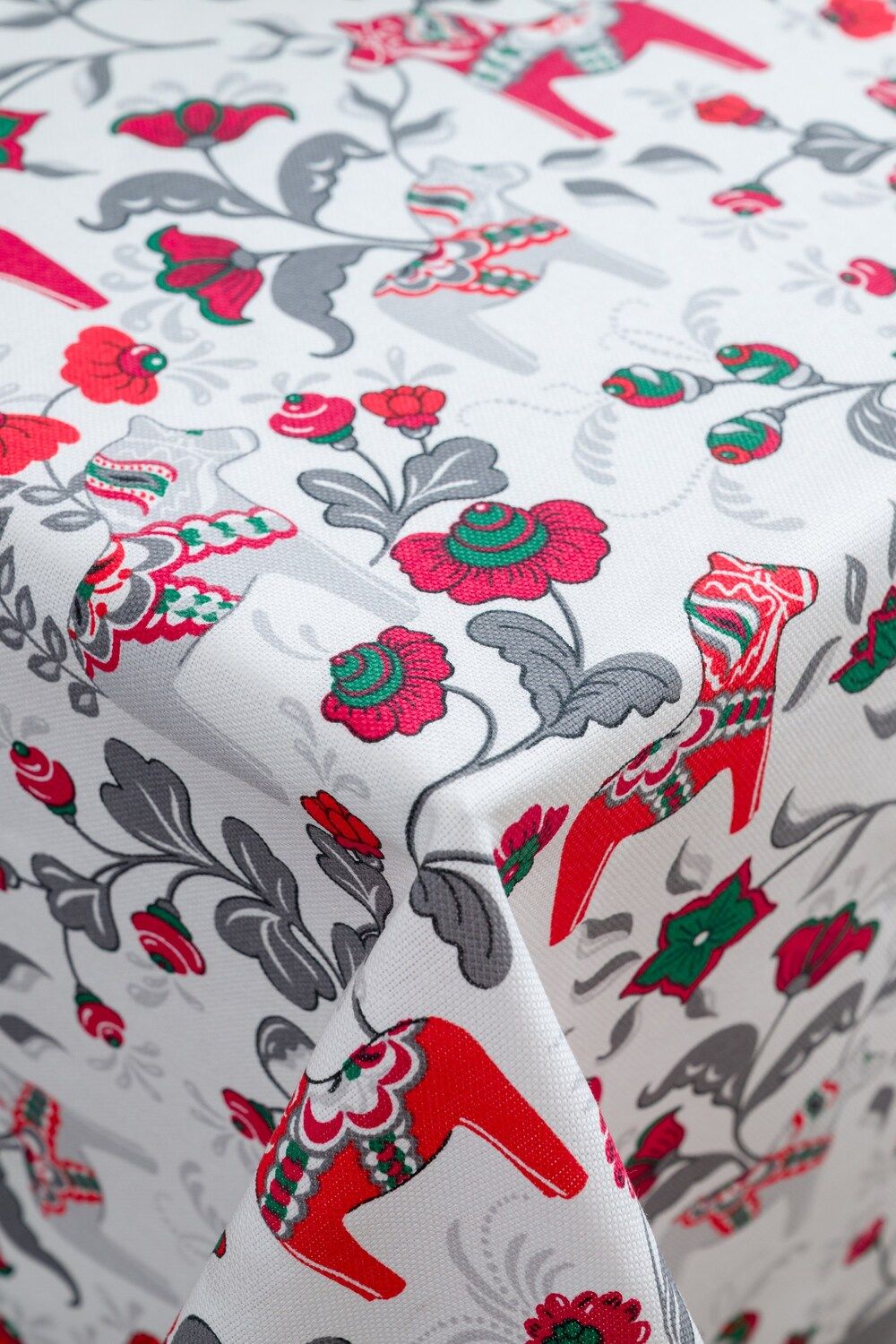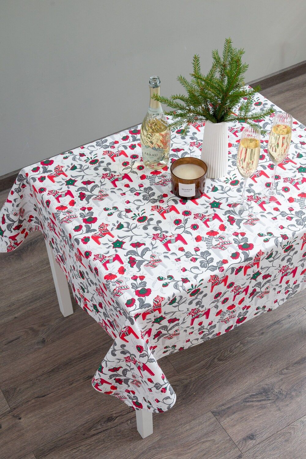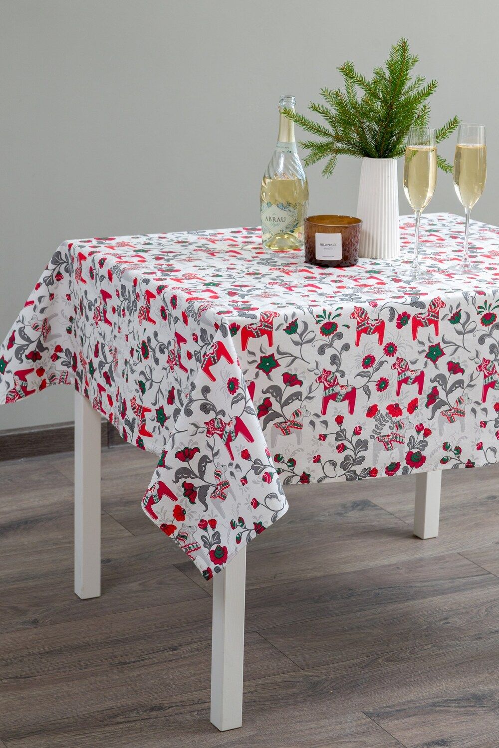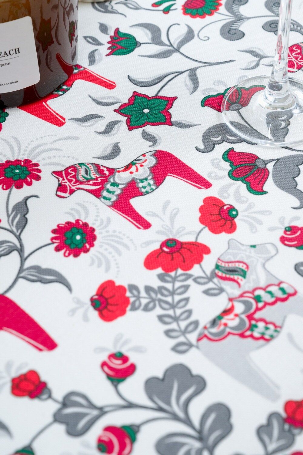 Уникальный дизайн: Скатерть выполнена в традиционном стиле Городецкой росписи. Белый фон украшен яркими красными лошадками, символами наступающего 2026 года, и зимними атрибутами, создающими атмосферу праздника и радости.