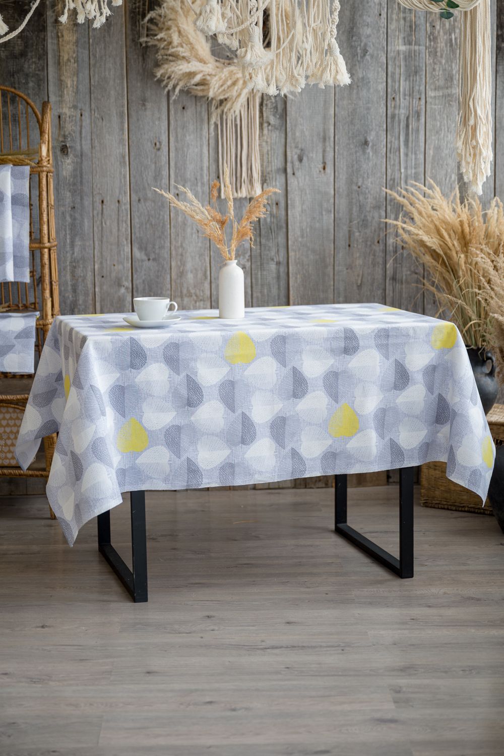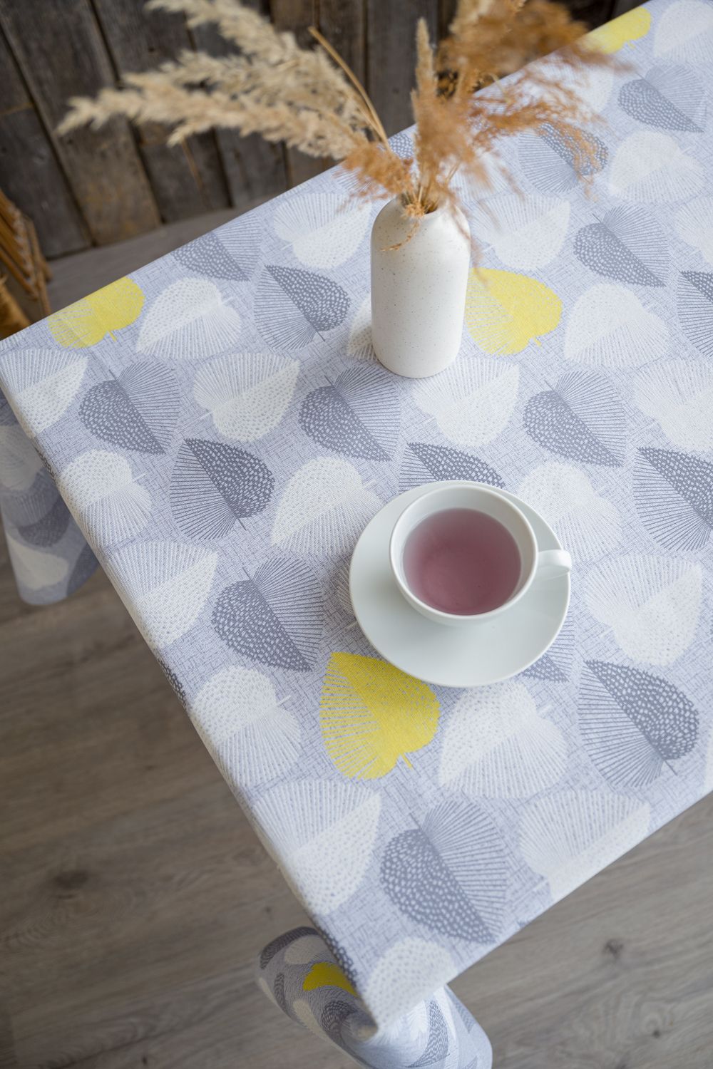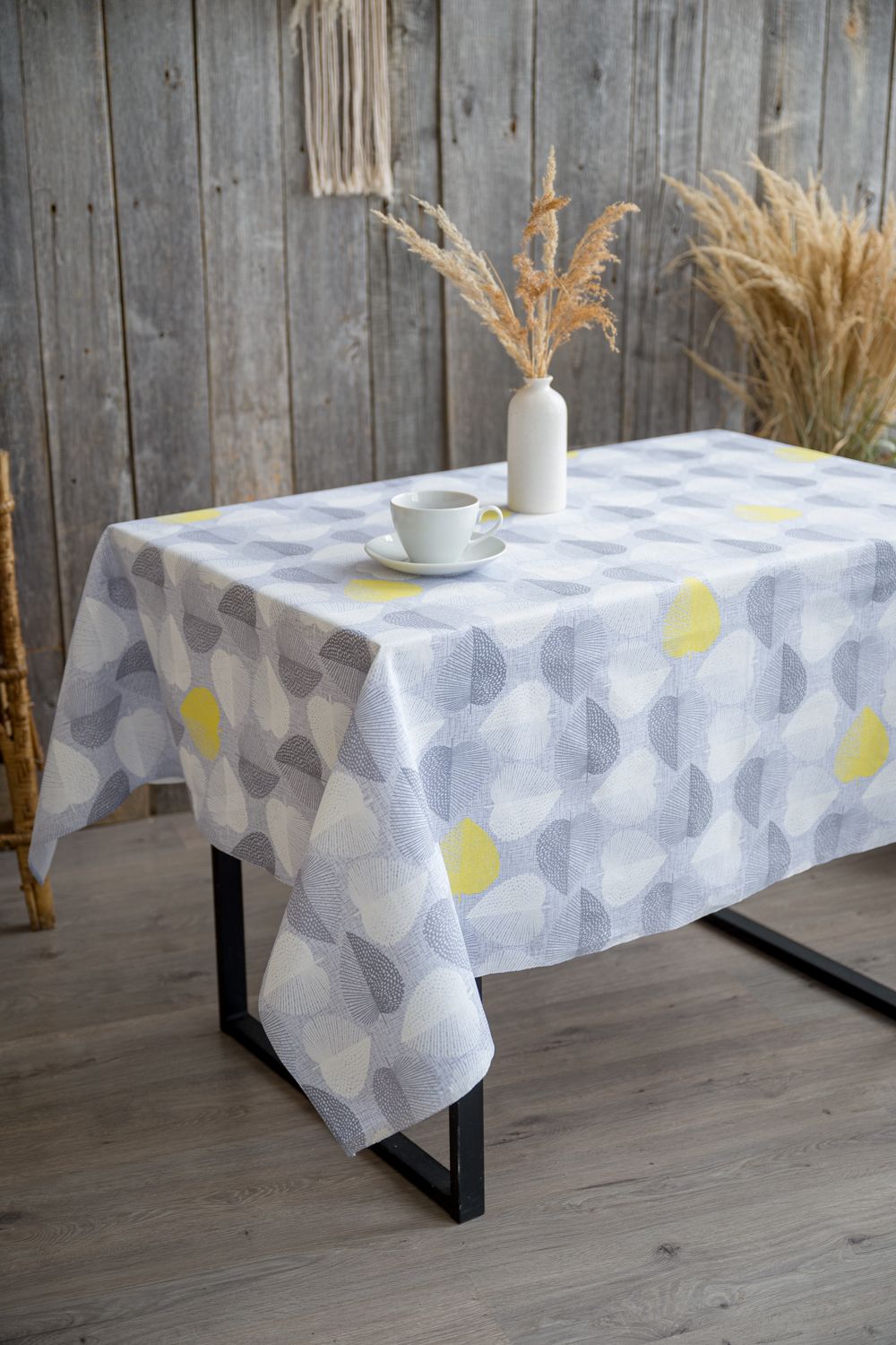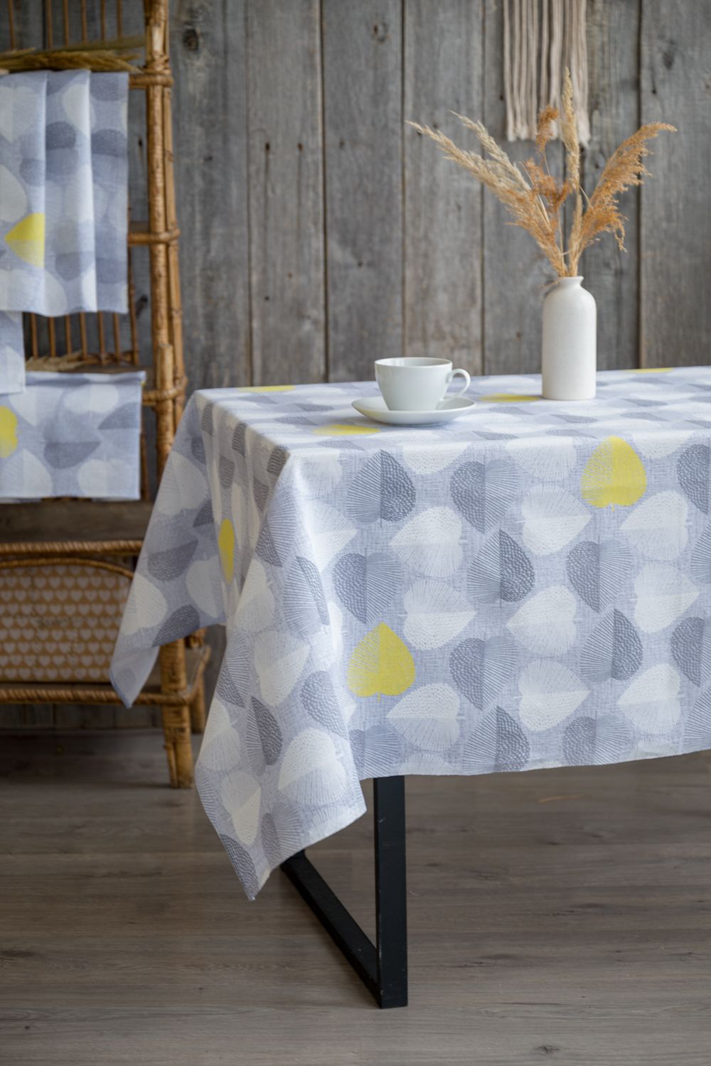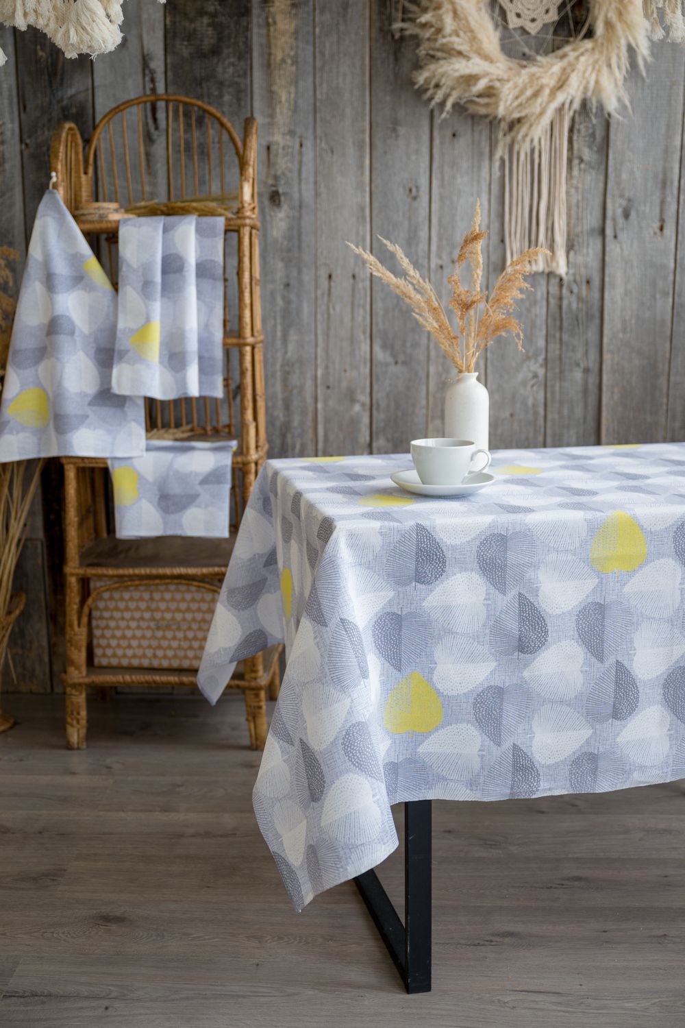 Светлая скатерть из рогожки с повторяющимся узором в виде листьев в форме сердечек способна украсить любой кухонный стол. Скатерть Клинт выполнена преимущественно в серых тонах, а редкие желтые листья добавляют некую "изюминку" этому дизайну. Благодаря чему изделие выглядит очень гармонично и свежо. Скатерти из рогожки не требуют особого ухода и славятся долгим сроком службы.