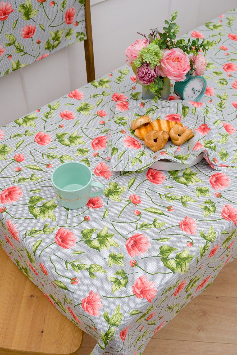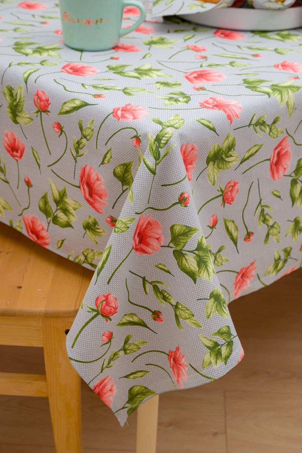 Эта прекрасная скатерть из рогожки станет идеальным дополнением к вашему прямоугольному столу в кухне. Ее серый цвет и красные цветы создадут уютную атмосферу и придадут интерьеру особый шарм.