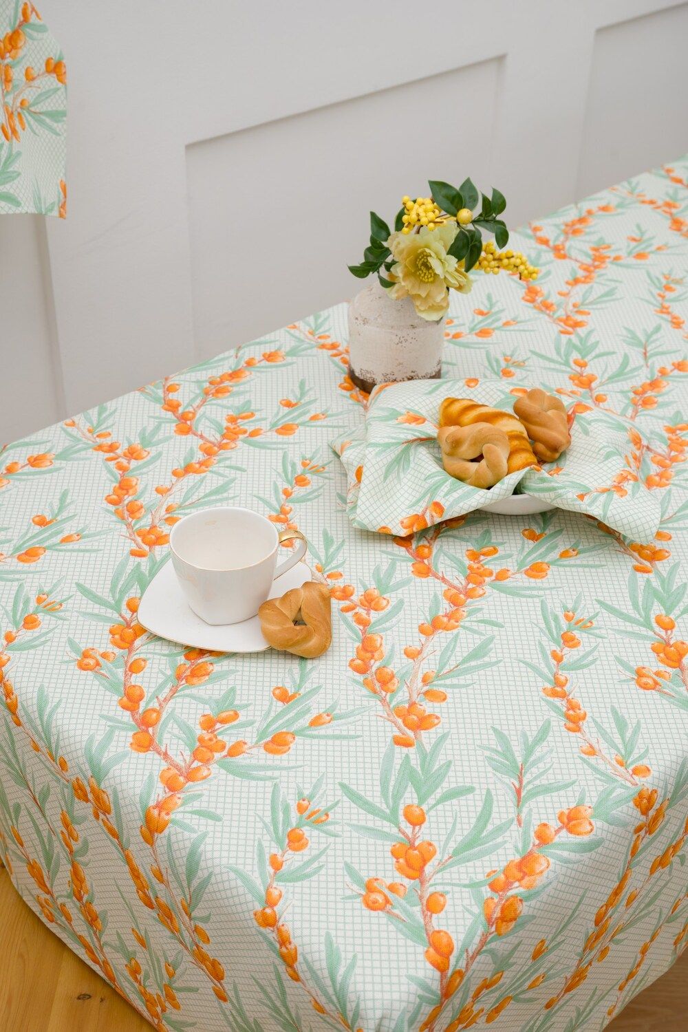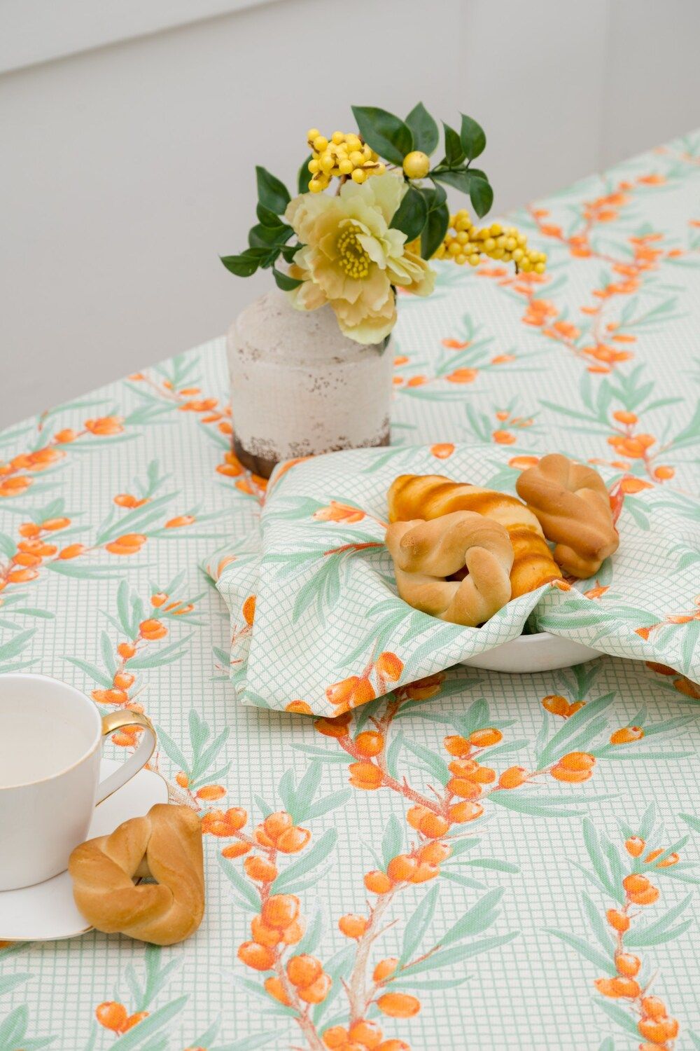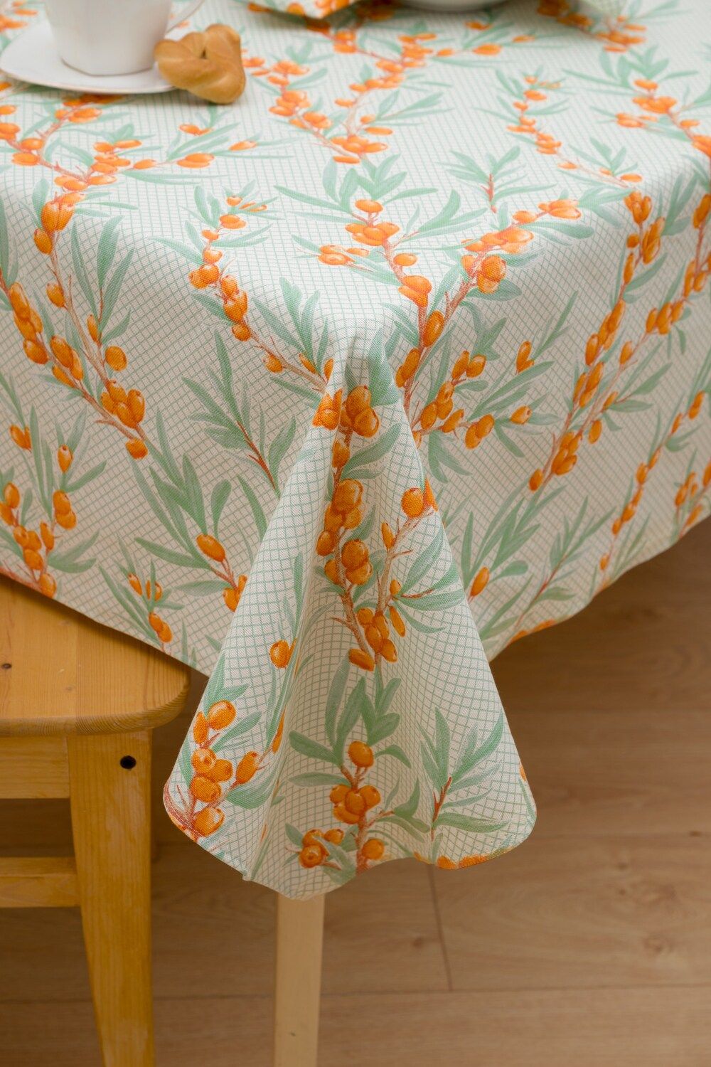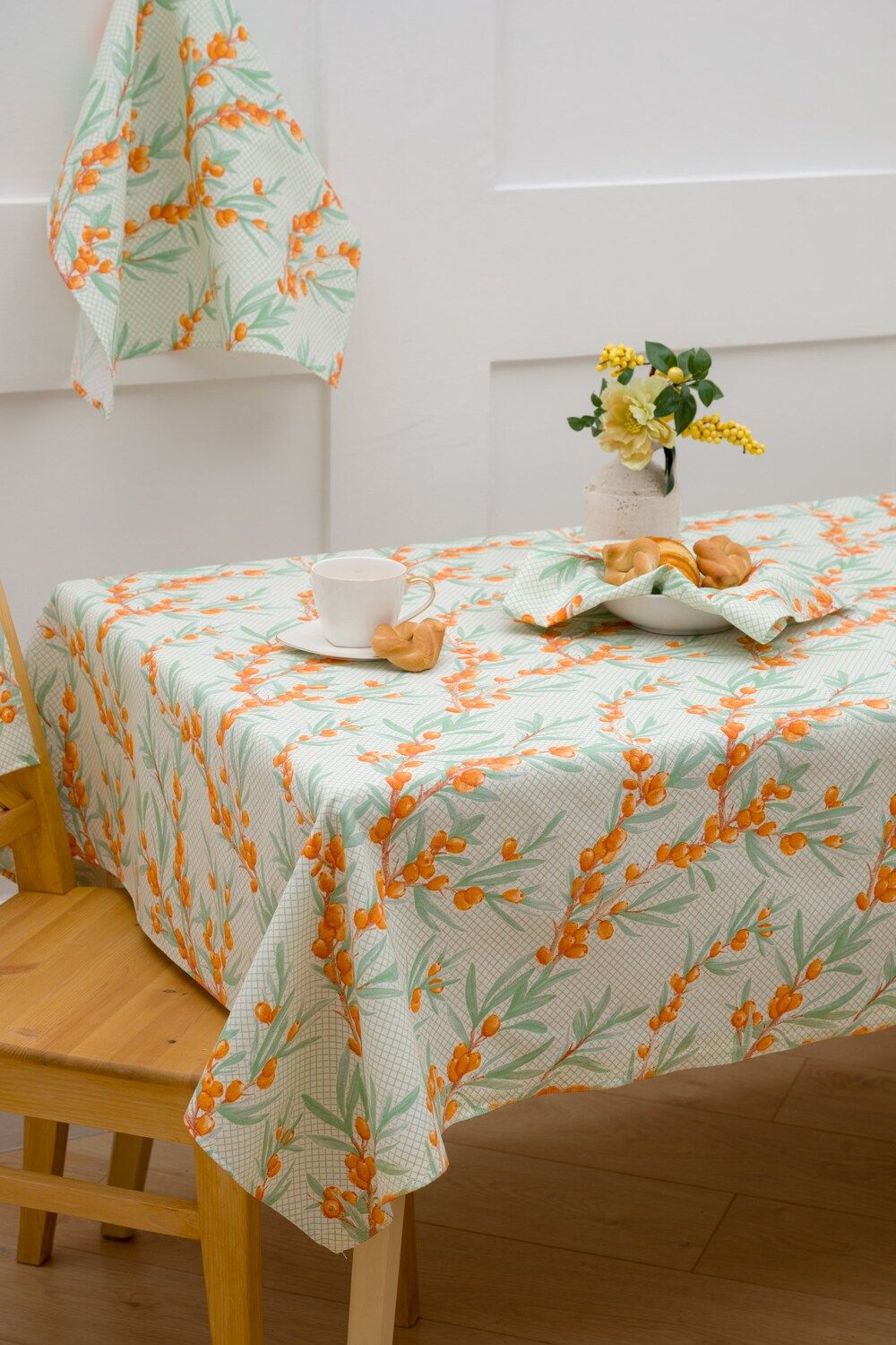 Дополненая веточками облепихи, эта скатерть не только защитит ваш стол, но и добавит нотку природной красоты в вашу кухню. Ее практичность и прочность делают ее идеальным выбором для повседневного использования.