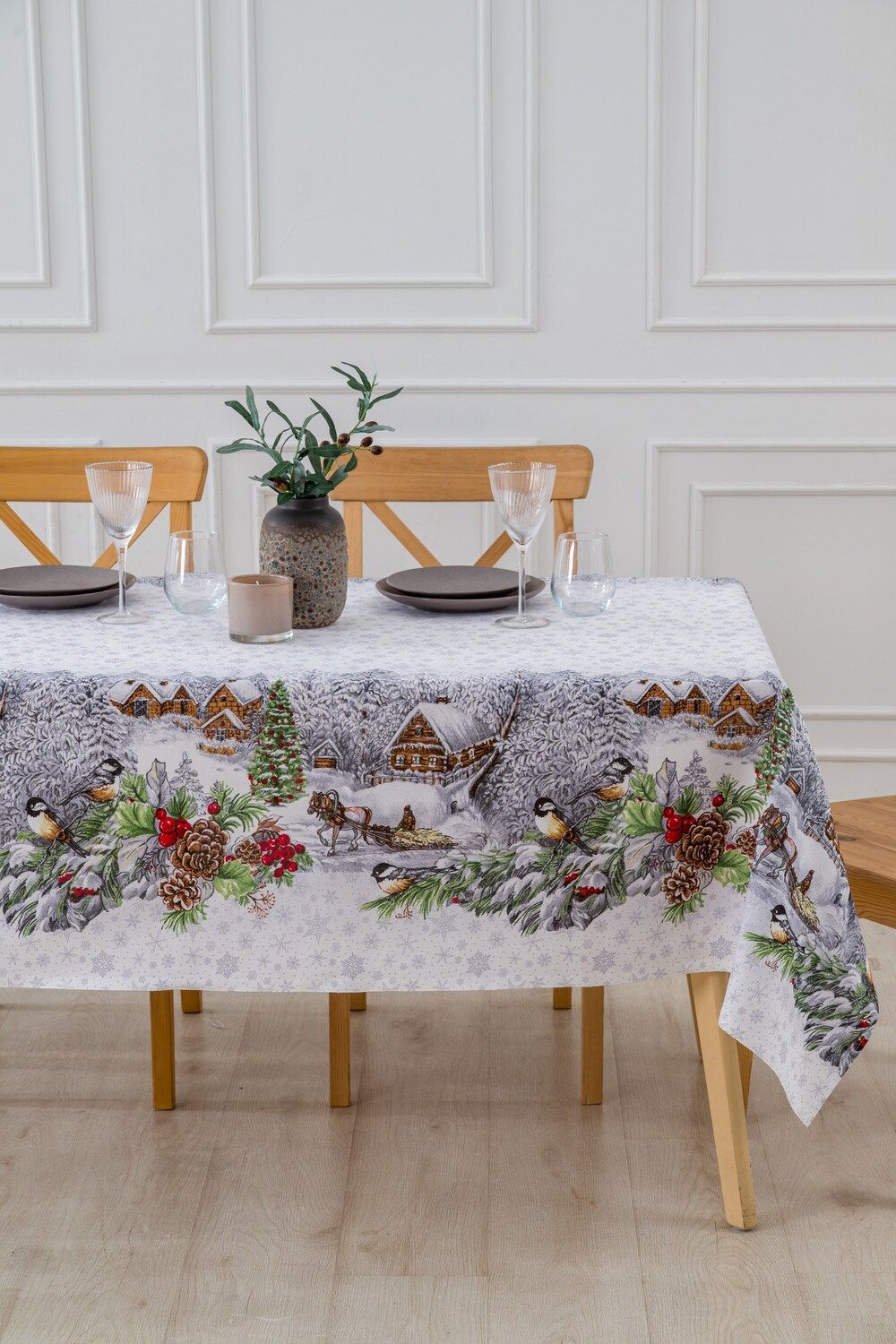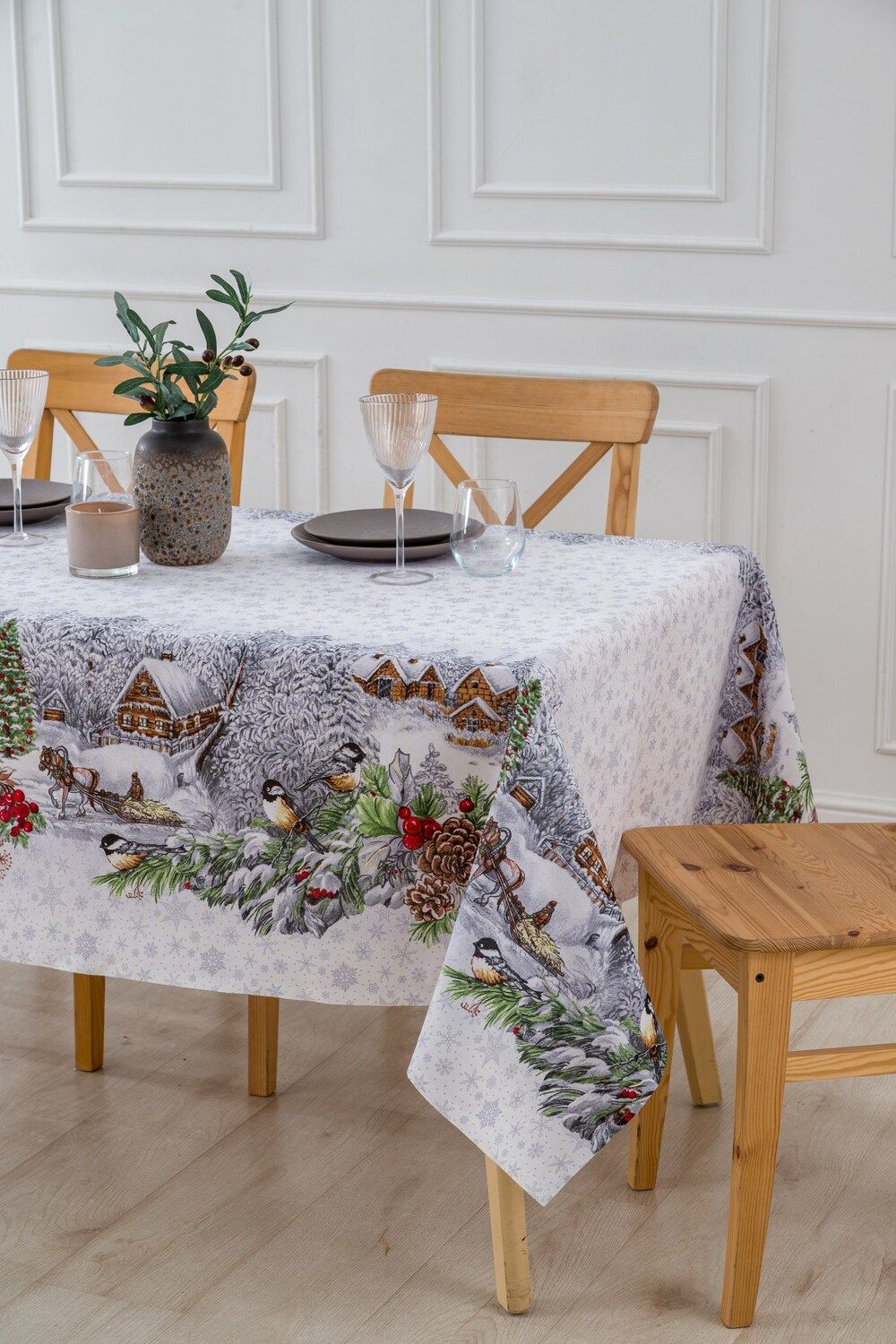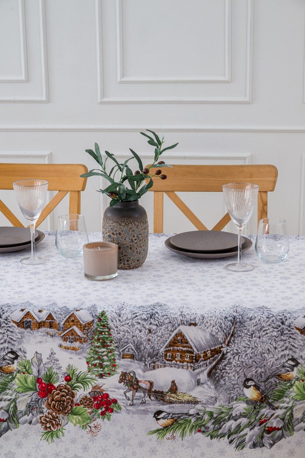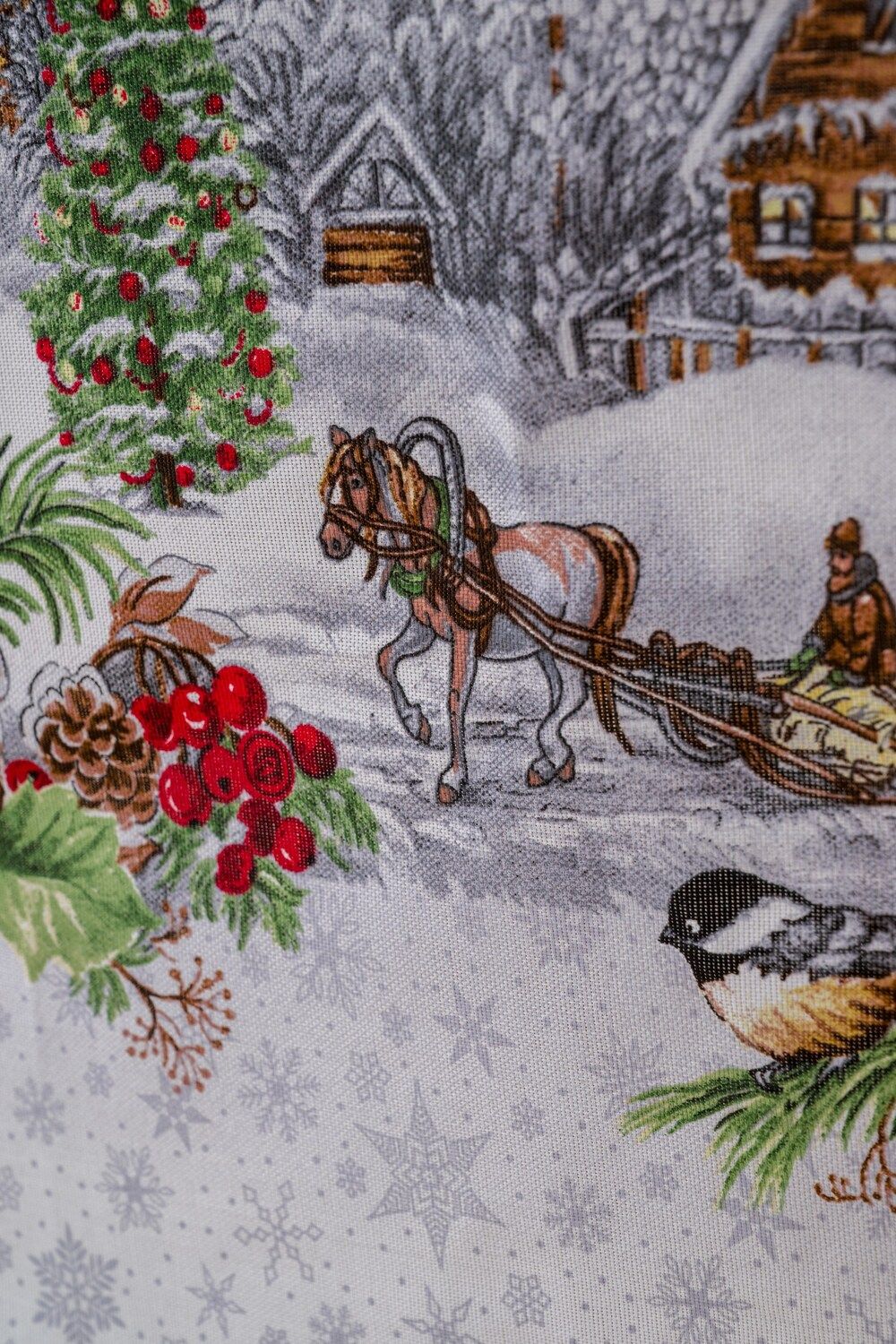 Изысканный дизайн: Белоснежная основа скатерти украшена деликатными серыми снежинками, создающими ощущение легкого морозного узора. В центре композиции – очаровательные изображения лошадок, несущихся по заснеженным полям, и сцены веселых зимних забав. Этот узор пробуждает самые теплые воспоминания о детстве и дарит ощущение праздника.