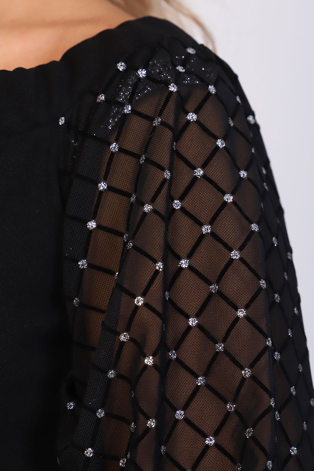 Платье молодежное прямого силуэта, с открытыми плечами, рукав 34 из прозрачной сетки. Платье средней длины сзади шлица.