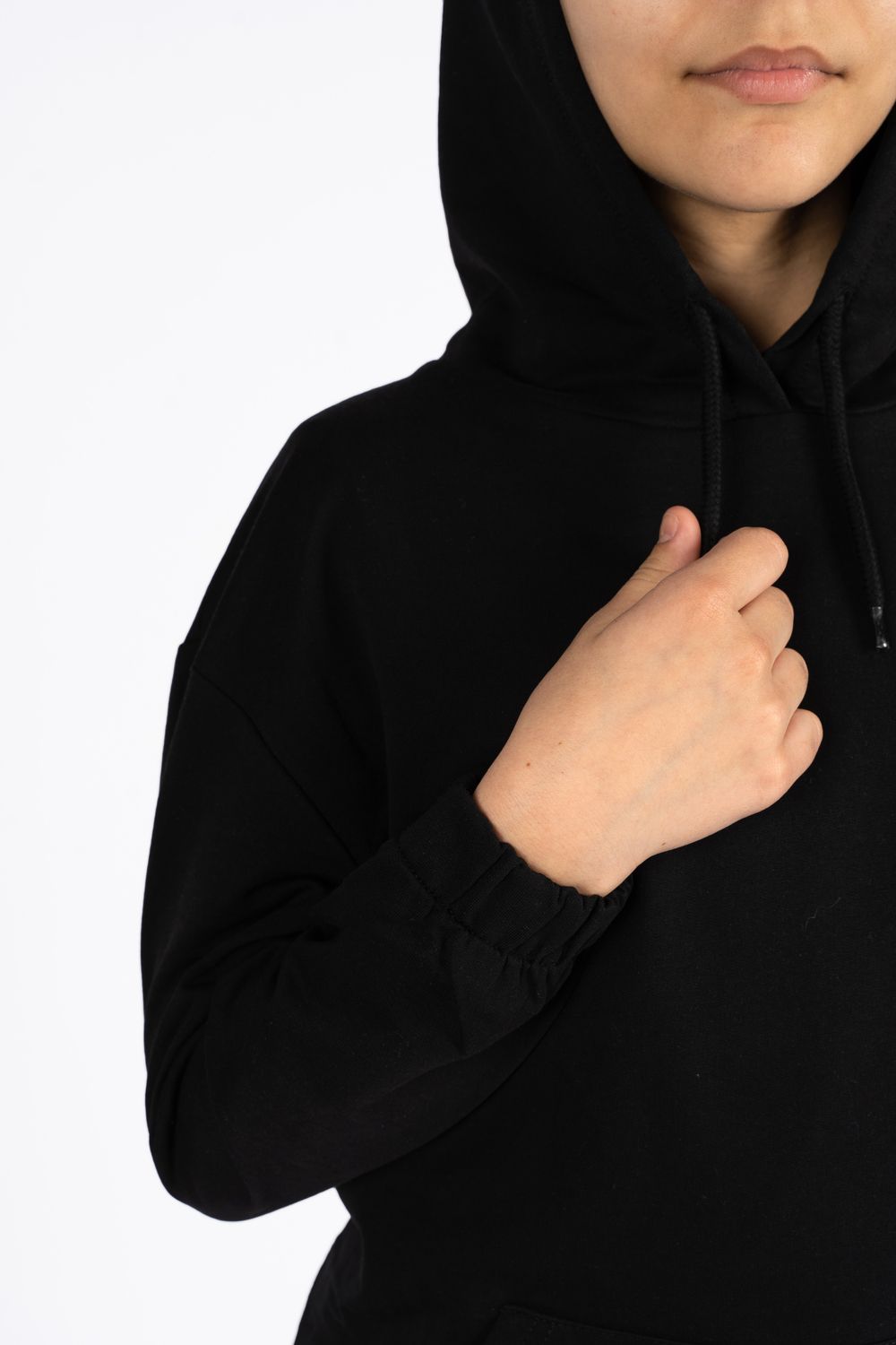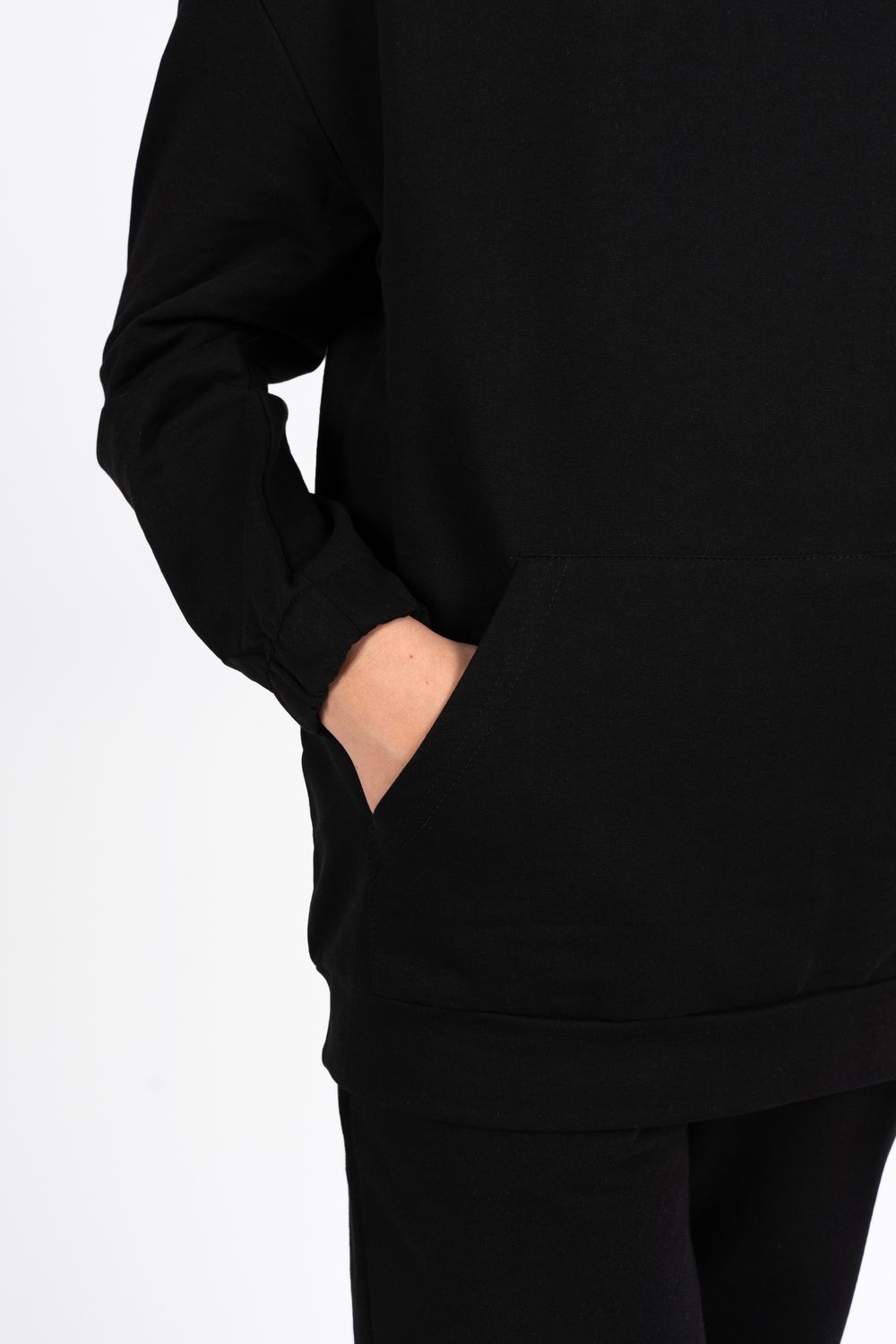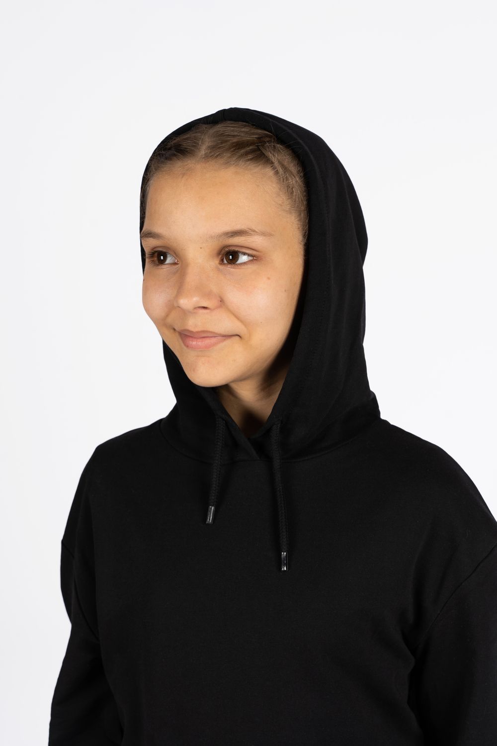 Мягкий хлопковый джемпер - универсальная вещь в гардеробе каждого ребенка. Отлично садится по фигуре и не теряет цвет после многочисленных стирок. Толстовка прямого силуэта со спущенным длинным рукавом. Горловина круглая с капюшоном. Капюшон состоит из 2 половин. Горловина спинки внутри обработана настрочной планкой из киперной ленты. С изнанки капюшона выполнен подклад из кулирки. По переднему срезу капюшона для утяжки вставлен утягивающий круглый канатный шнурок. Для выхода шнурка предусмотрены пробивные петли. Рукав заканчивается манжетой из основного полотна. По низу изделия пояс из основного полотна. На полочке расположен карман кенгуру.
