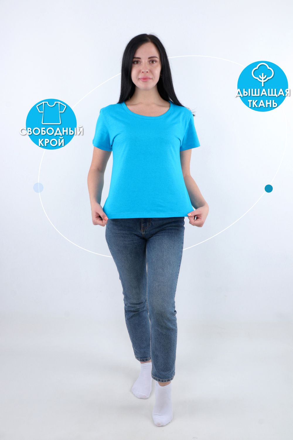 Женская базовая однотонная футболка из 100% натурального хлопка. Универсальная модель свободного покроя с короткими рукавами и округлым вырезом горловины прекрасно смотрится с джинсами, брюками и юбкой, ее можно надеть в офис под кардиган или пиджак.