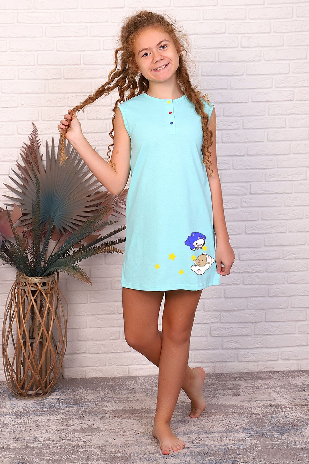 Сорочка детская без рукавов. Данная модель выполнена из трикотажного полотна кулирка (хлопок 100%). На полочке присутствует принт и планка с кнопками. Горловина и пройма обработана окантовкой из основной ткани.