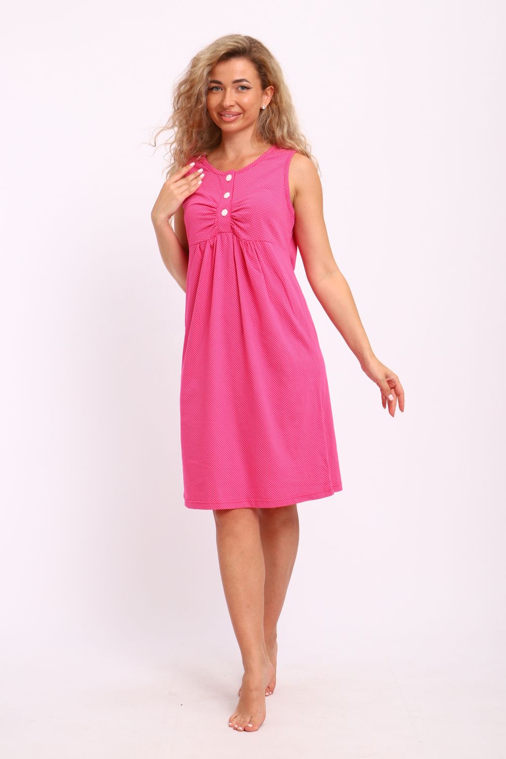 Женская сорочка без рукавов. Данная модель выполнена из трикотажного полотна кулирка (хлопок 100%). Полочка отрезная под грудью, шов фигурный. Верхняя часть полочки (лиф) имеет сборку по центру груди и планку на пуговках. Верх нижней части полочки по центру также со сборкой. Горловина и пройма изделия обработаны окантовкой из основной ткани. Отлично подходит для беременных и кормящих мам.