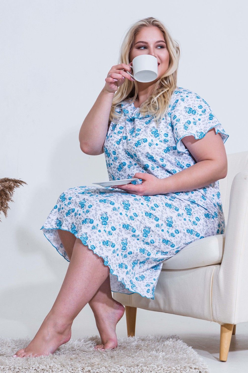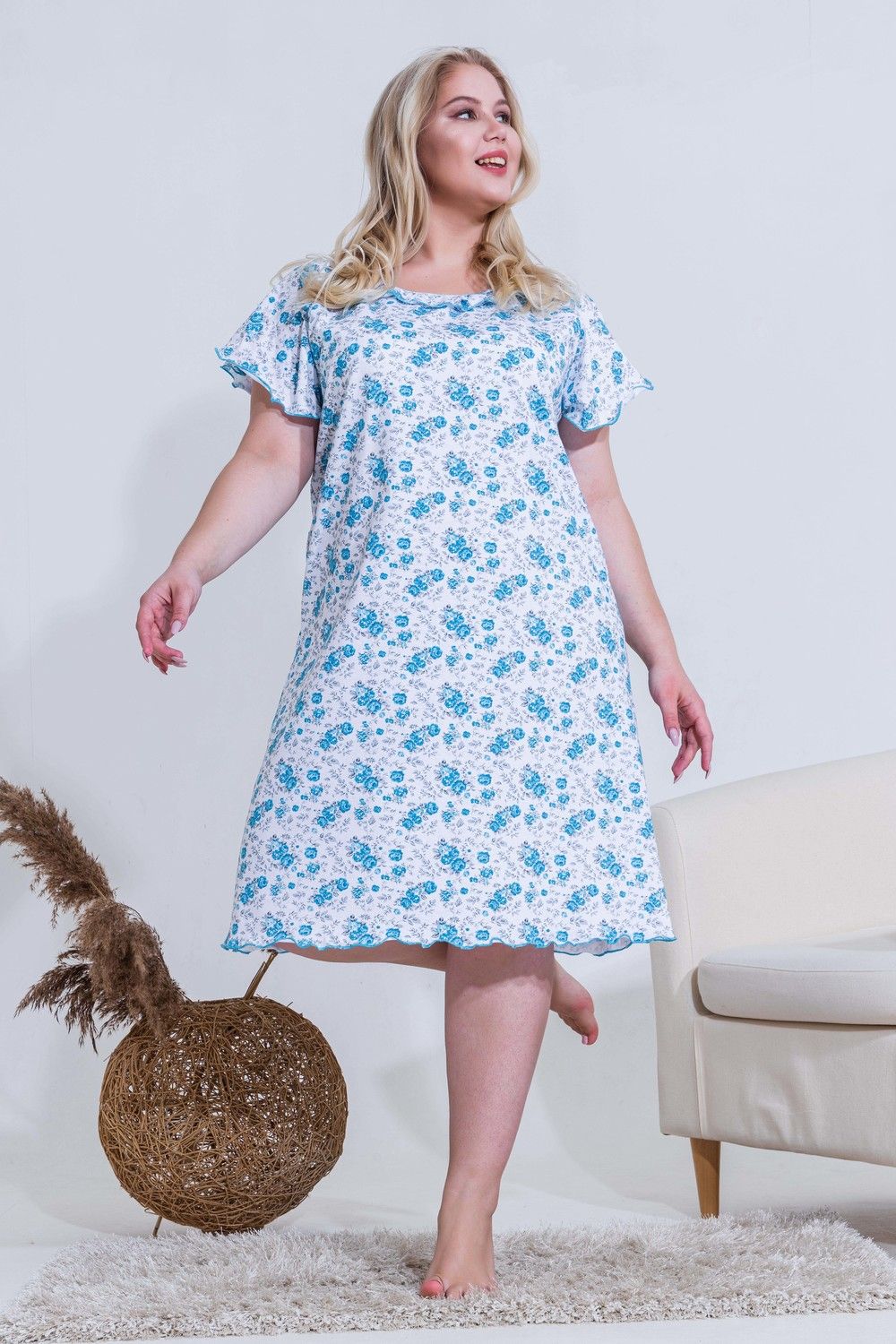 Сорочка женская с симпатичной рюшей по горловине. Очень свободный и удобный крой. Рукав-реглан не стесняет движения рук. Обработка рукава и низа изделия в виде лёгкой волны придаёт лёгкость и воздушность.