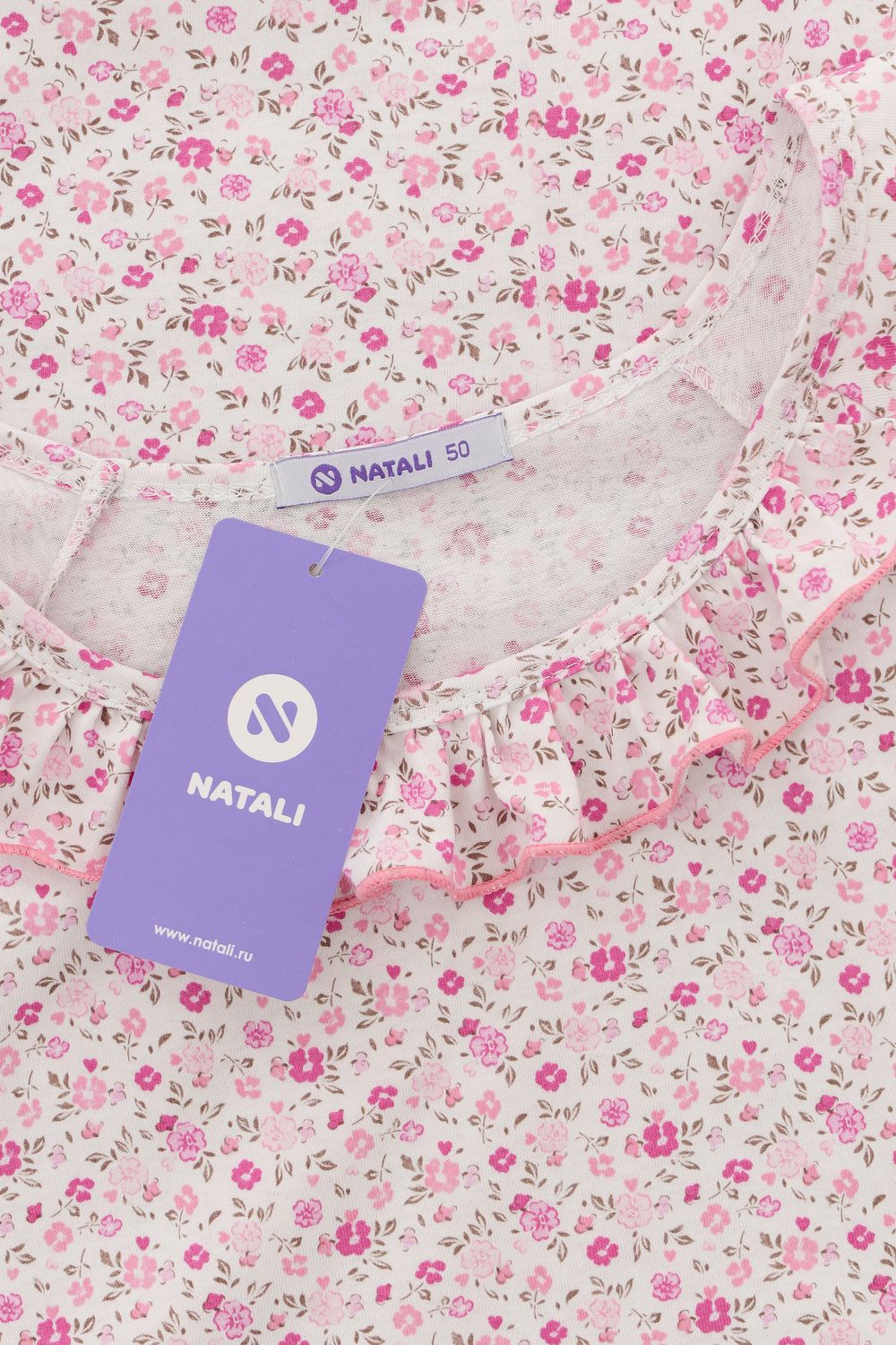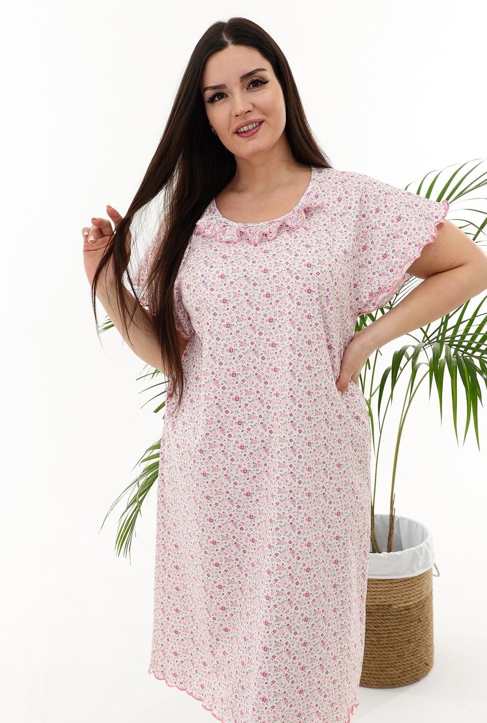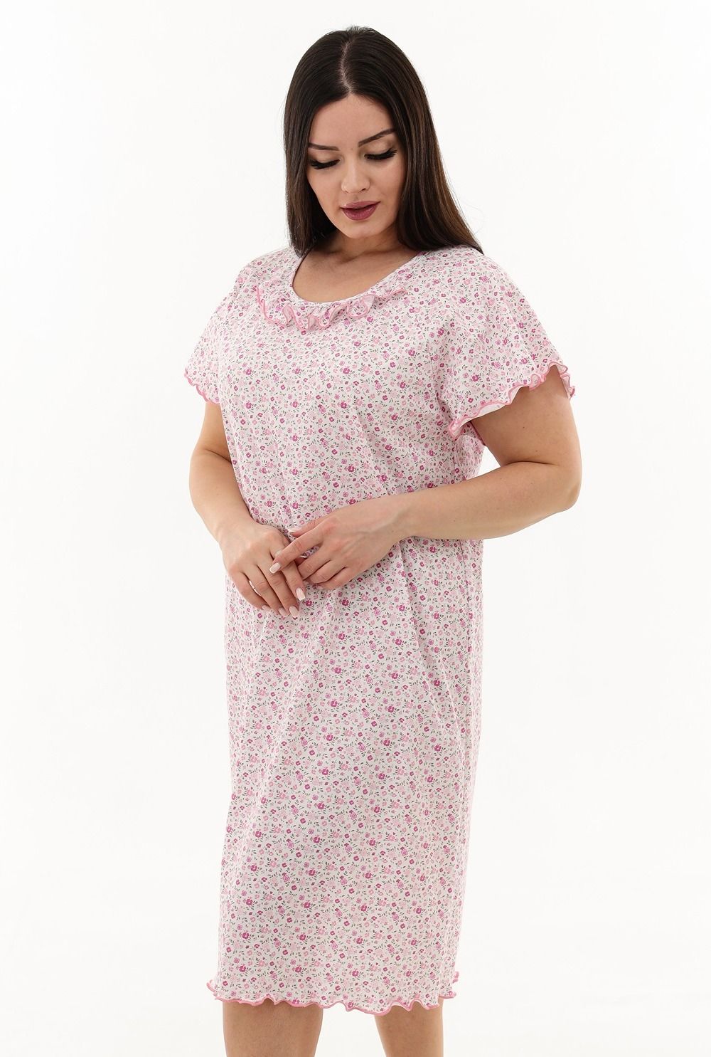 Сорочка женская с симпатичной рюшей по горловине. Очень свободный и удобный крой. Рукав-реглан не стесняет движения рук. Обработка рукава и низа изделия в виде лёгкой волны придаёт лёгкость и воздушность.