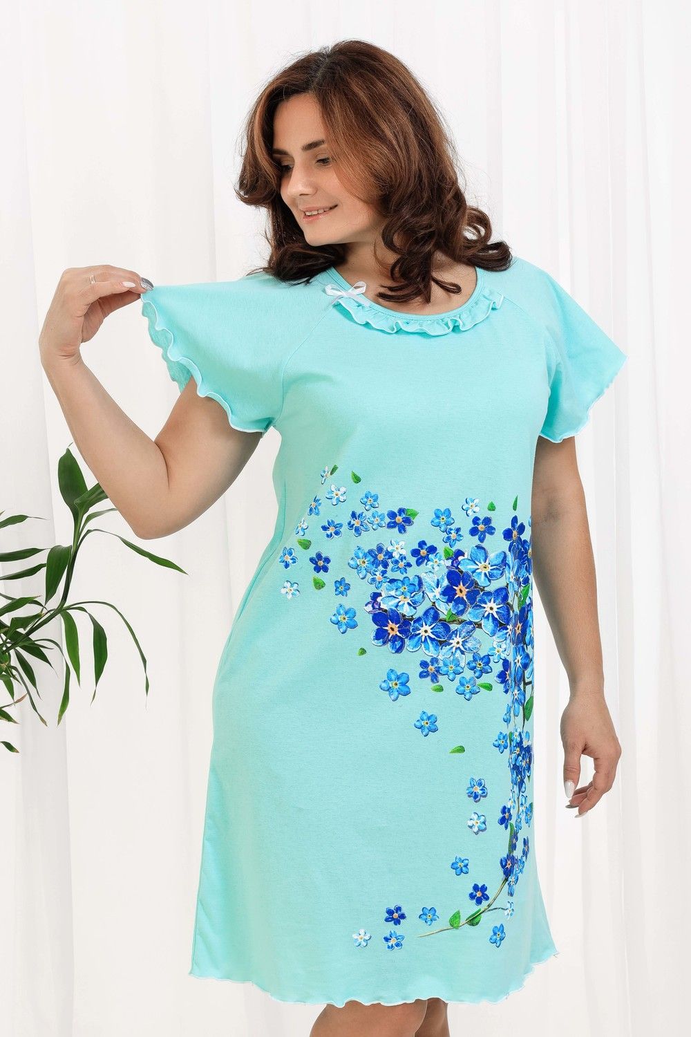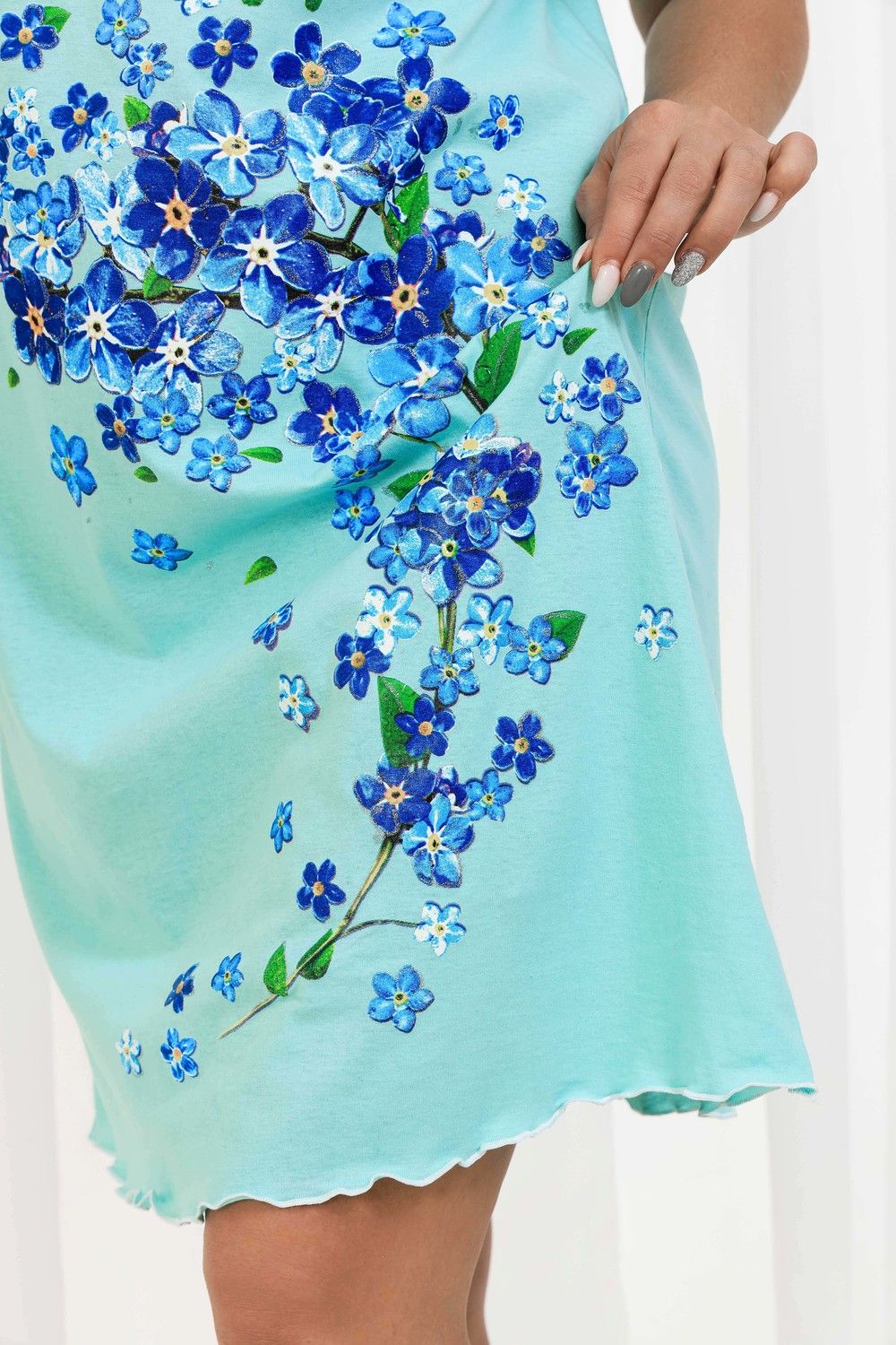 Сорочка женская с симпатичной рюшей по горловине. Очень свободный и удобный крой. Рукав - реглан не стесняет движения рук. Обработка рукава и низа изделия в виде лёгкой волны придаёт лёгкость и воздушность. Шикарный принт в виде россыпи незабудок. Оттенок ментола может отличаться от фото