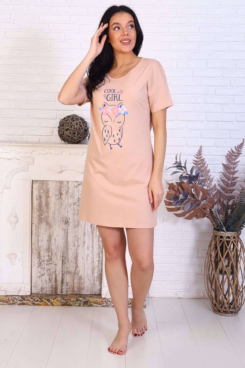 Сорочка женская из кулирного полотна, прямой силуэт, горловина круглая, спущенное плечо, рукав короткий, на полочке принт.