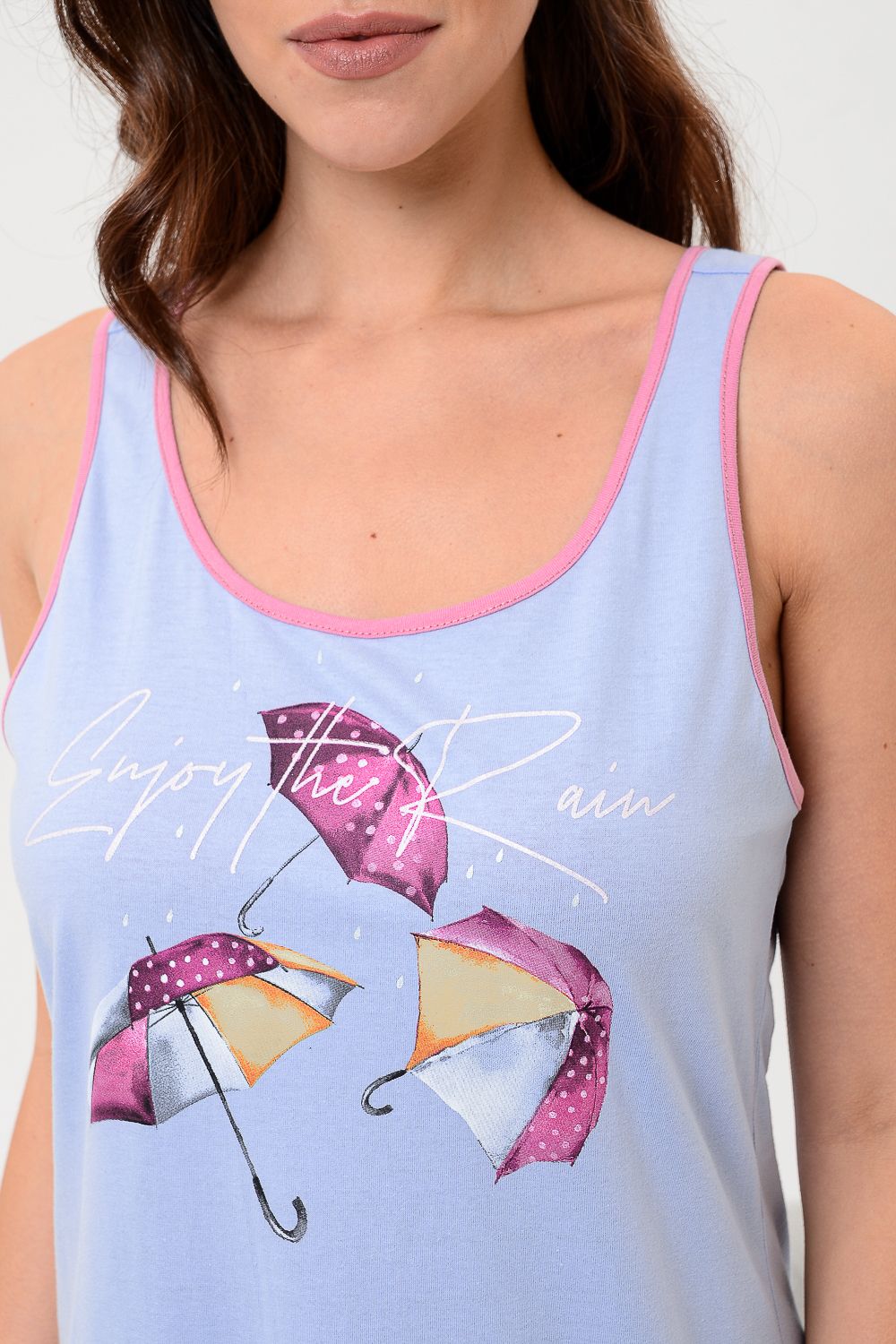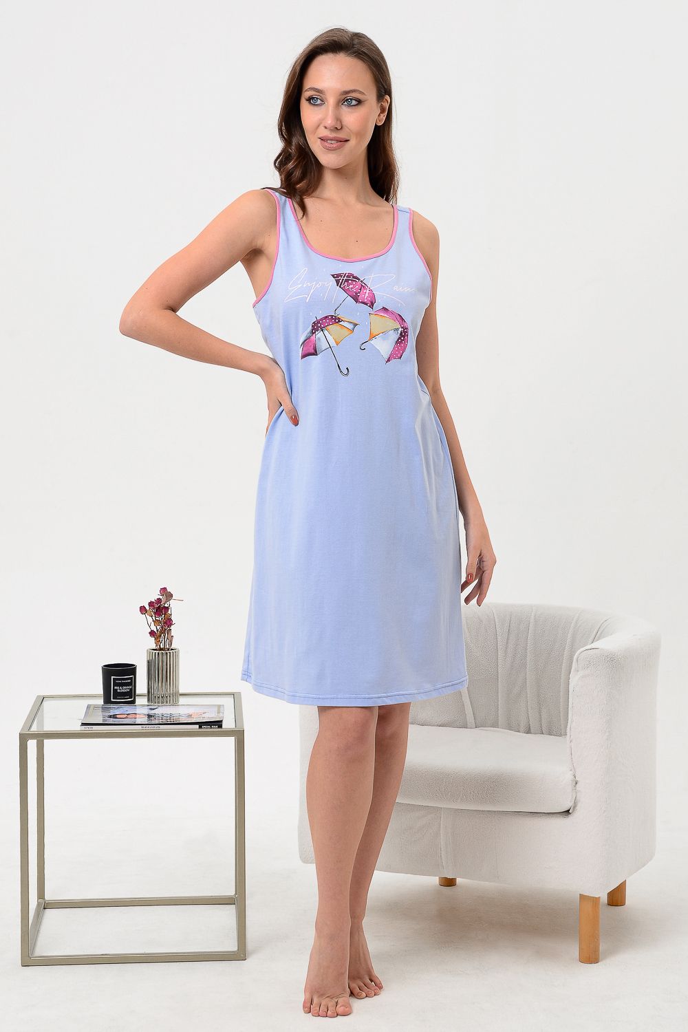 Сорочка из кулирного полотна 100% хлопок. Вырез горловины круглый, спина открытая на бретелях, низ подогнут на плоскошовной машине, на полочке принт. Сорочка удобна для сна, ваше тело будет дышать за счет натурального состава ткани. Легкая в уходе.