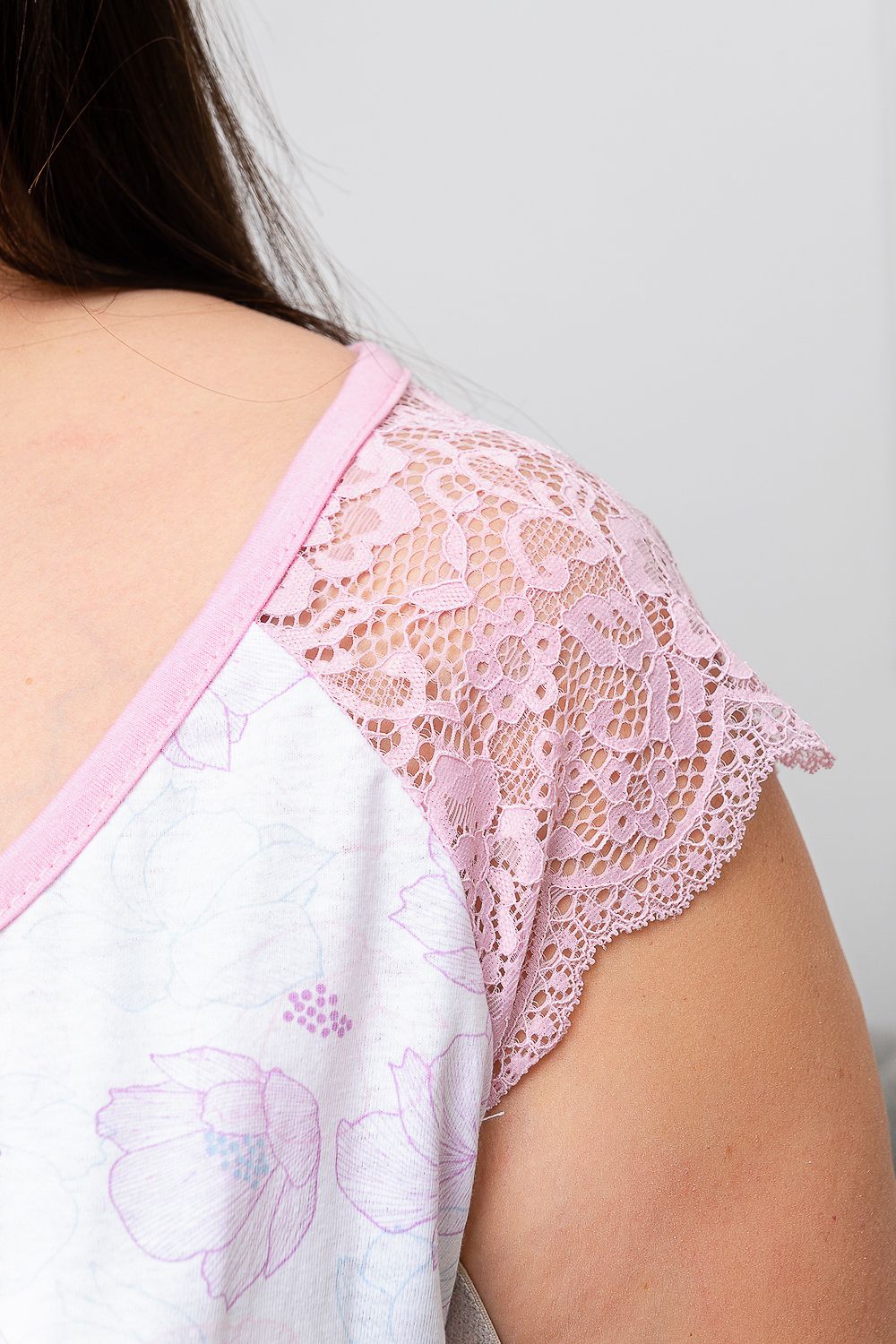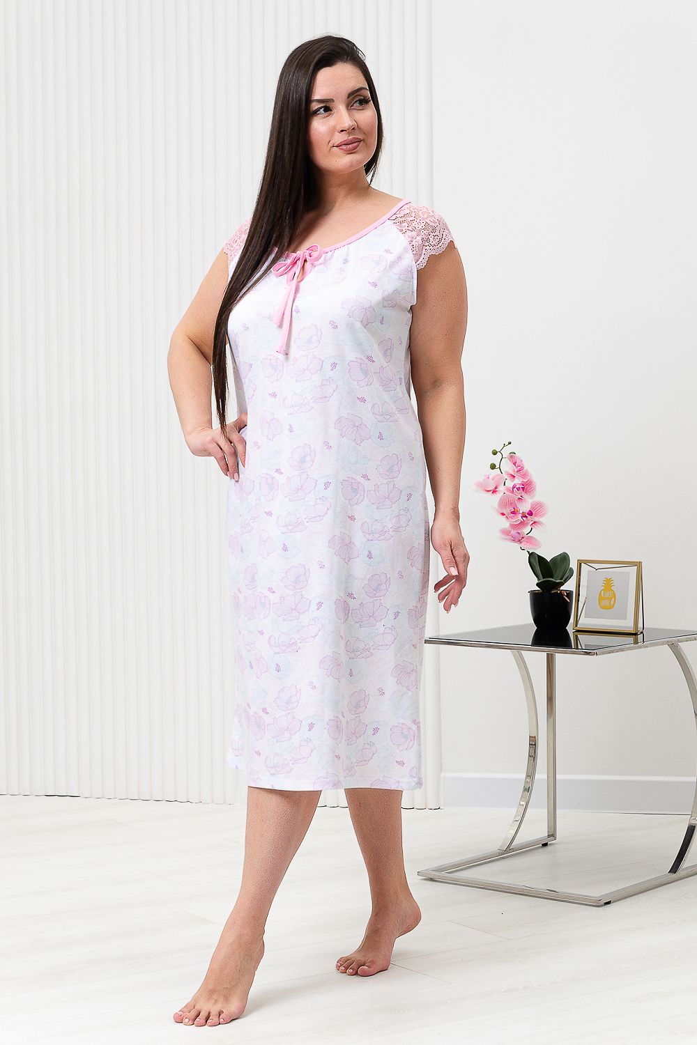 Сорочка женская с кружевом, 100% хлопок. Сорочка свободного кроя, горловина обработана окантовкой, переходящей в декоративную капельку на завязках, рукава реглан из кружева, низ сорочки обработан на плоскошовной машине. Легкая в уходе.