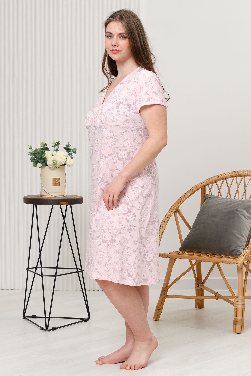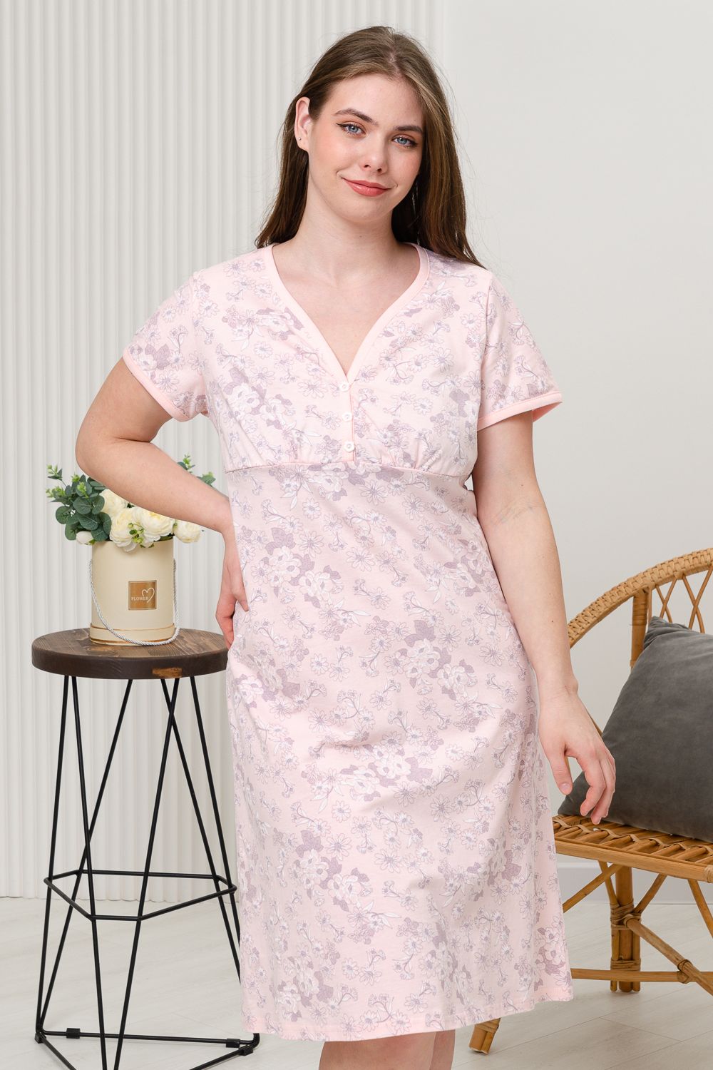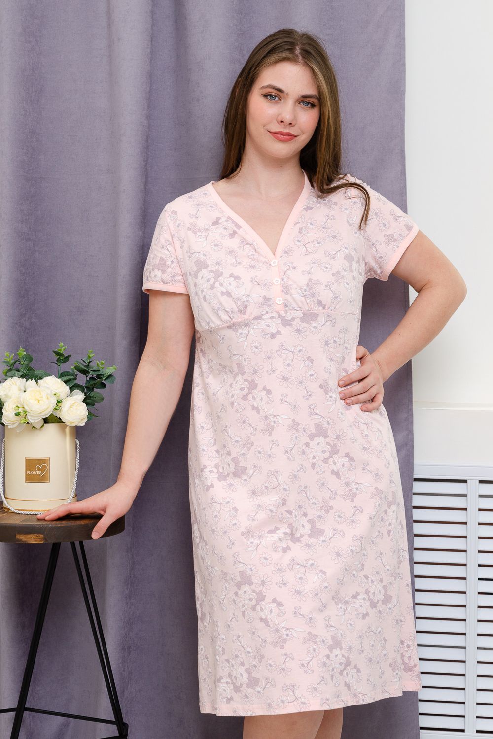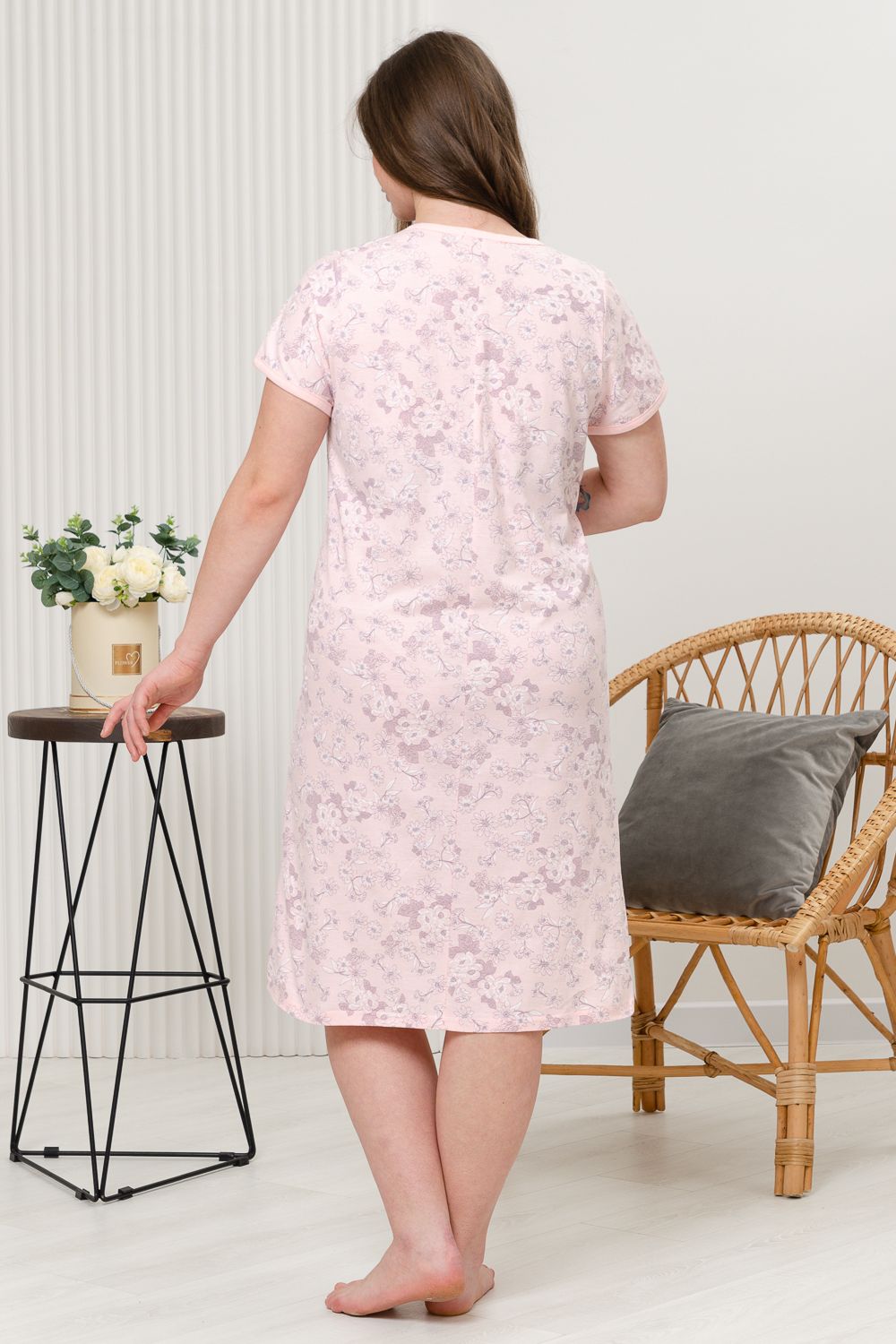 Сорочка женская из кулирного полотна, 100% хлопок. На полочке разрезная кокетка, горловина обработана окантовкой, на планке декоративные пуговицы, низ рукавов окантован, низ изделия обработан на плоскошовной машине. Сорочка удобна и комфортна для сна. Легкая в уходе.