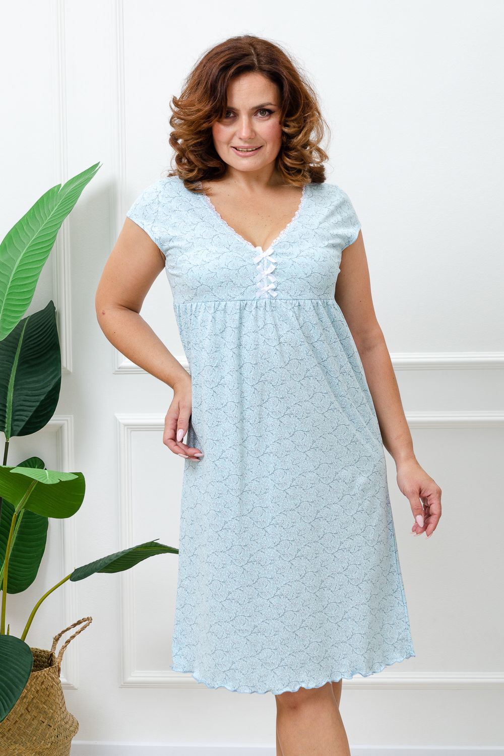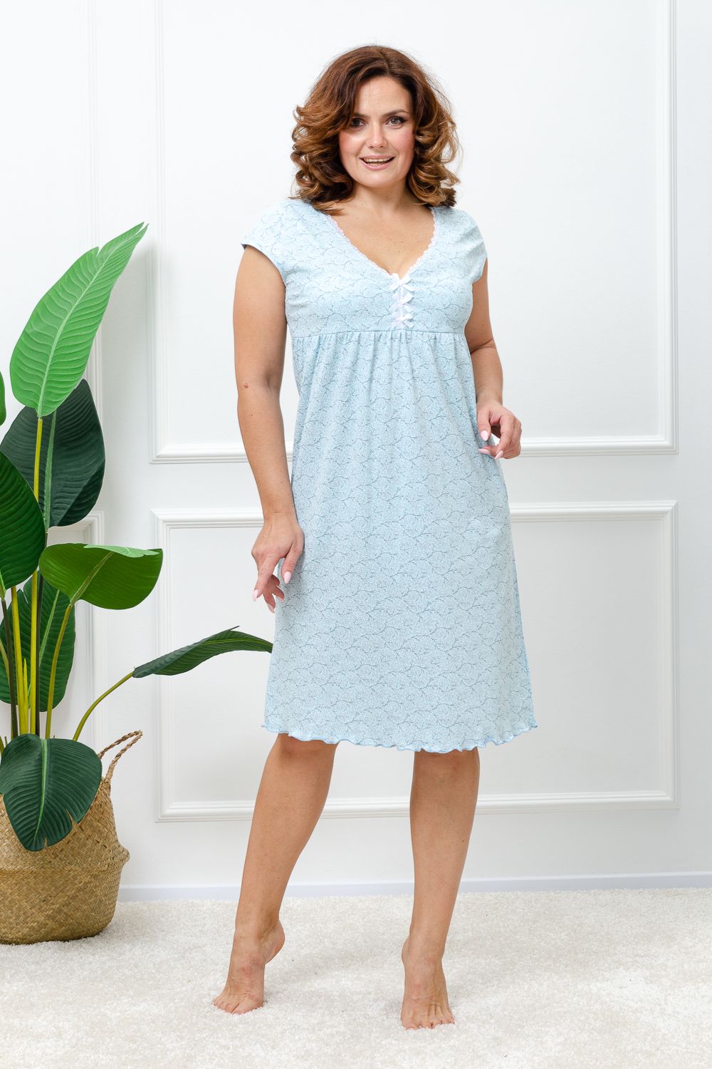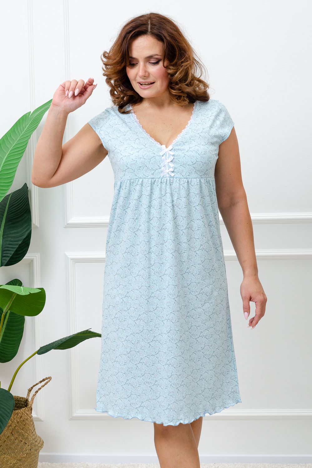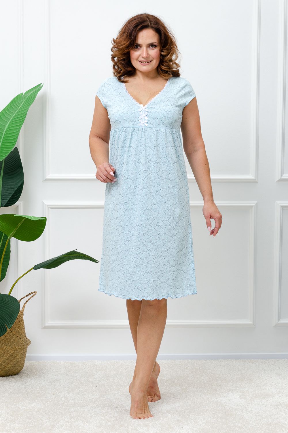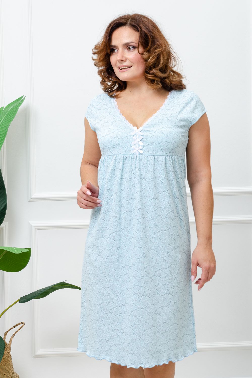 Сорочка женская из кулирного полотна, состав 100% хлопок. Горловина сорочки с отделкой из кружева, рукава обработаны окантовкой, низ сорочки обработан декоративной строчкой. Легкая в уходе.