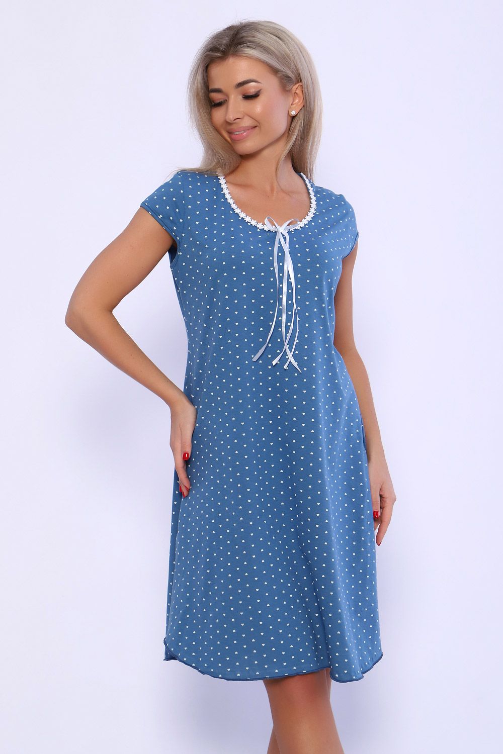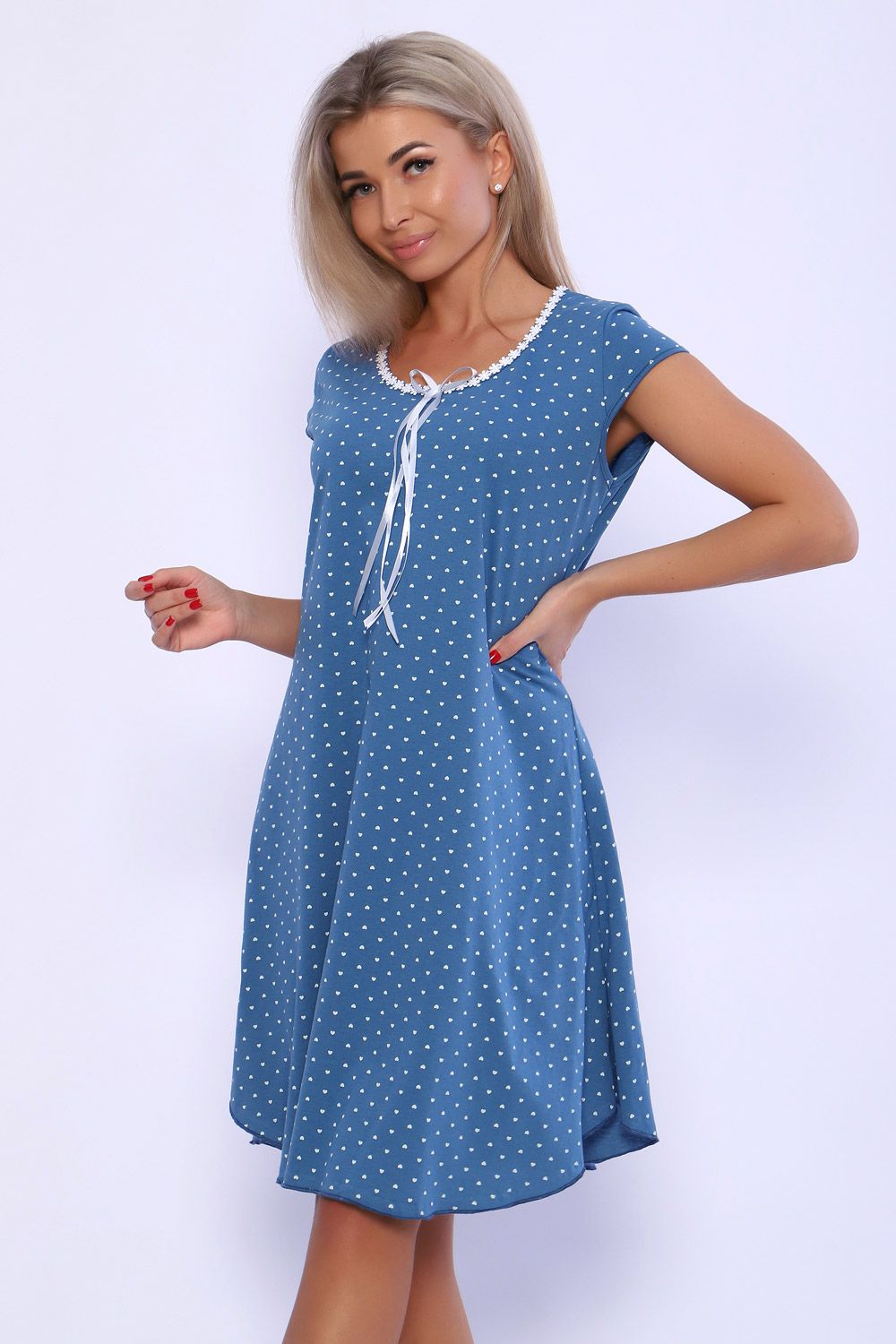 Сорочка из хлопковой трикотажной кулирки. Силуэт расклёшенный, горловина украшена шитьем из белых ромашек и двойным атласным бантиком, рукавчики - короткие.