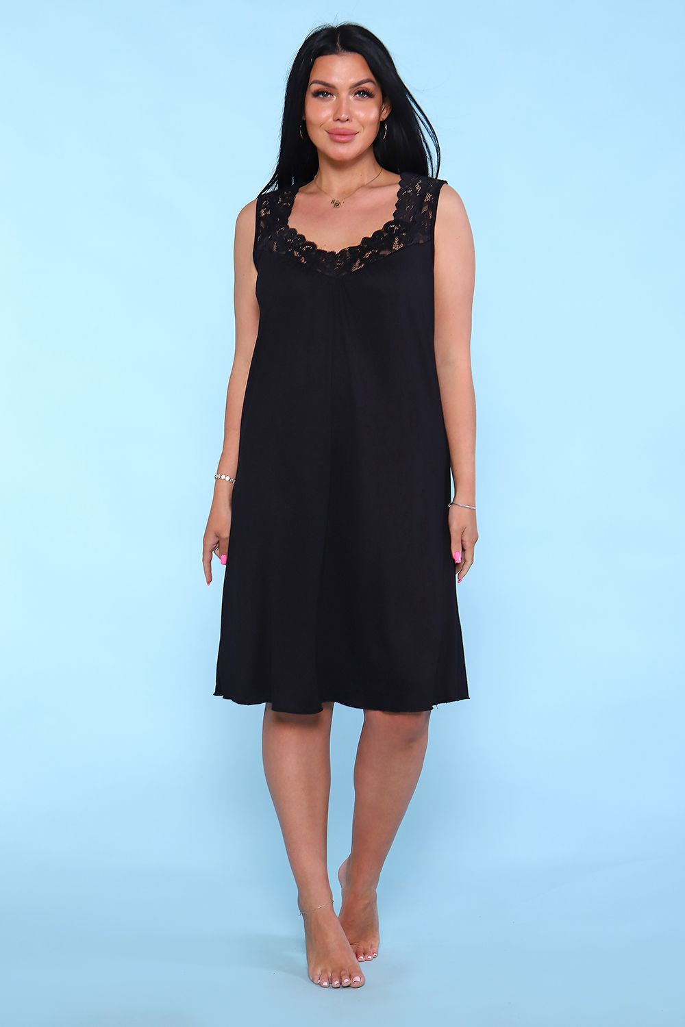 Женская сорочка из вискозы, декорированная кружевом по периметру выреза и с обработкой нитками в тон кружева по низу. От выреза небольшая сборка. Цвет кружева может отличаться